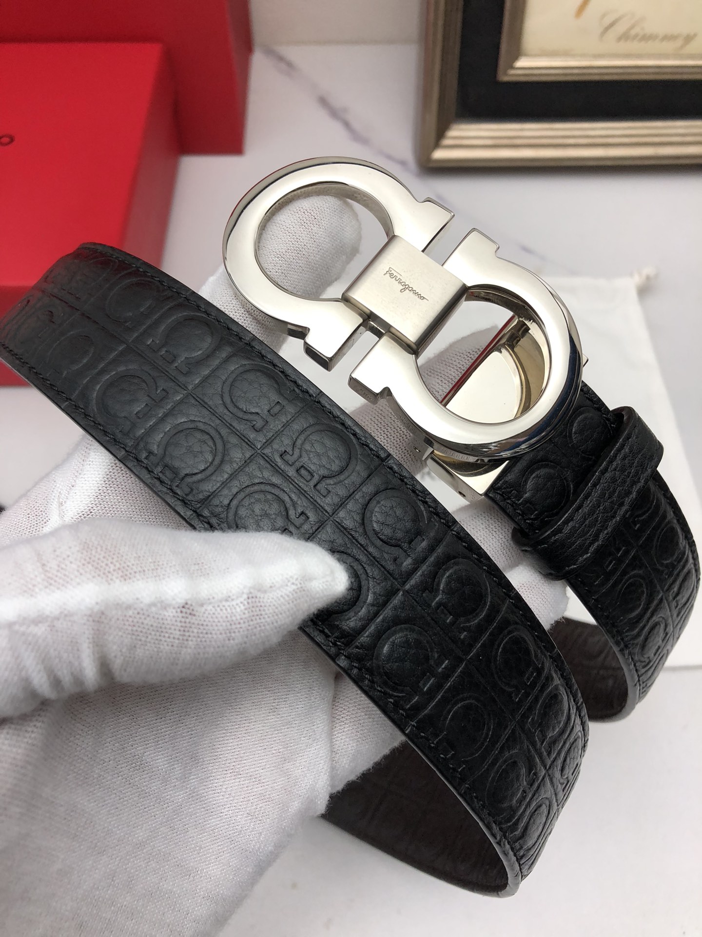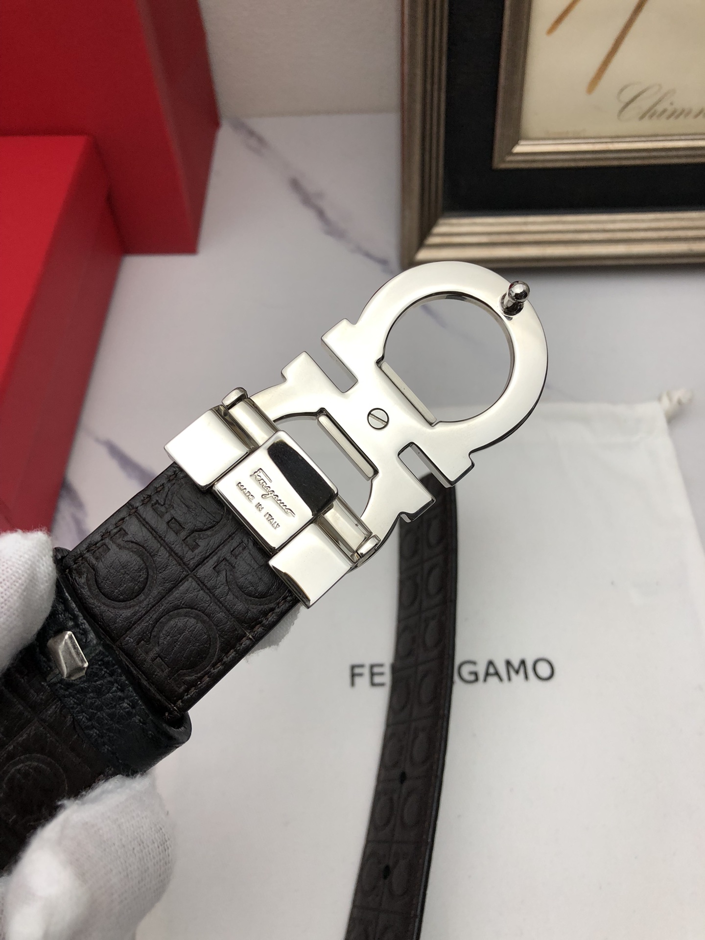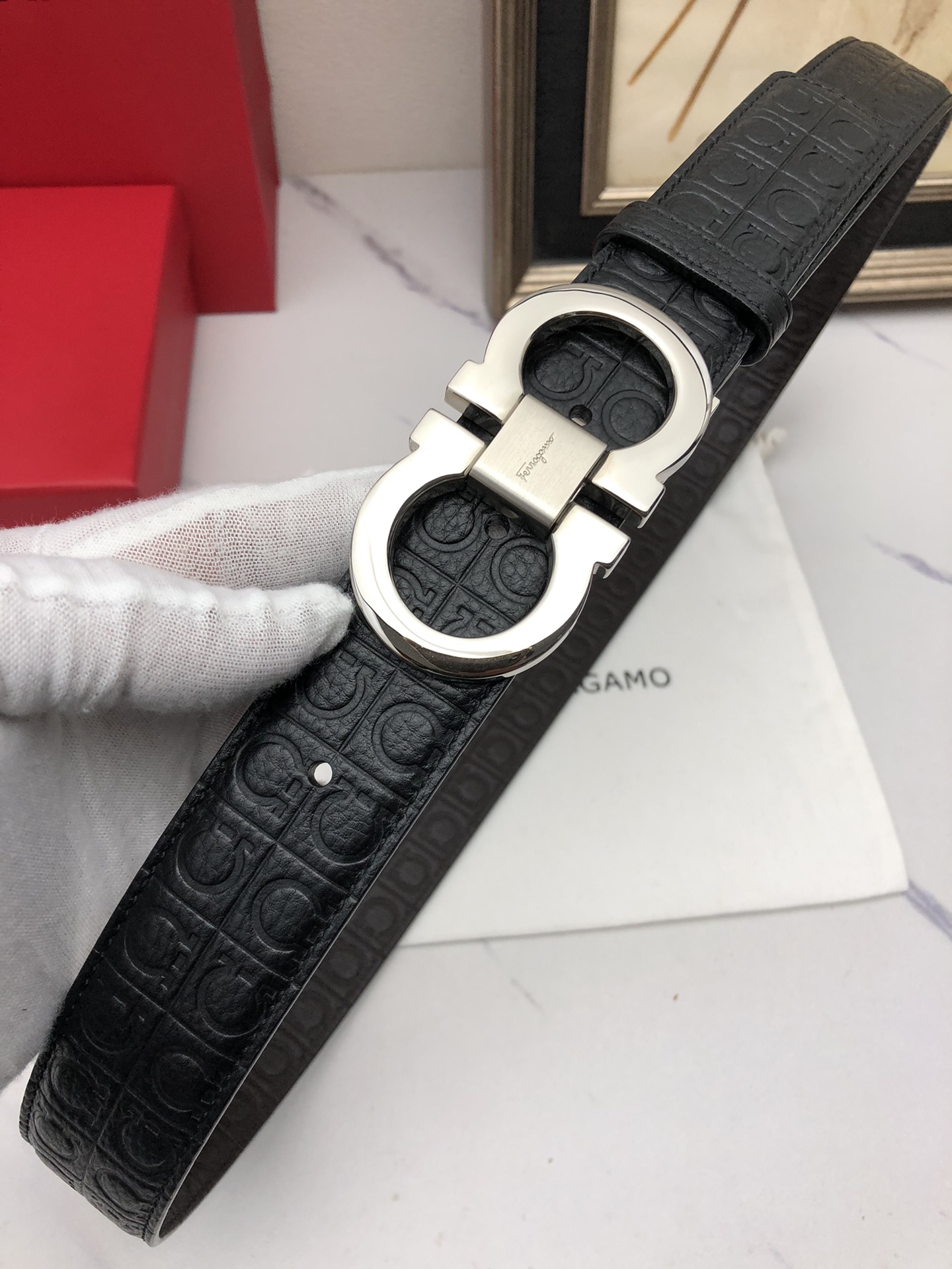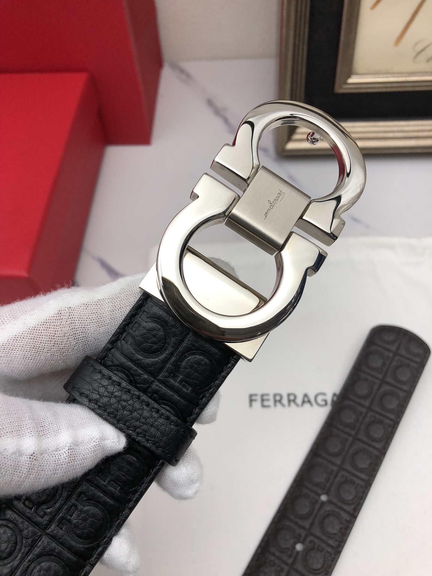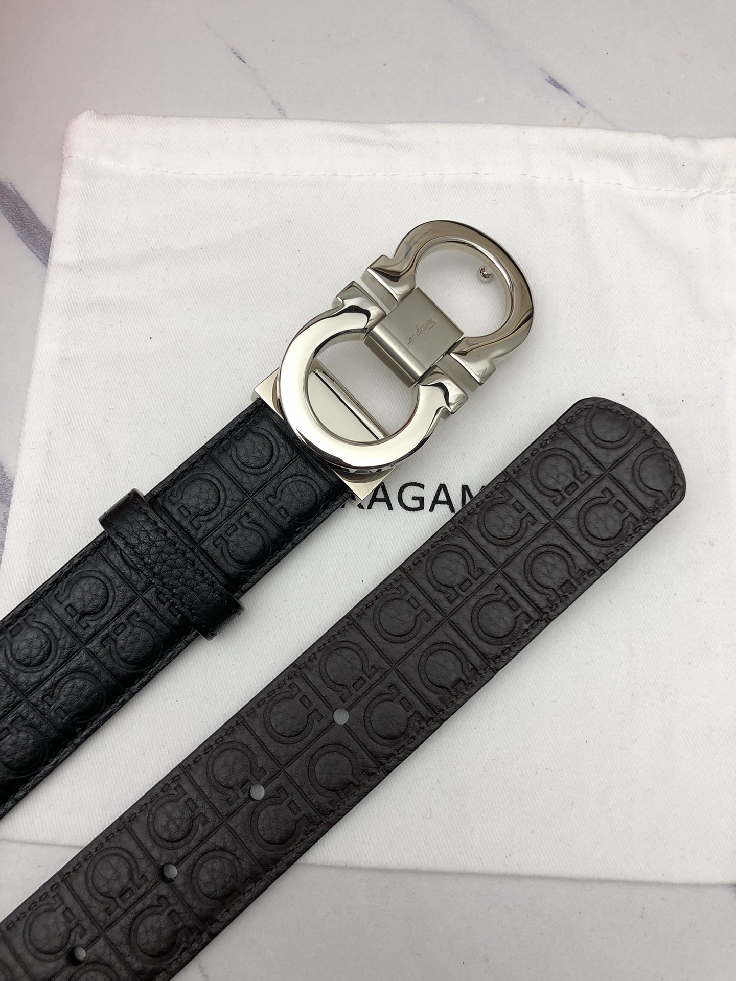 这款皮带是AAAAA 1:1 质量 (非常棒). 使用了和原版一模一样的材料. 商标部分也保持了和菲拉格慕/Salvatore Ferragamo一样. 图片拍摄是实物皮带拍摄, 您所收到的实物保证和我们图片一模一样.