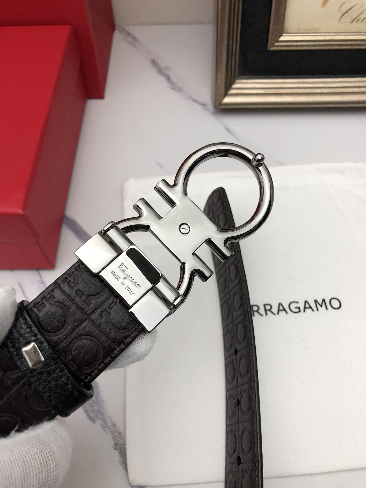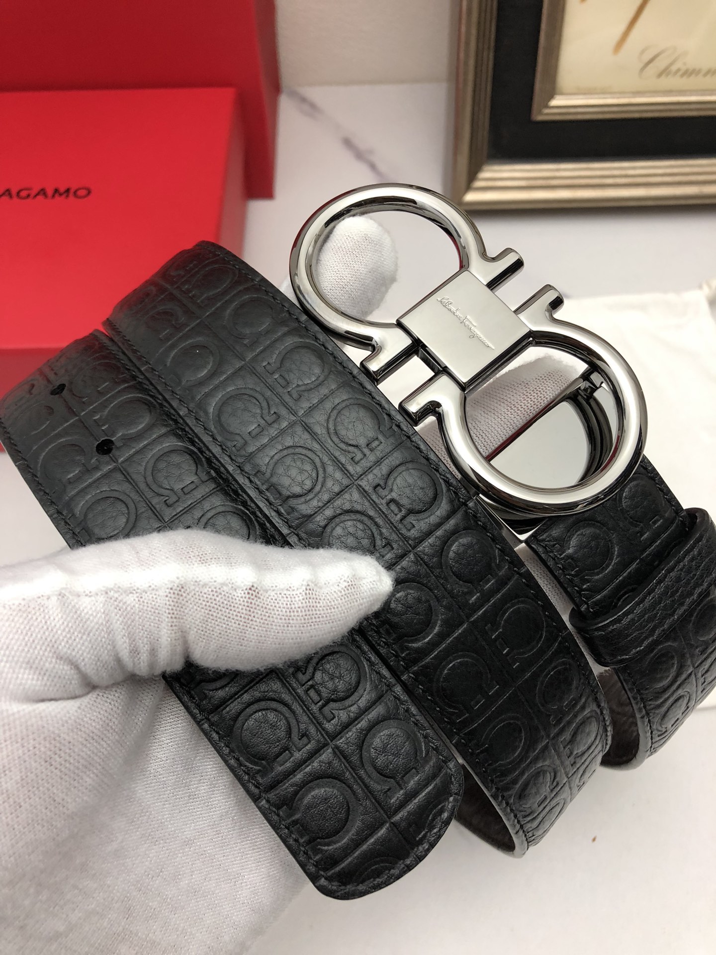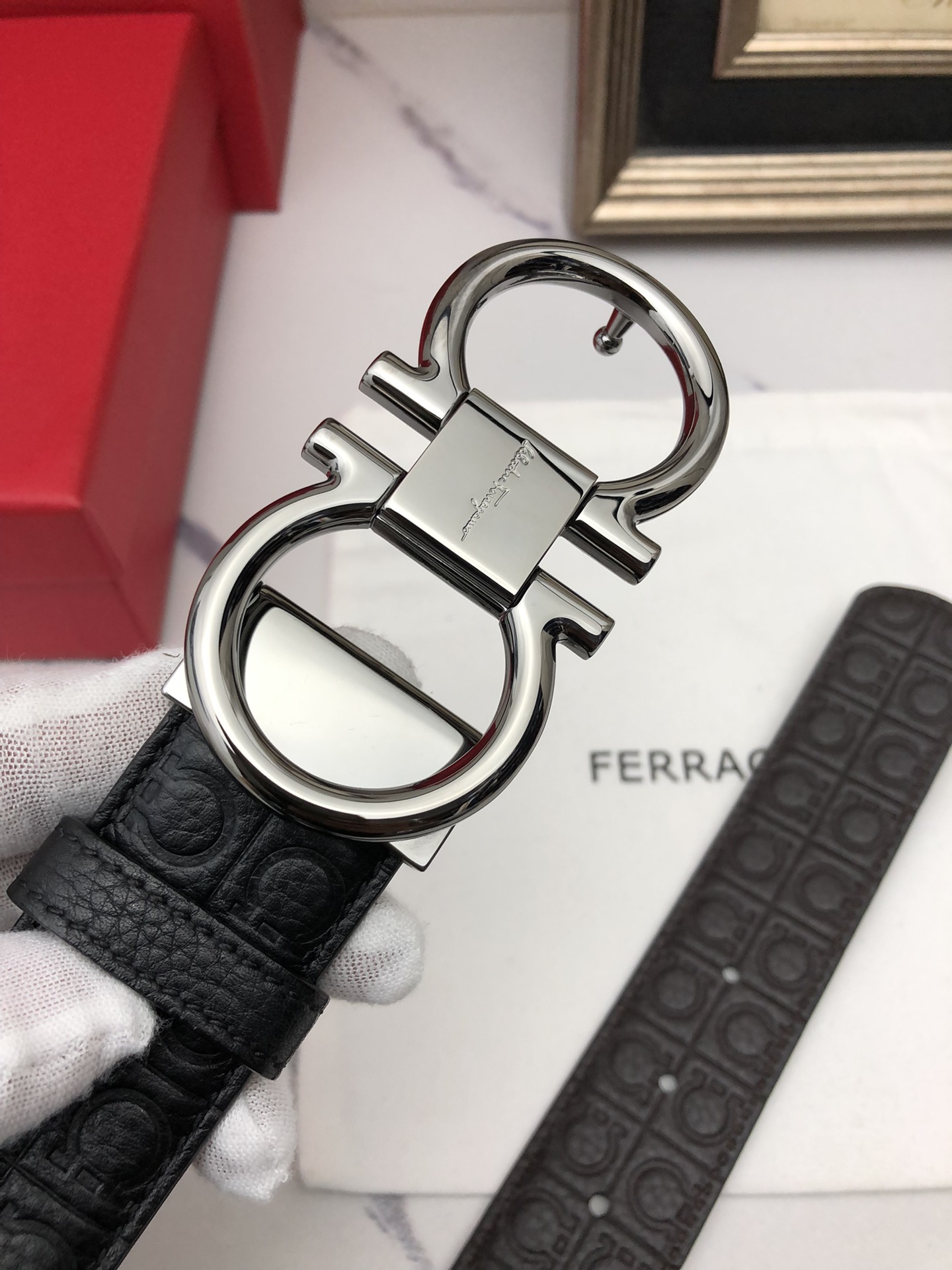 这款皮带是AAAAA 1:1 质量 (非常棒). 使用了和原版一模一样的材料. 商标部分也保持了和菲拉格慕/Salvatore Ferragamo一样. 图片拍摄是实物皮带拍摄, 您所收到的实物保证和我们图片一模一样.