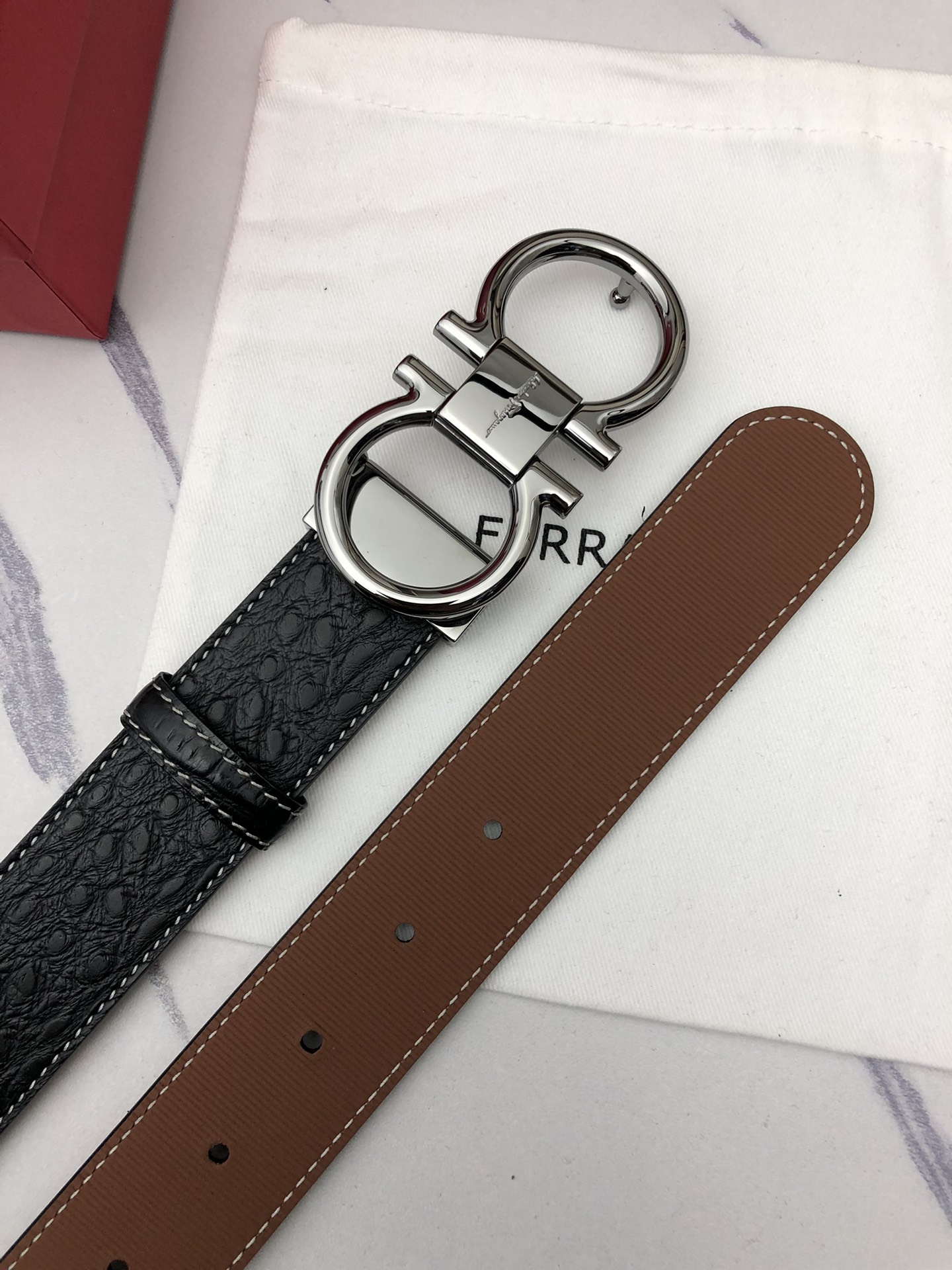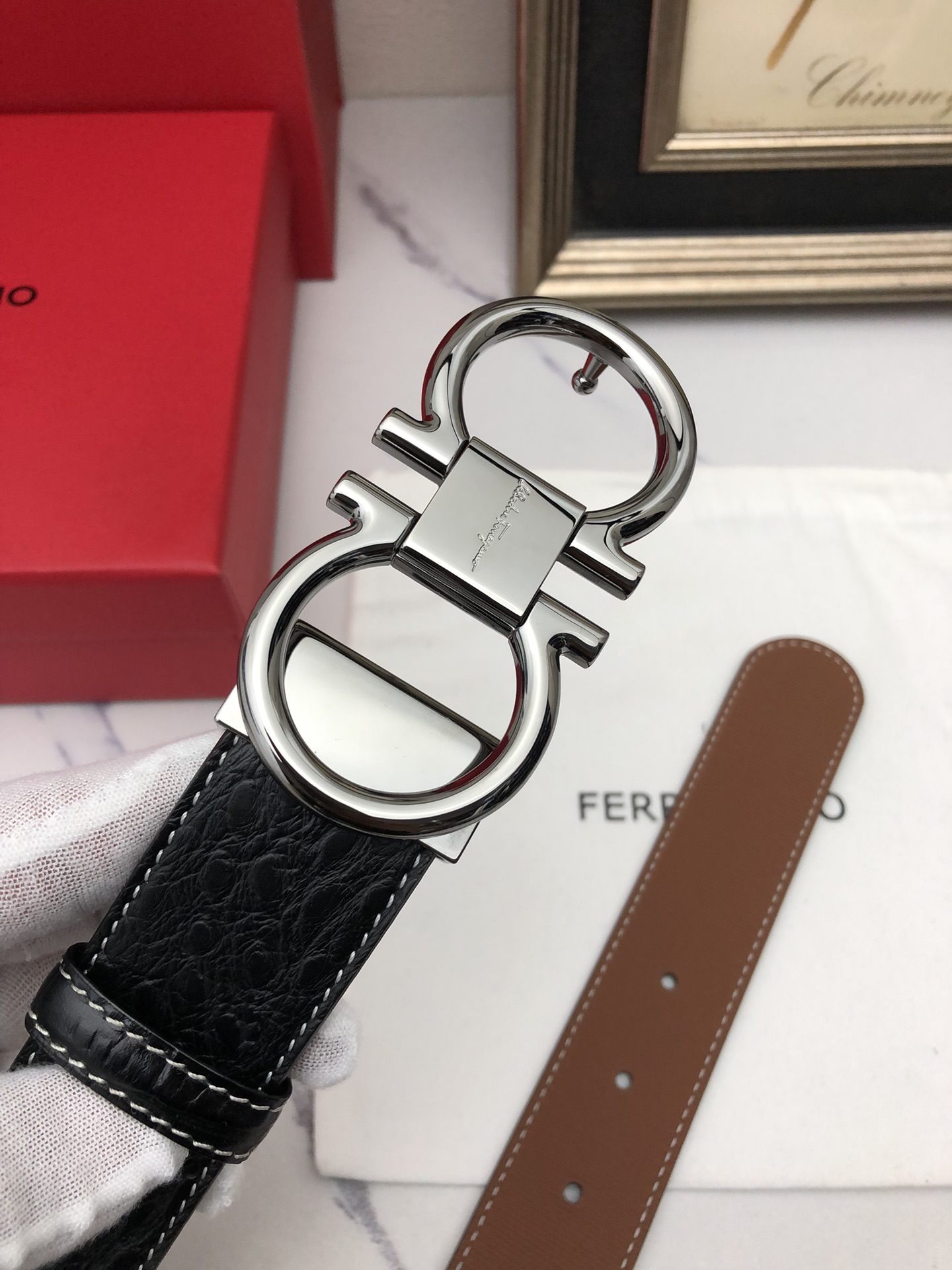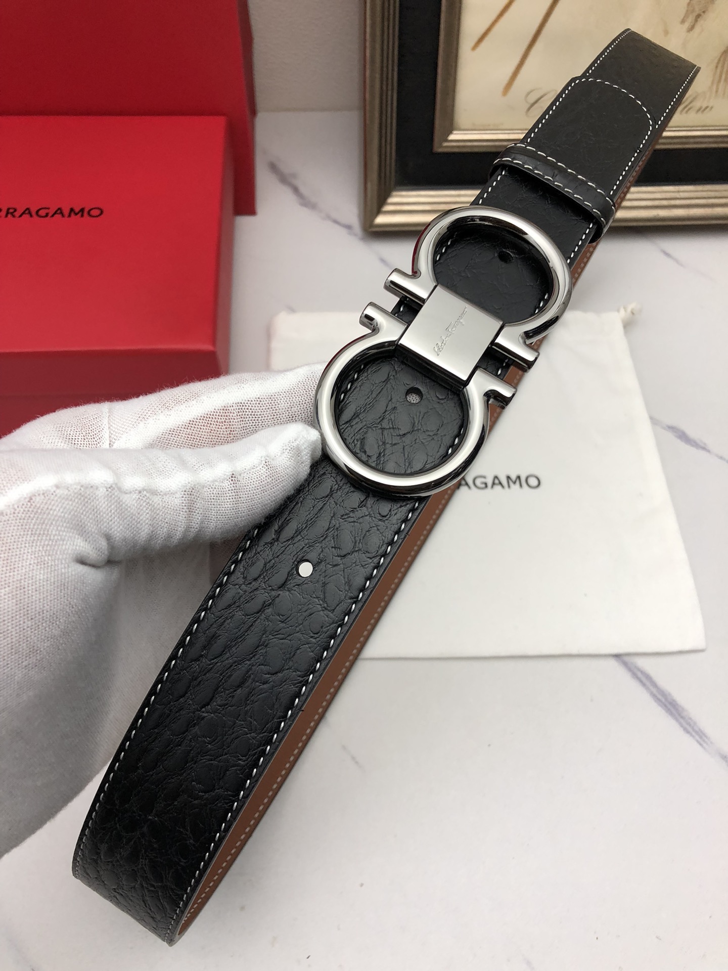 这款皮带是AAAAA 1:1 质量 (非常棒). 使用了和原版一模一样的材料. 商标部分也保持了和菲拉格慕/Salvatore Ferragamo一样. 图片拍摄是实物皮带拍摄, 您所收到的实物保证和我们图片一模一样.