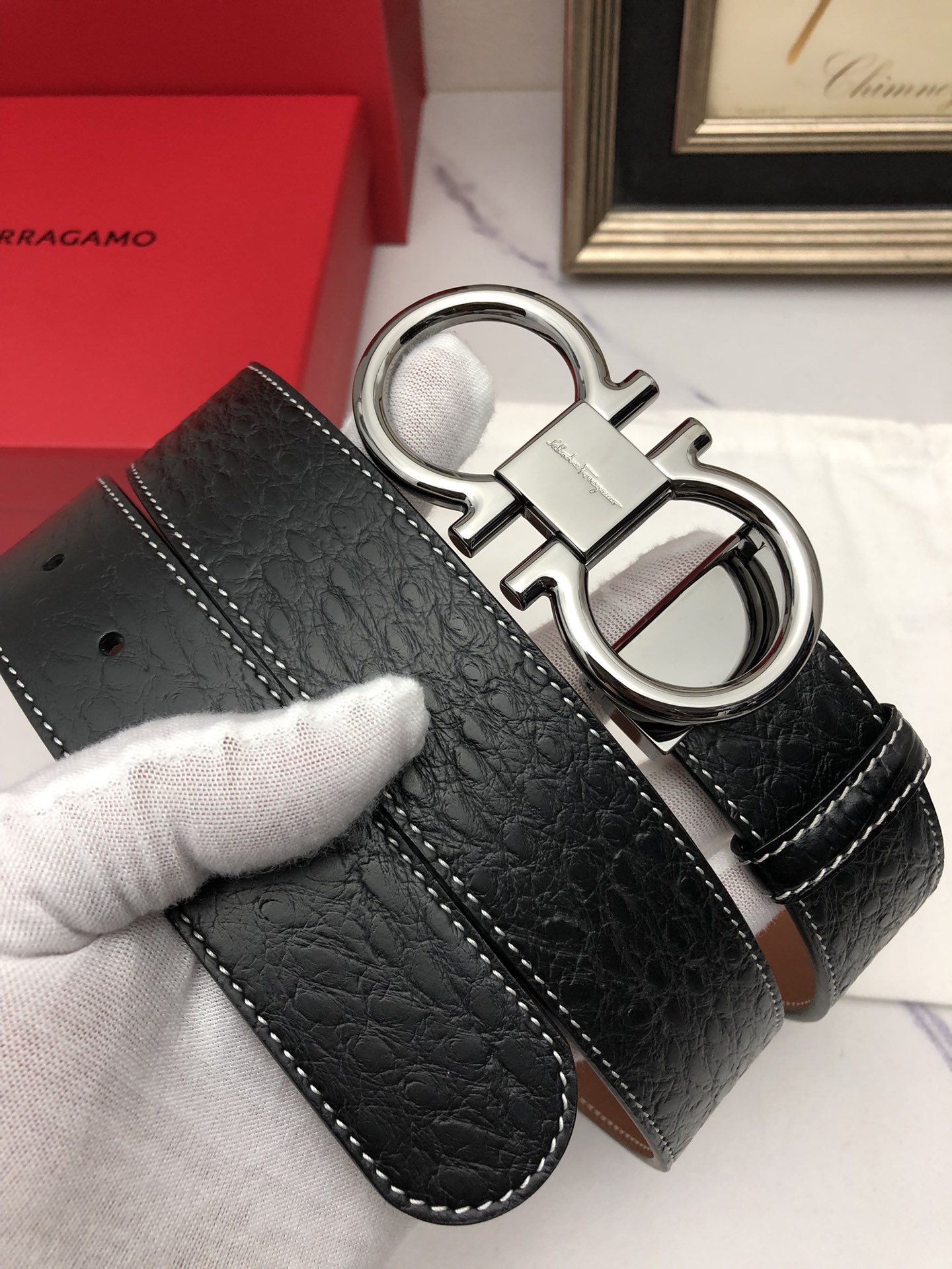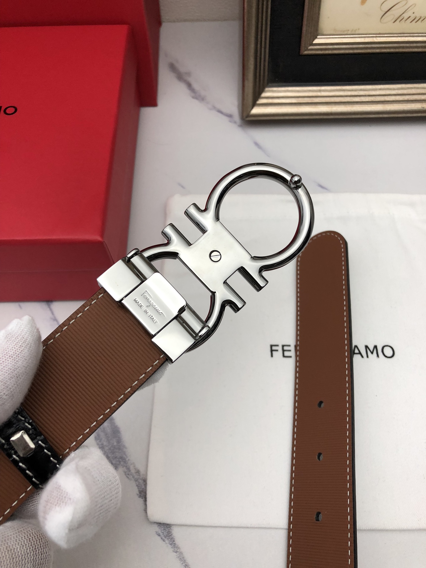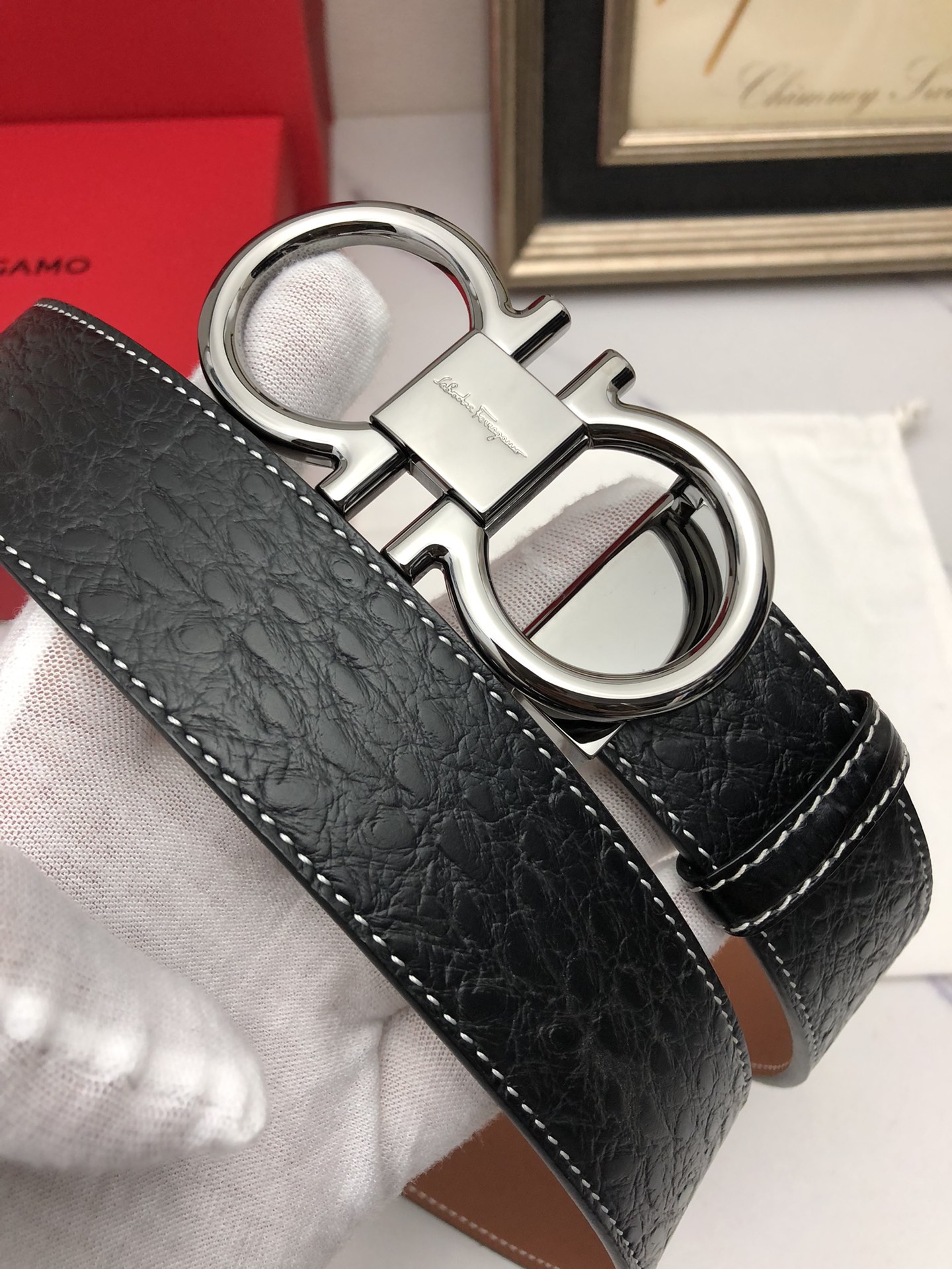 这款皮带是AAAAA 1:1 质量 (非常棒). 使用了和原版一模一样的材料. 商标部分也保持了和菲拉格慕/Salvatore Ferragamo一样. 图片拍摄是实物皮带拍摄, 您所收到的实物保证和我们图片一模一样.