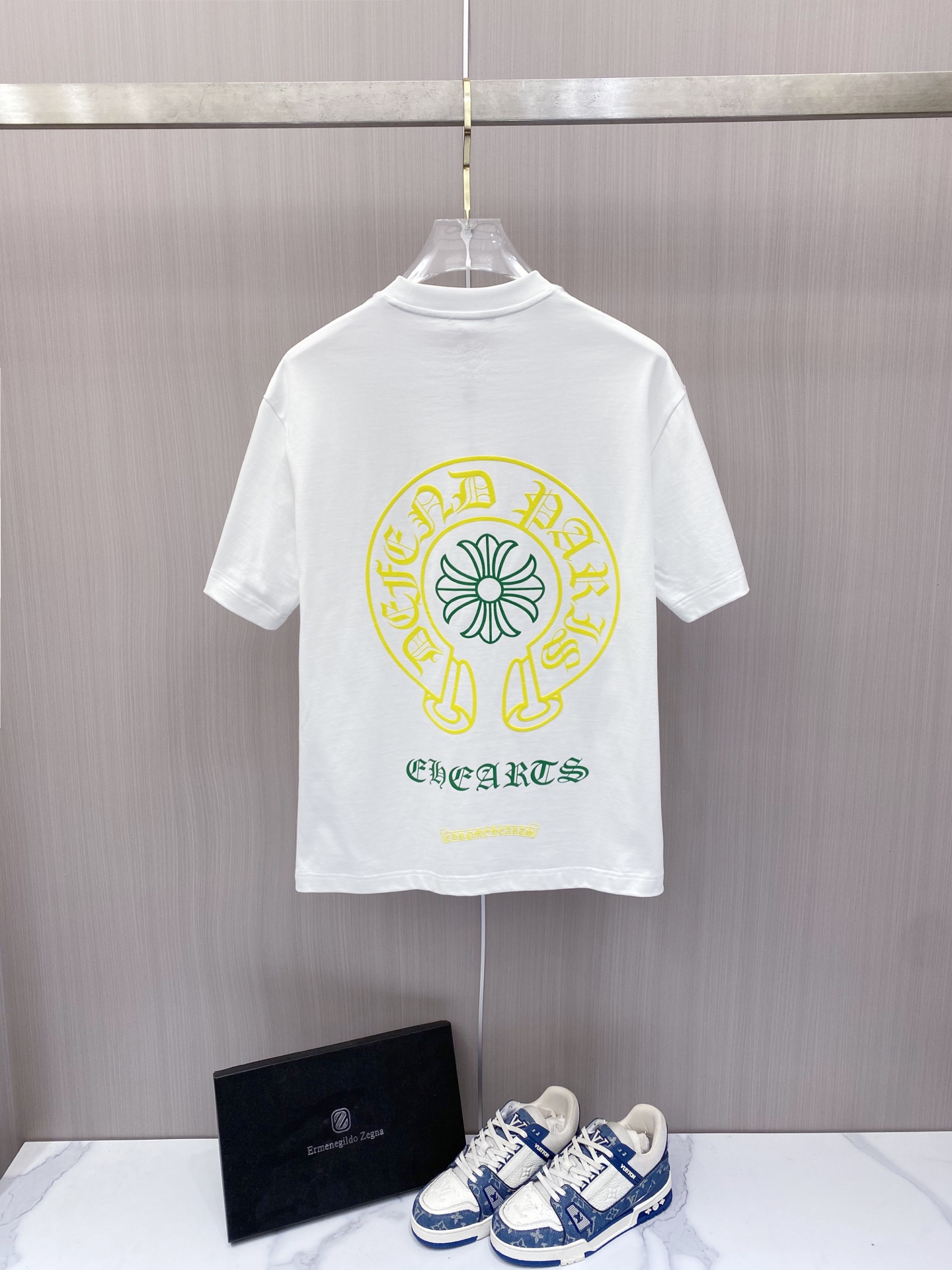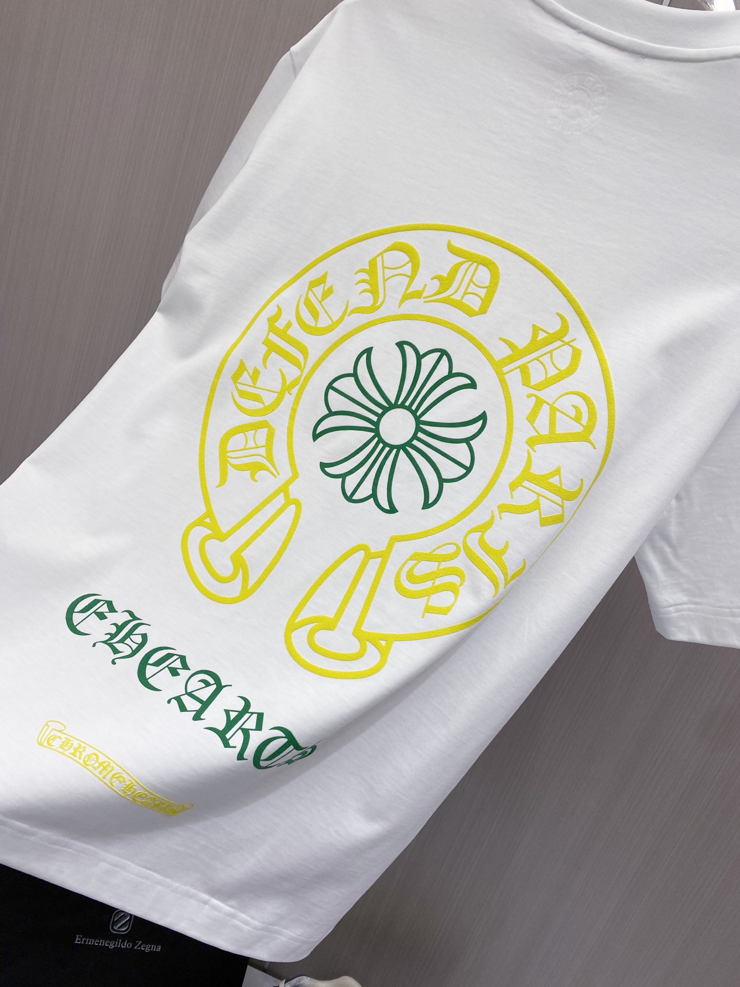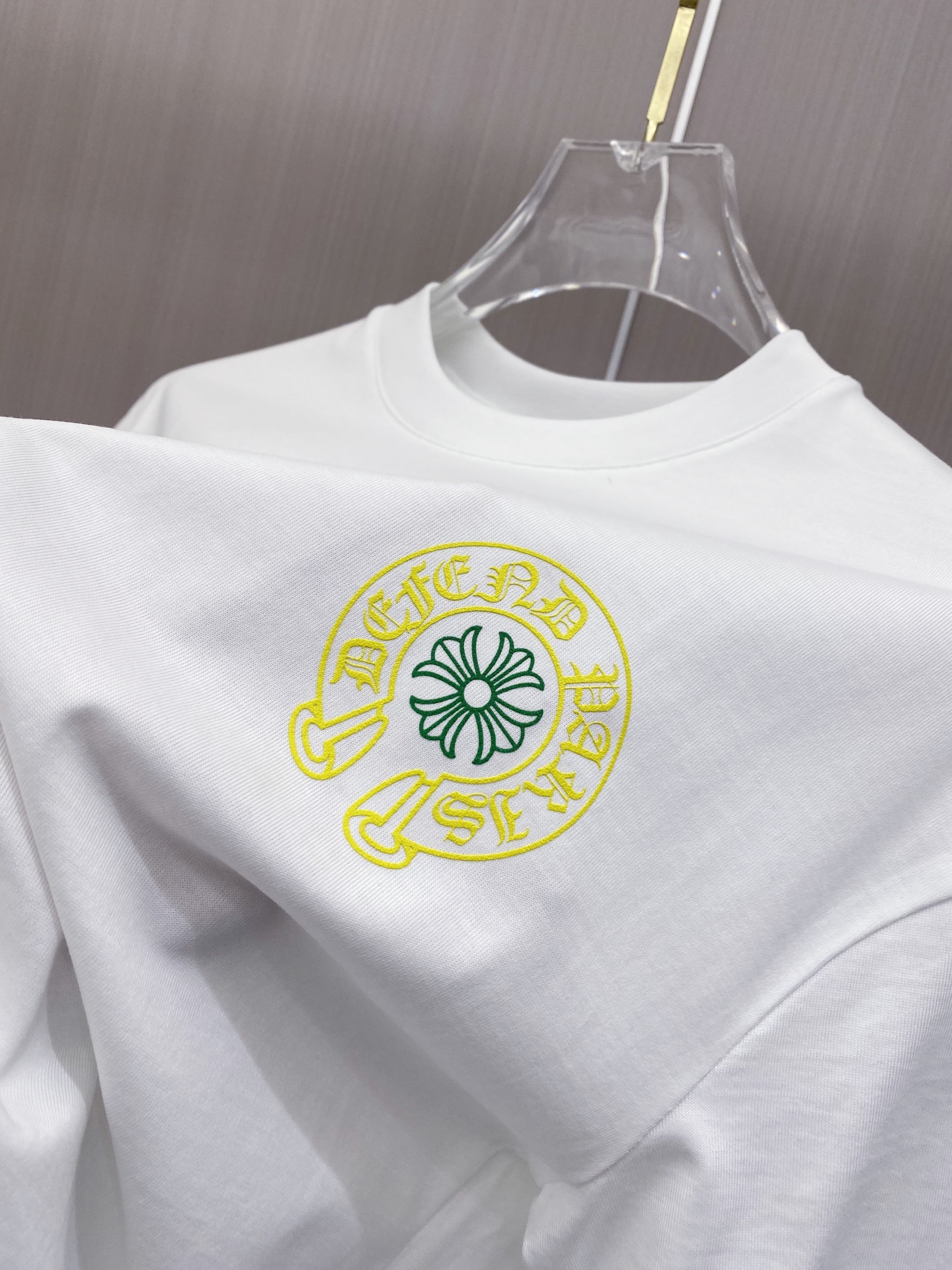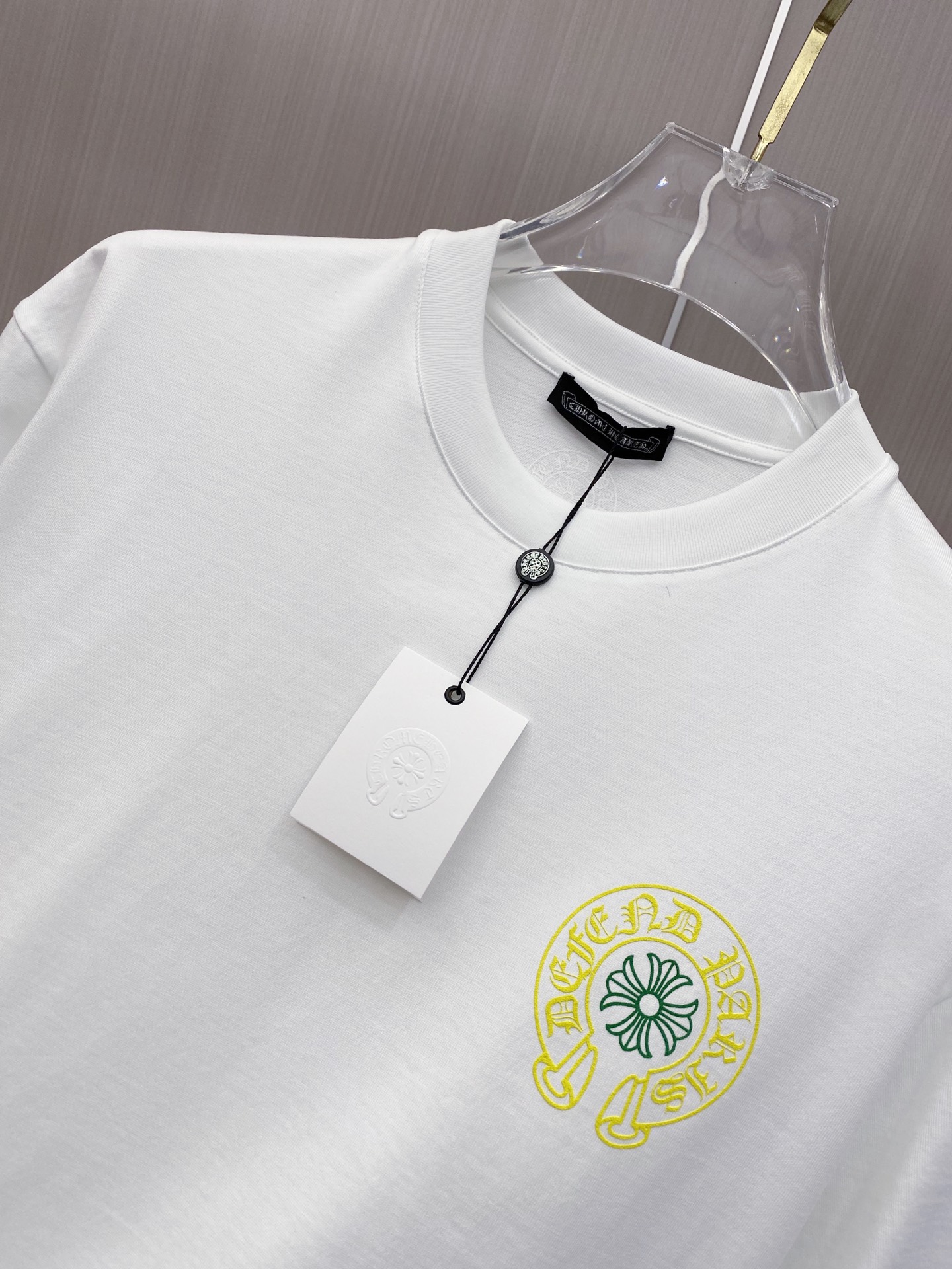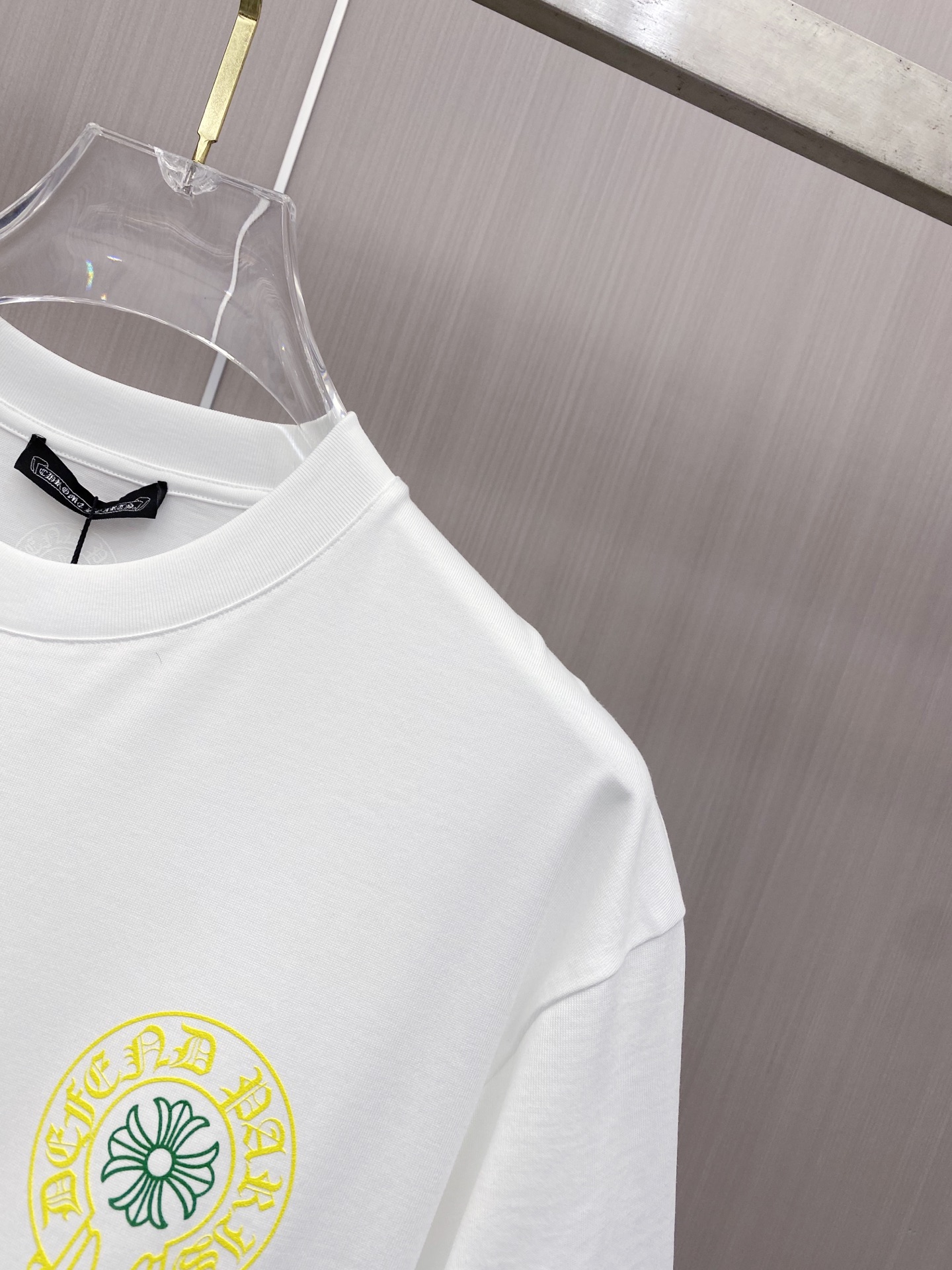 这款衣服是AAAAA 1:1 质量 (非常棒). 使用了和原版一模一样的材料. 商标部分也保持了和克罗心/Chrome Hearts一样. 图片拍摄是实物衣服拍摄, 您所收到的实物保证和我们图片一模一样.
