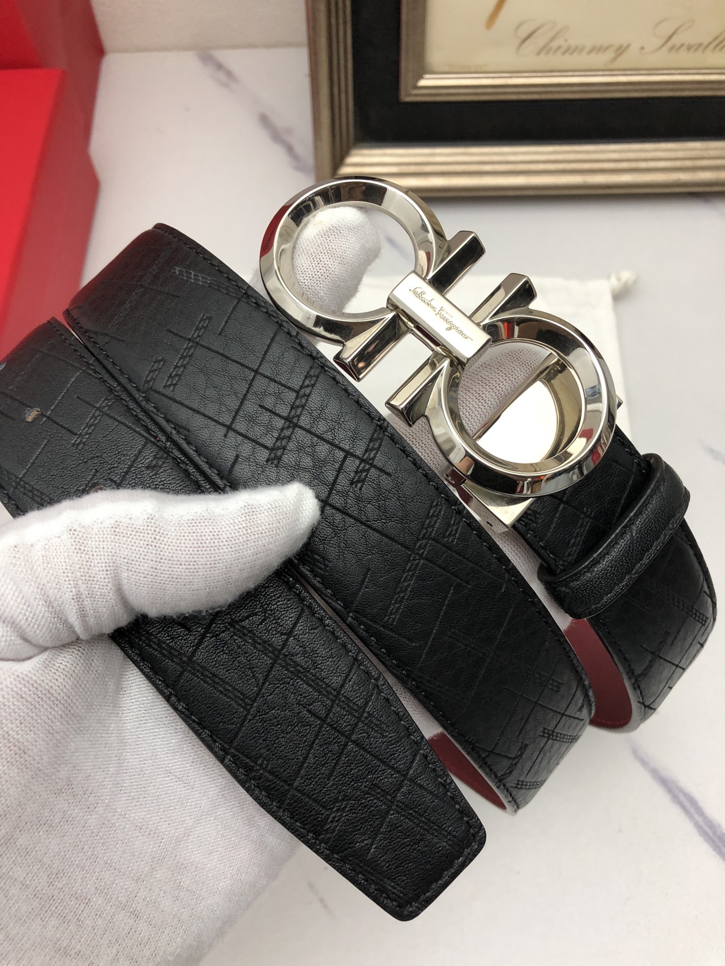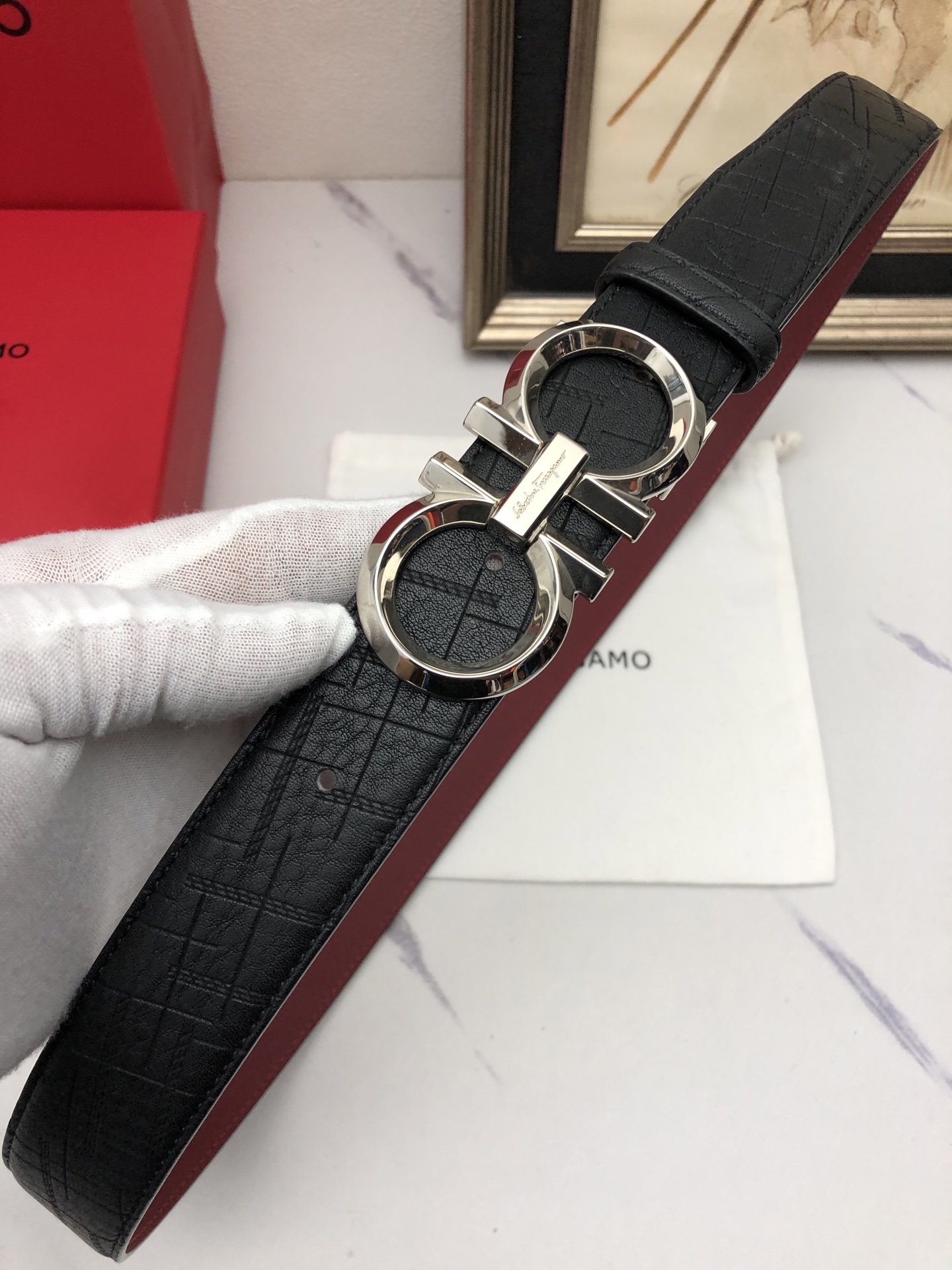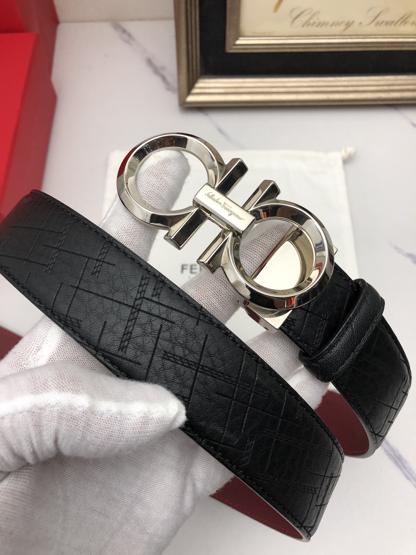 这款皮带是AAAAA 1:1 质量 (非常棒). 使用了和原版一模一样的材料. 商标部分也保持了和菲拉格慕/Salvatore Ferragamo一样. 图片拍摄是实物皮带拍摄, 您所收到的实物保证和我们图片一模一样.