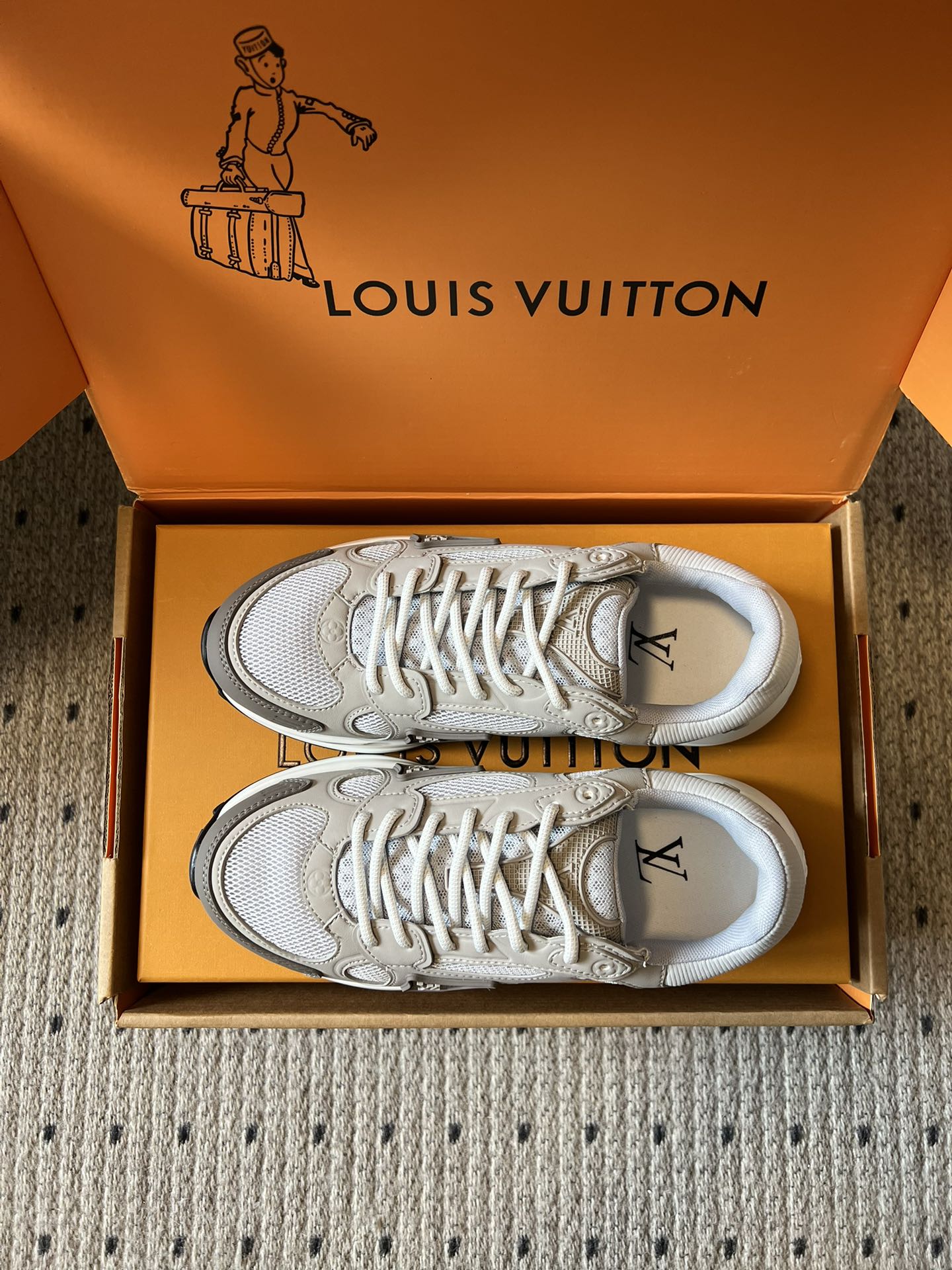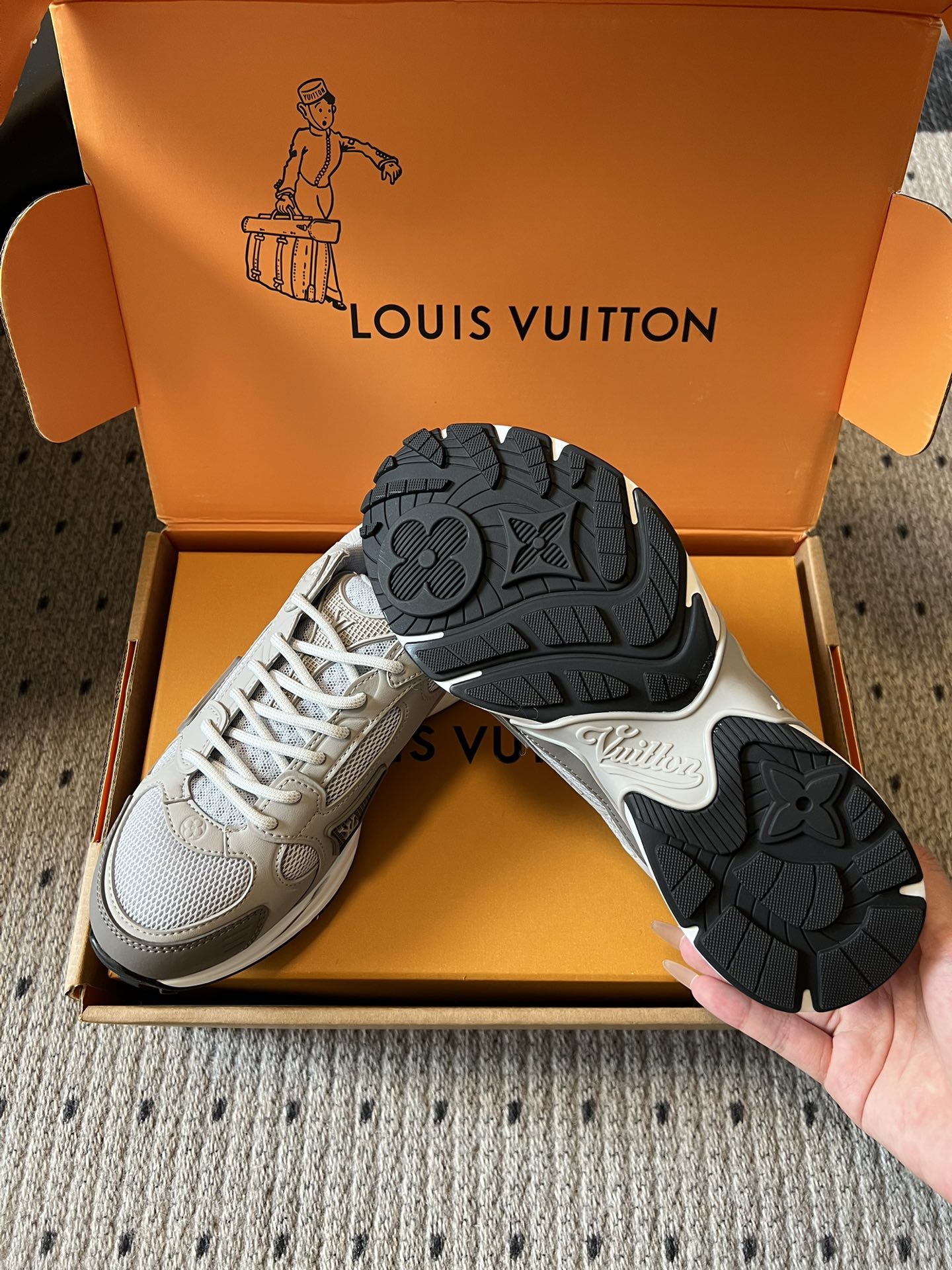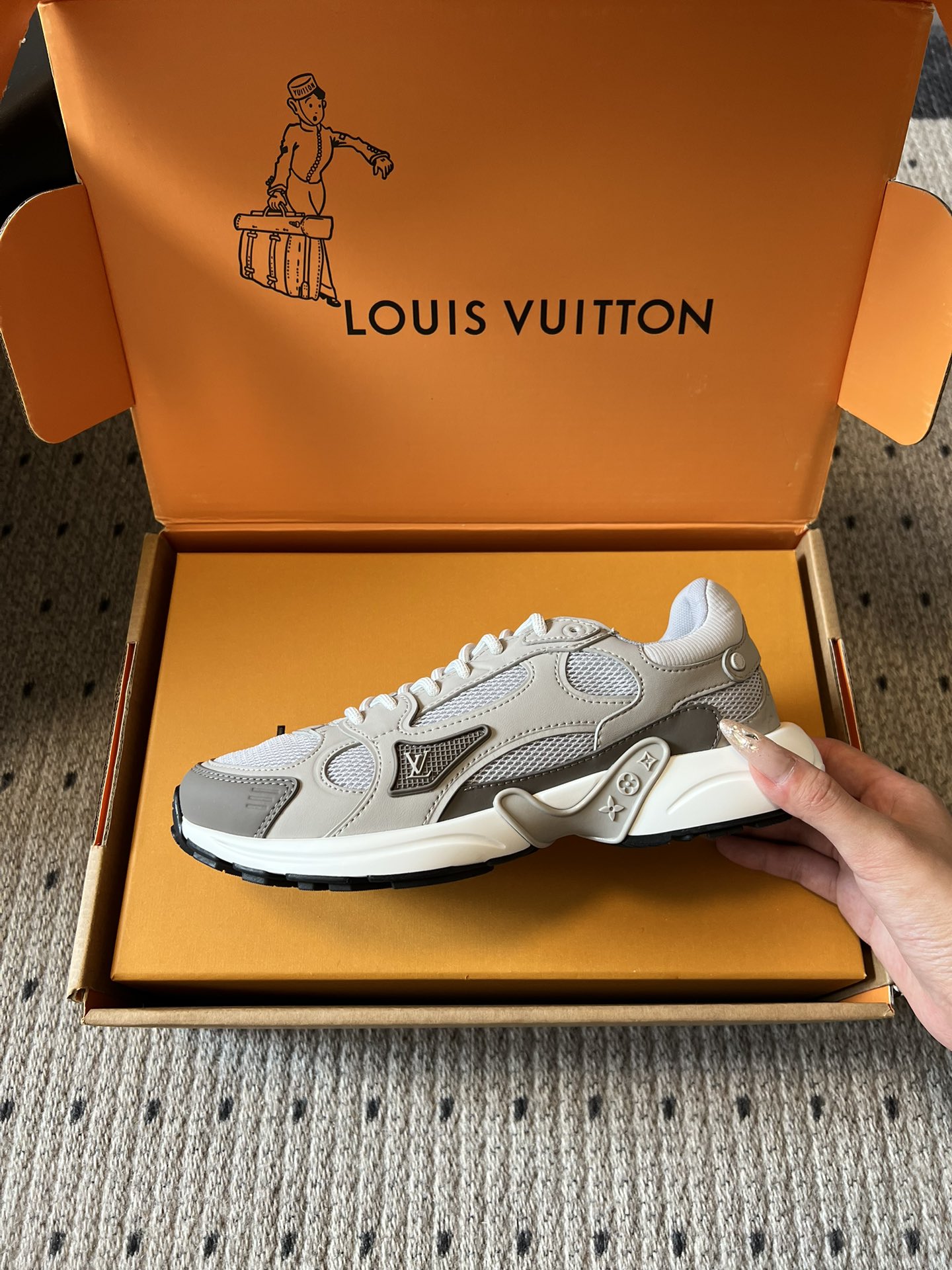 这款鞋子是AAAAA 1:1 质量 (非常棒). 使用了和原版一模一样的材料. 商标部分也保持了和路易威登/Louis Vuitton一样. 图片拍摄是实物鞋子拍摄, 您所收到的实物保证和我们图片一模一样.