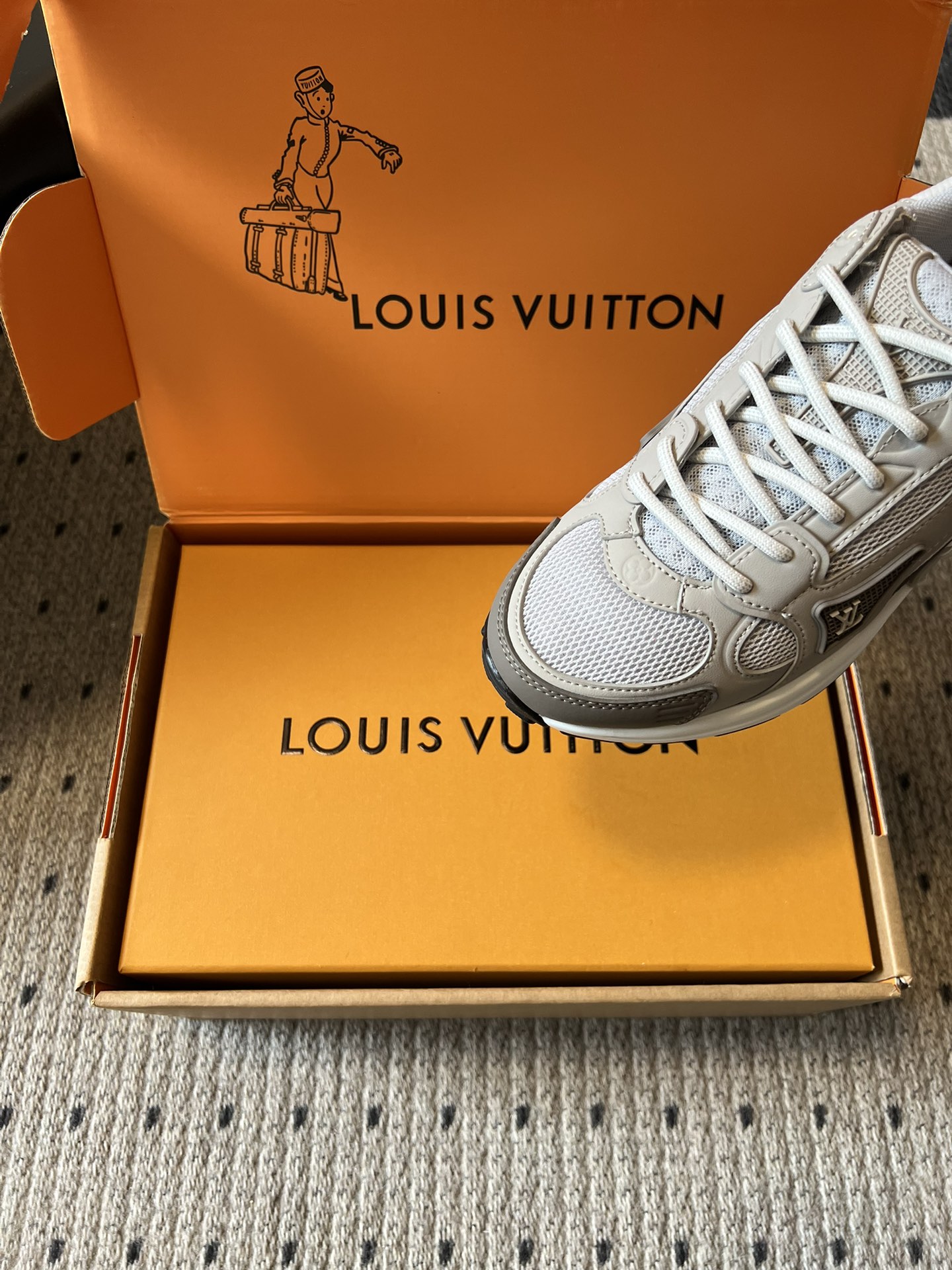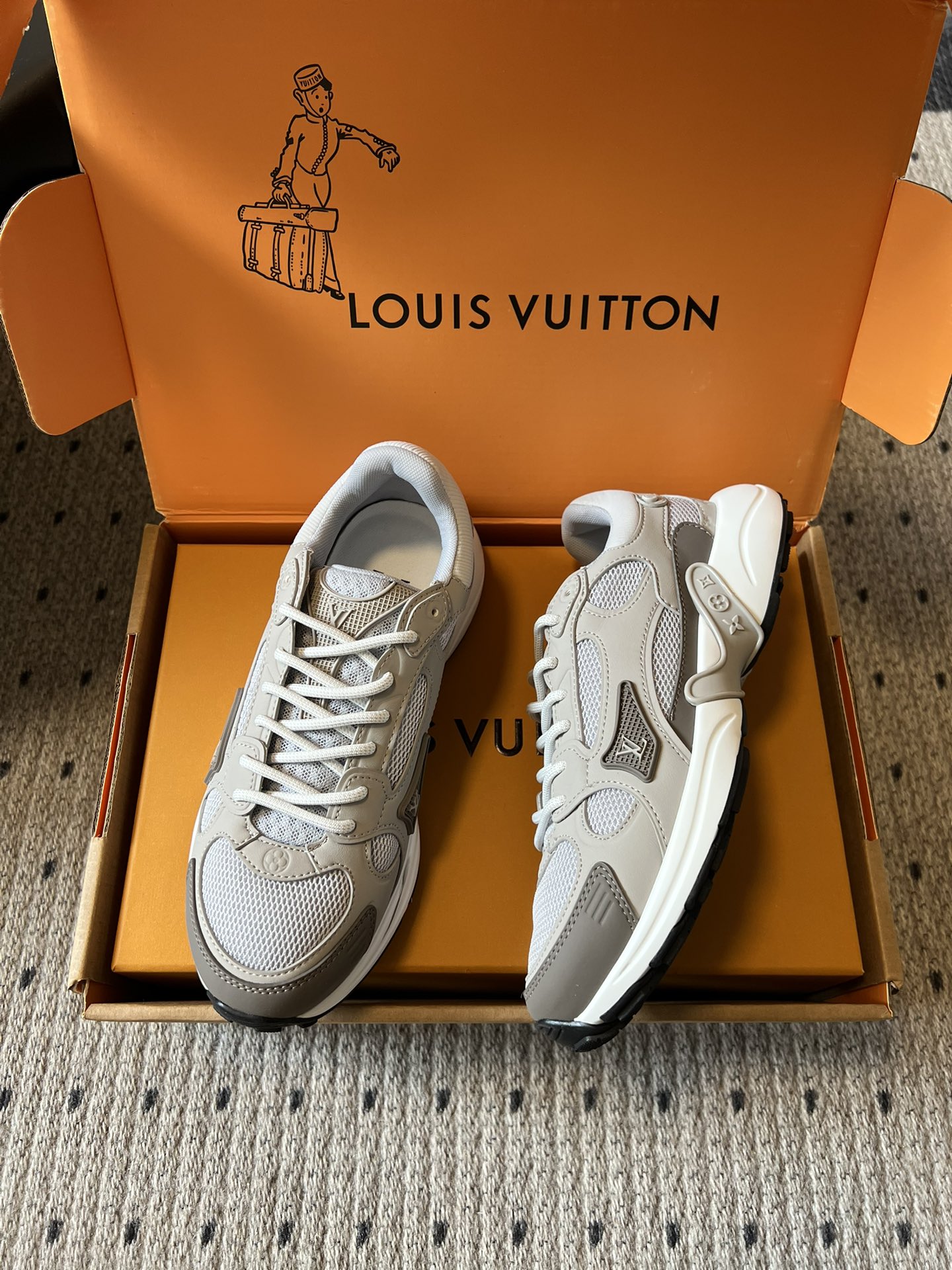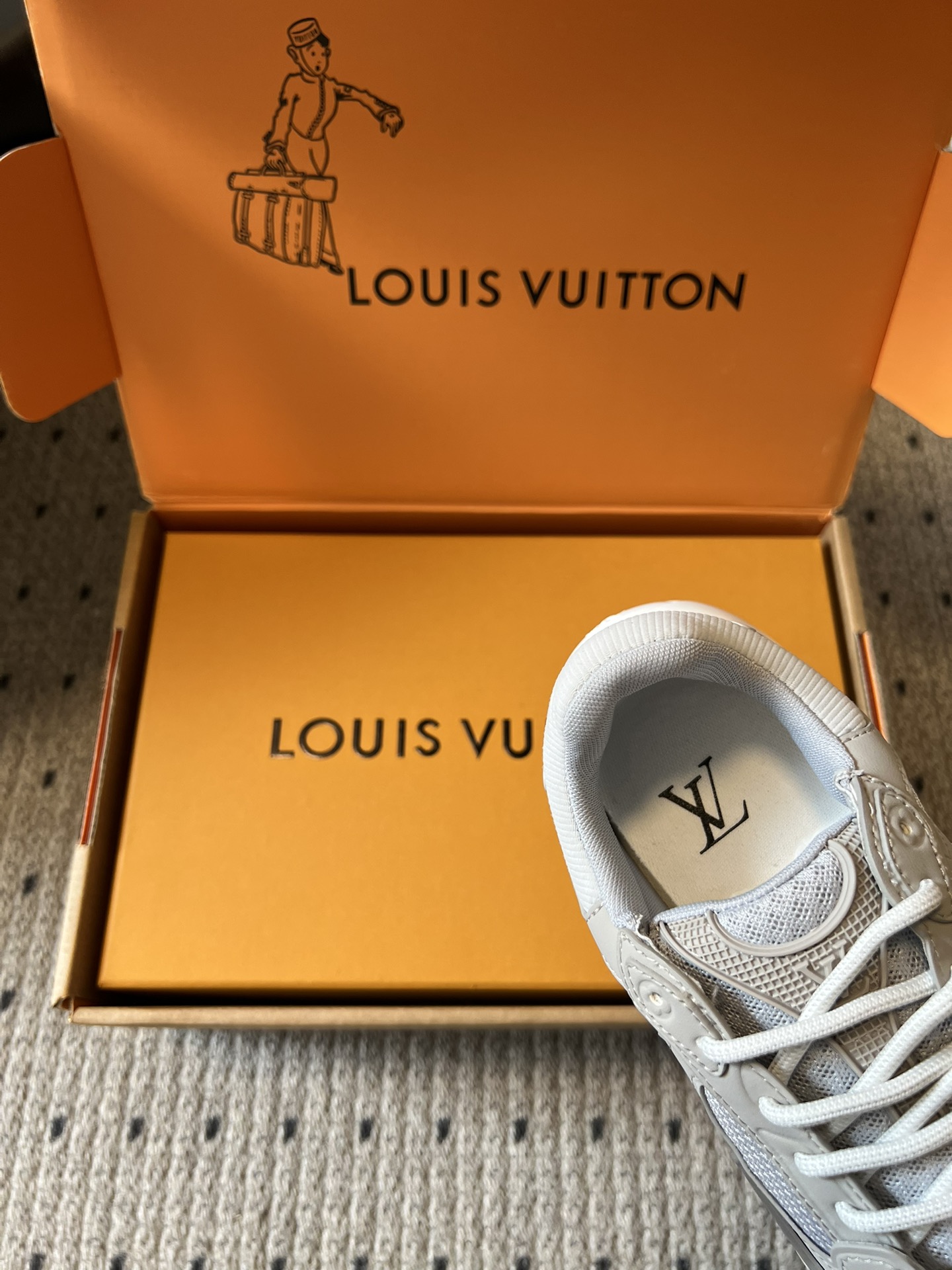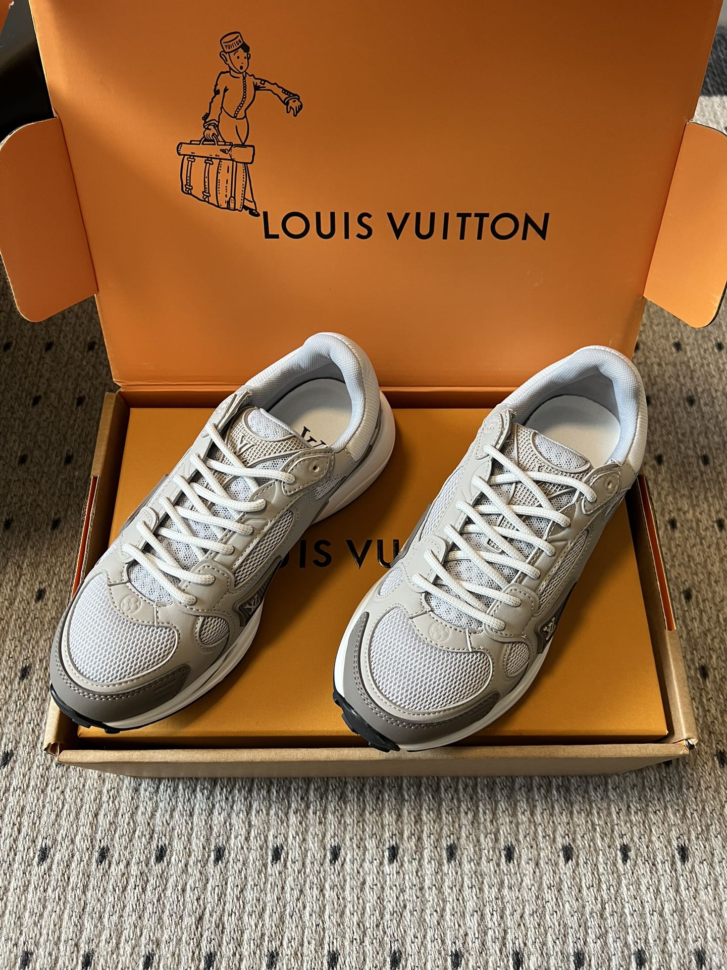 这款鞋子是AAAAA 1:1 质量 (非常棒). 使用了和原版一模一样的材料. 商标部分也保持了和路易威登/Louis Vuitton一样. 图片拍摄是实物鞋子拍摄, 您所收到的实物保证和我们图片一模一样.
