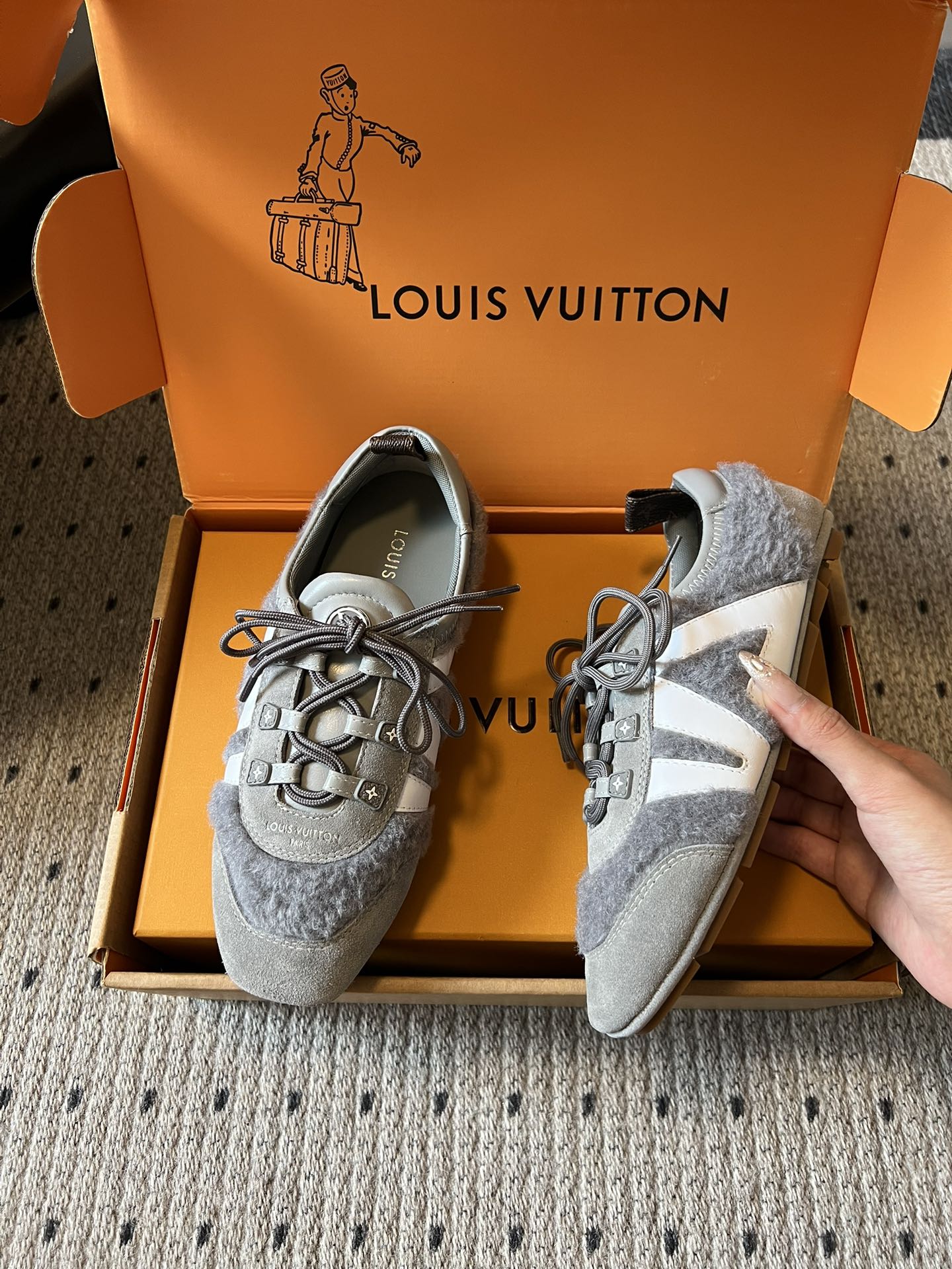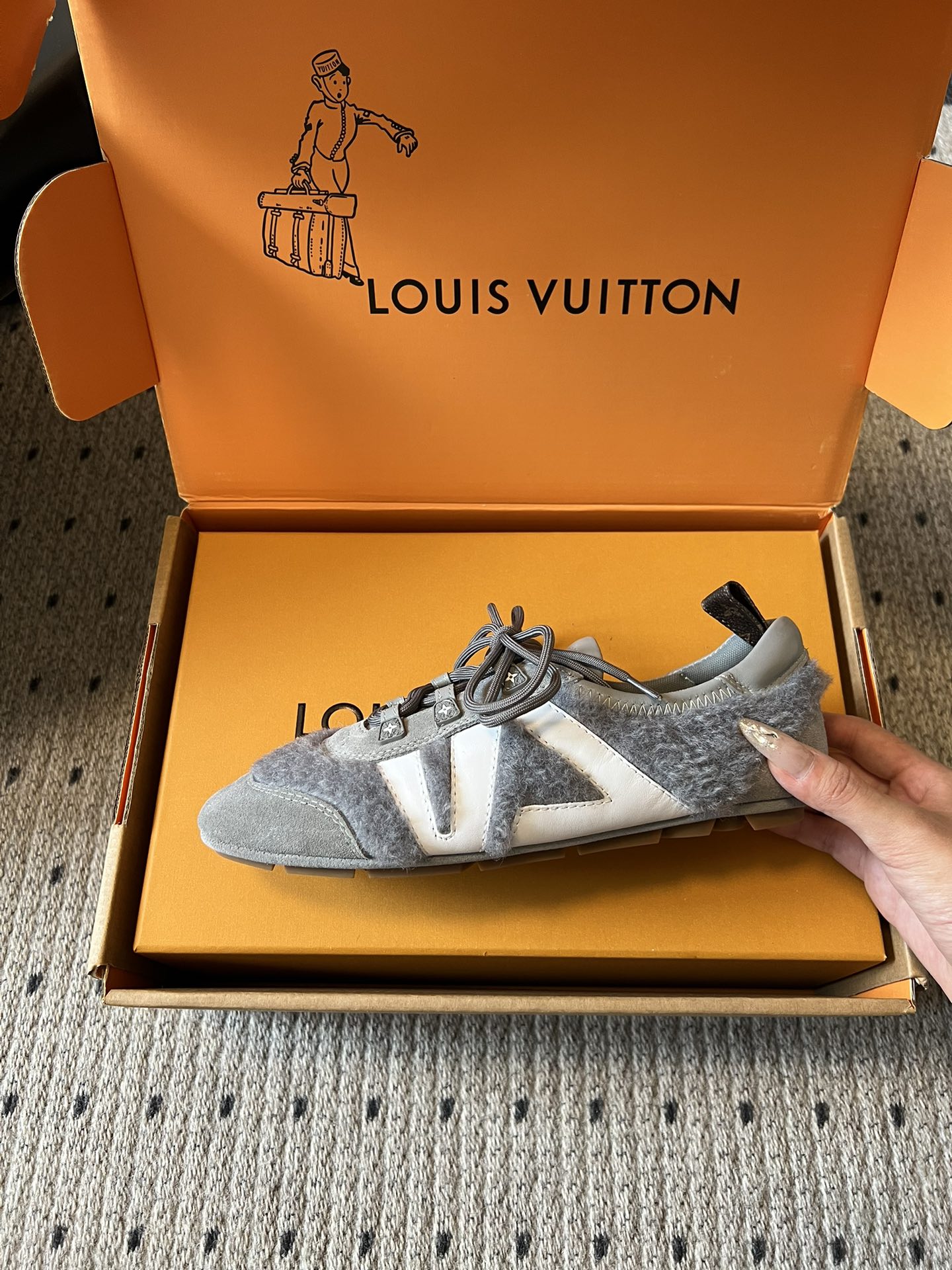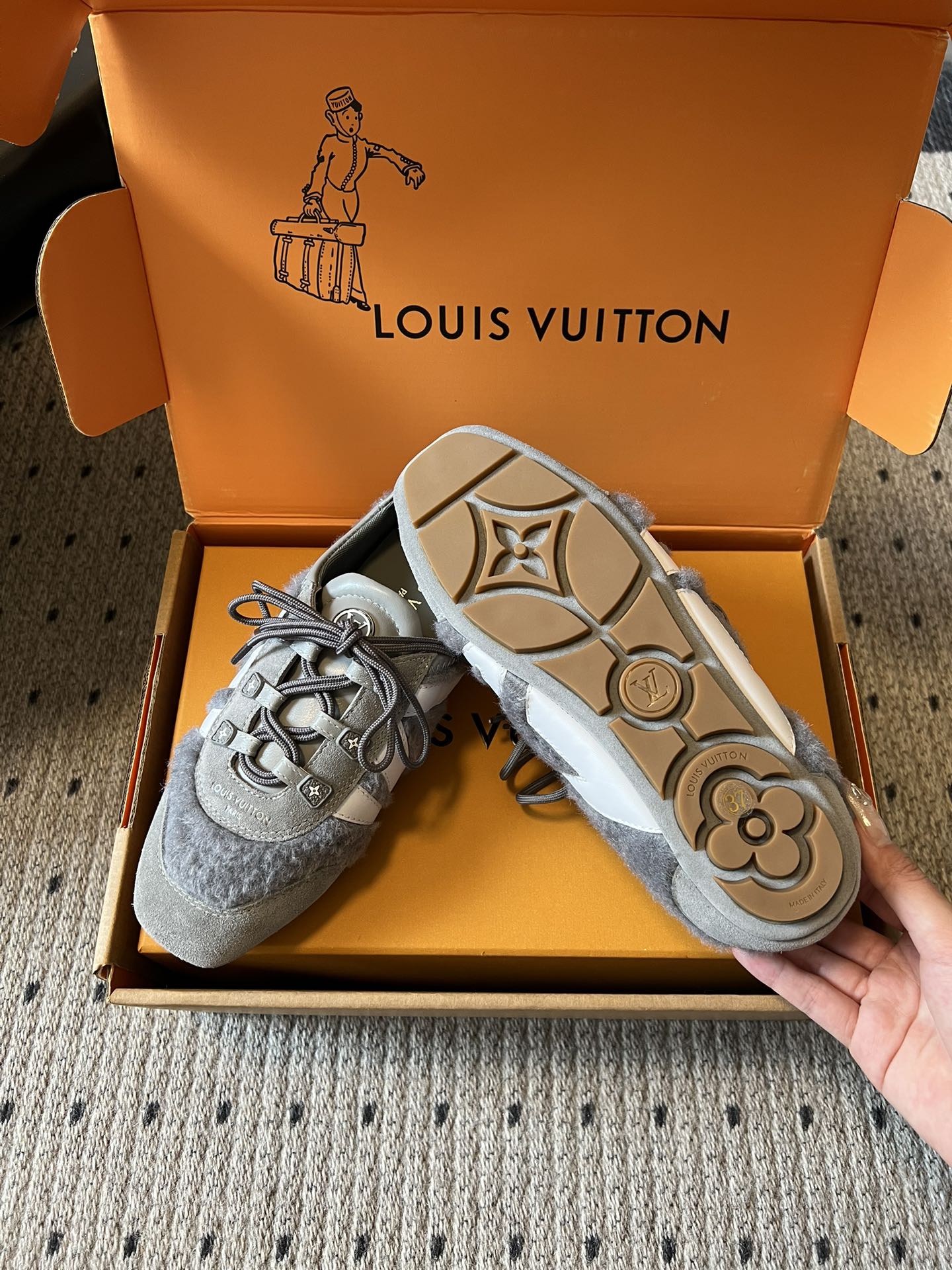 这款鞋子是AAAAA 1:1 质量 (非常棒). 使用了和原版一模一样的材料. 商标部分也保持了和路易威登/Louis Vuitton一样. 图片拍摄是实物鞋子拍摄, 您所收到的实物保证和我们图片一模一样.