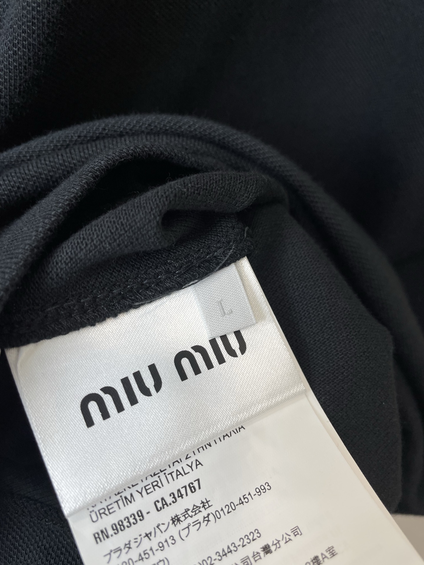 这款衣服是AAAAA 1:1 质量 (非常棒). 使用了和原版一模一样的材料. 商标部分也保持了和缪缪/Miu Miu一样. 图片拍摄是实物衣服拍摄, 您所收到的实物保证和我们图片一模一样.