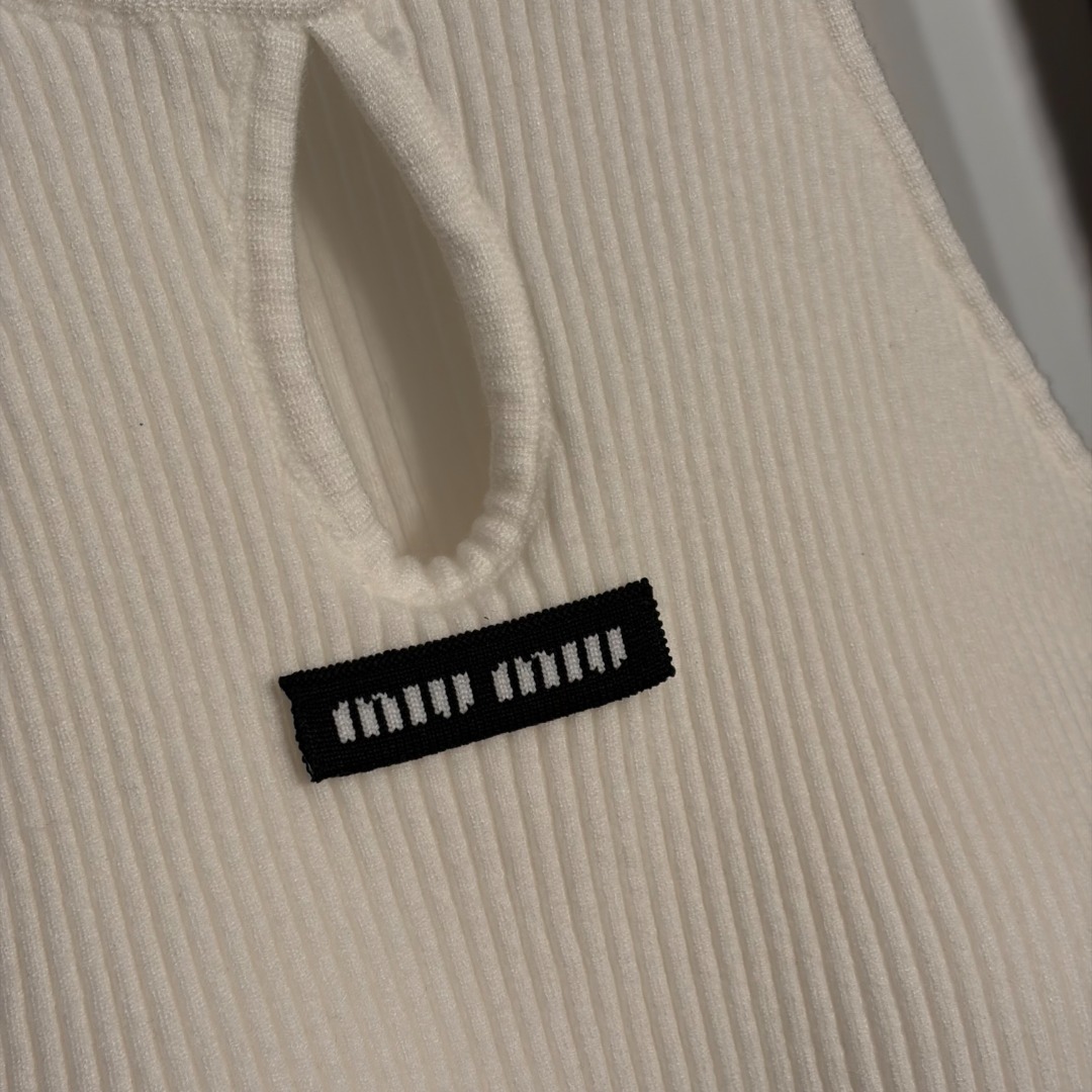 这款衣服是AAAAA 1:1 质量 (非常棒). 使用了和原版一模一样的材料. 商标部分也保持了和缪缪/Miu Miu一样. 图片拍摄是实物衣服拍摄, 您所收到的实物保证和我们图片一模一样.
