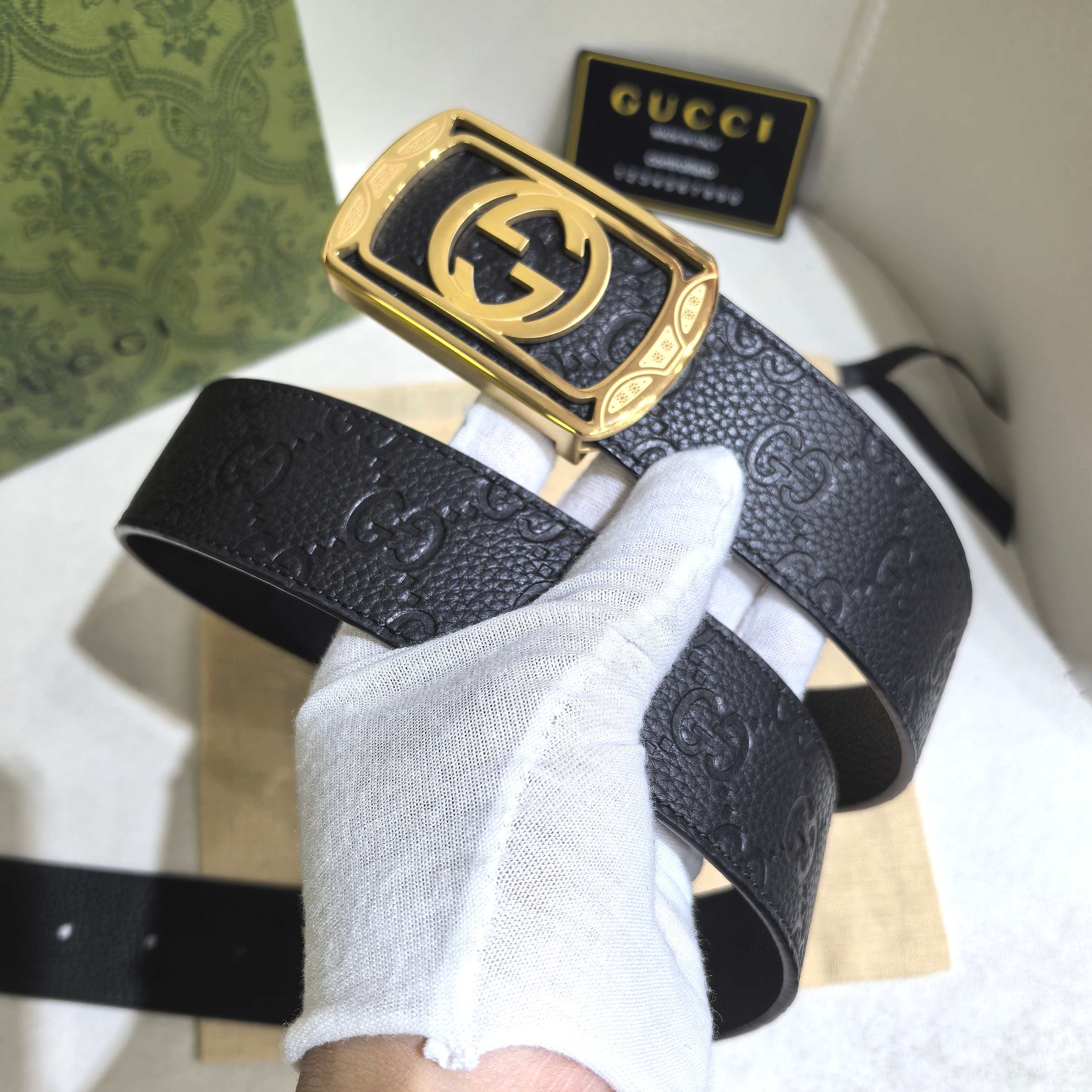 这款皮带是AAAAA 1:1 质量 (非常棒). 使用了和原版一模一样的材料. 商标部分也保持了和古奇/Gucci一样. 图片拍摄是实物皮带拍摄, 您所收到的实物保证和我们图片一模一样.