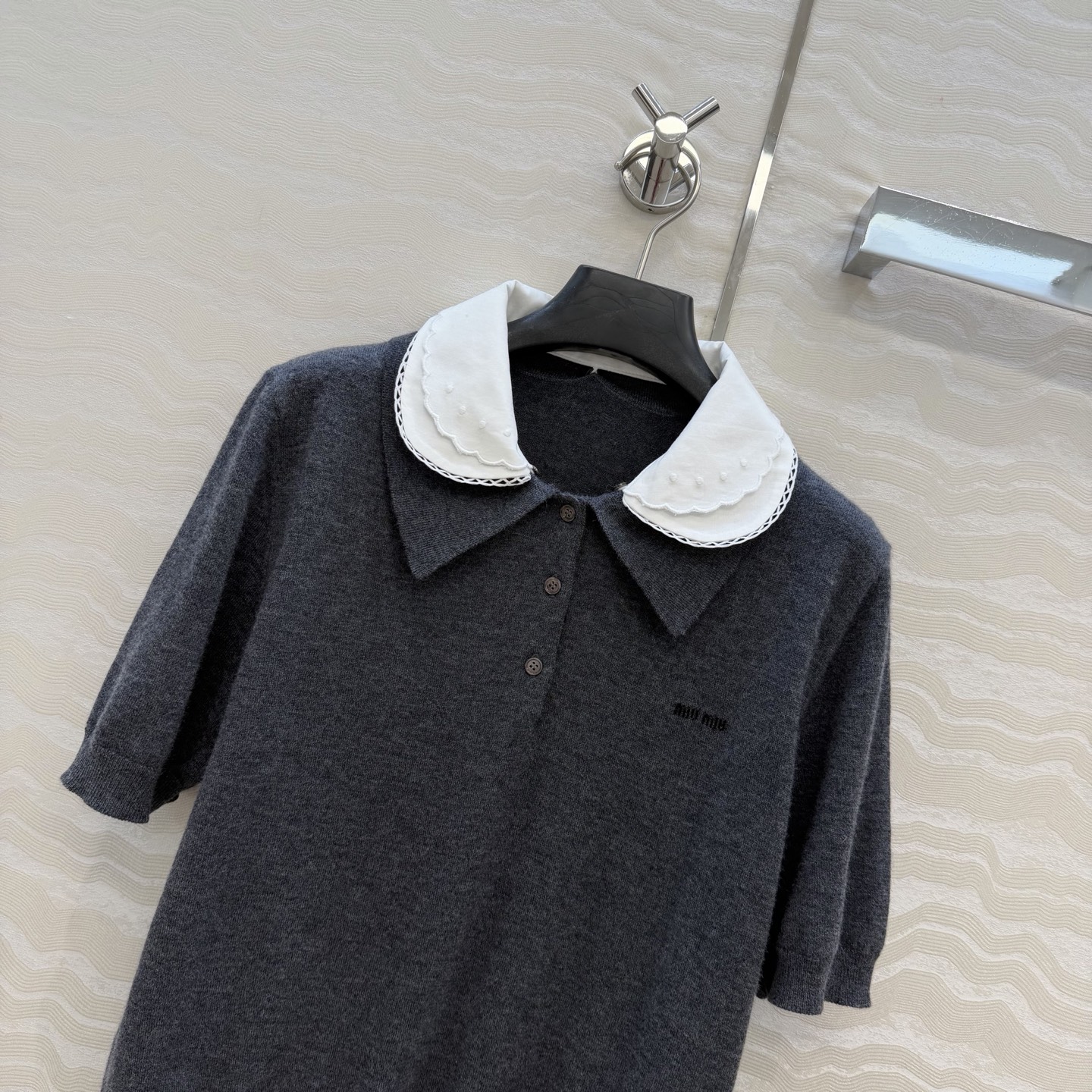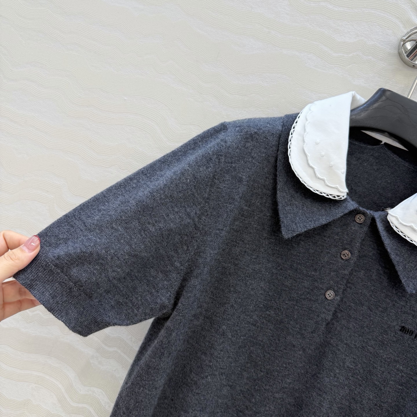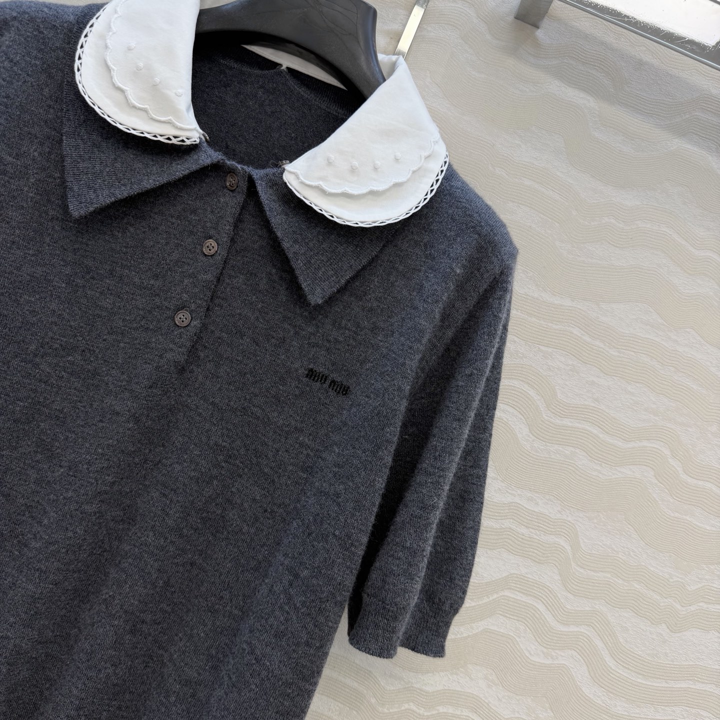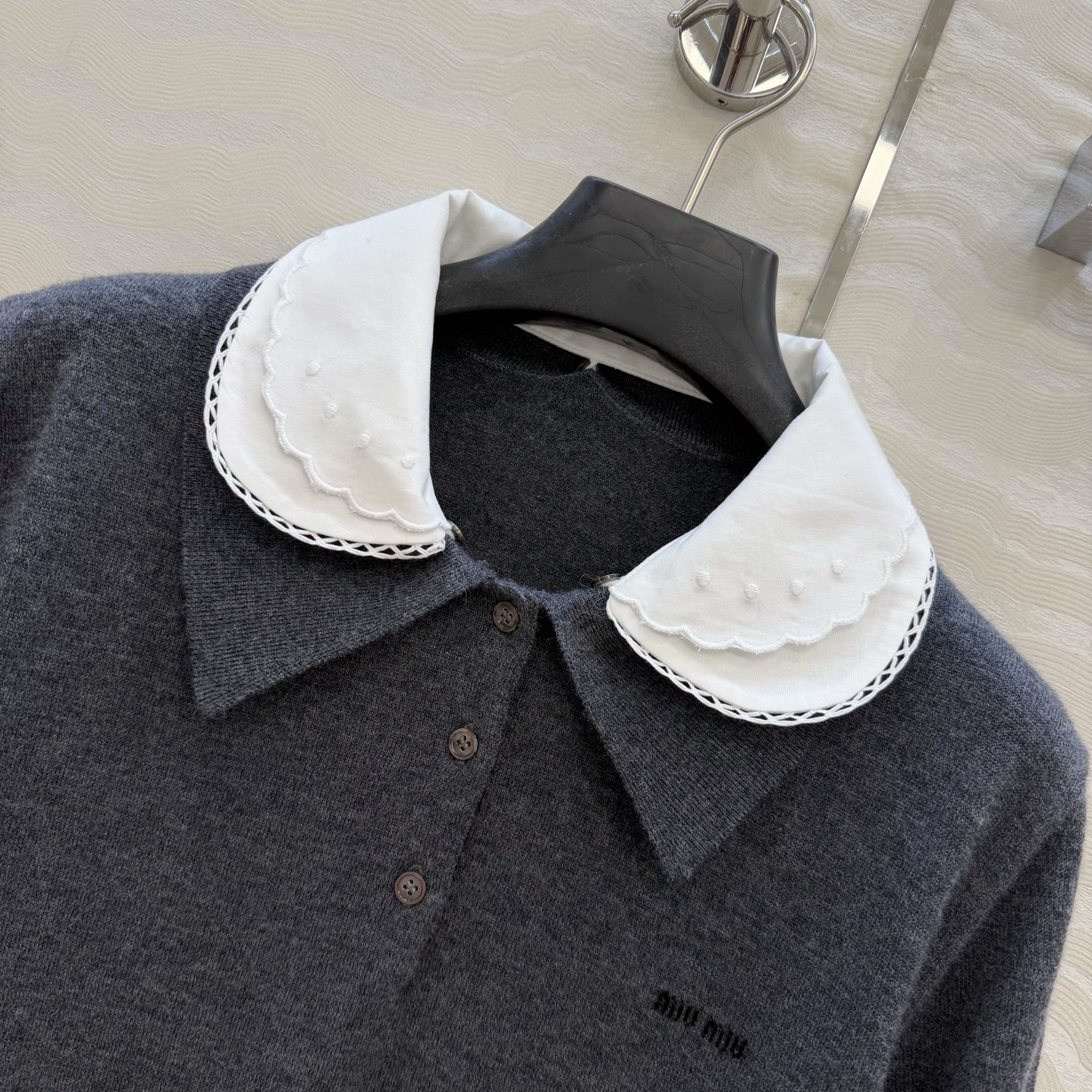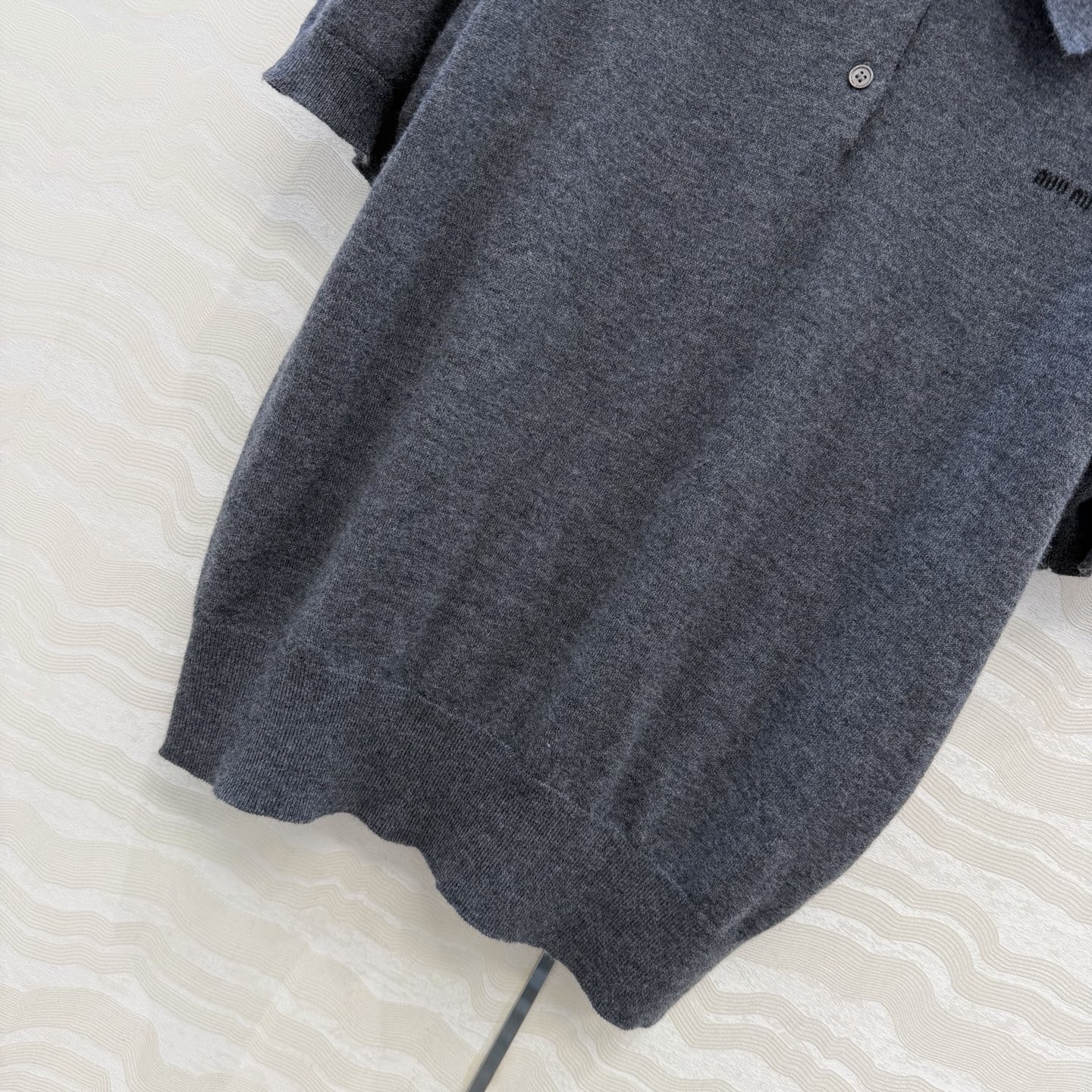 这款衣服是AAAAA 1:1 质量 (非常棒). 使用了和原版一模一样的材料. 商标部分也保持了和缪缪/Miu Miu一样. 图片拍摄是实物衣服拍摄, 您所收到的实物保证和我们图片一模一样.