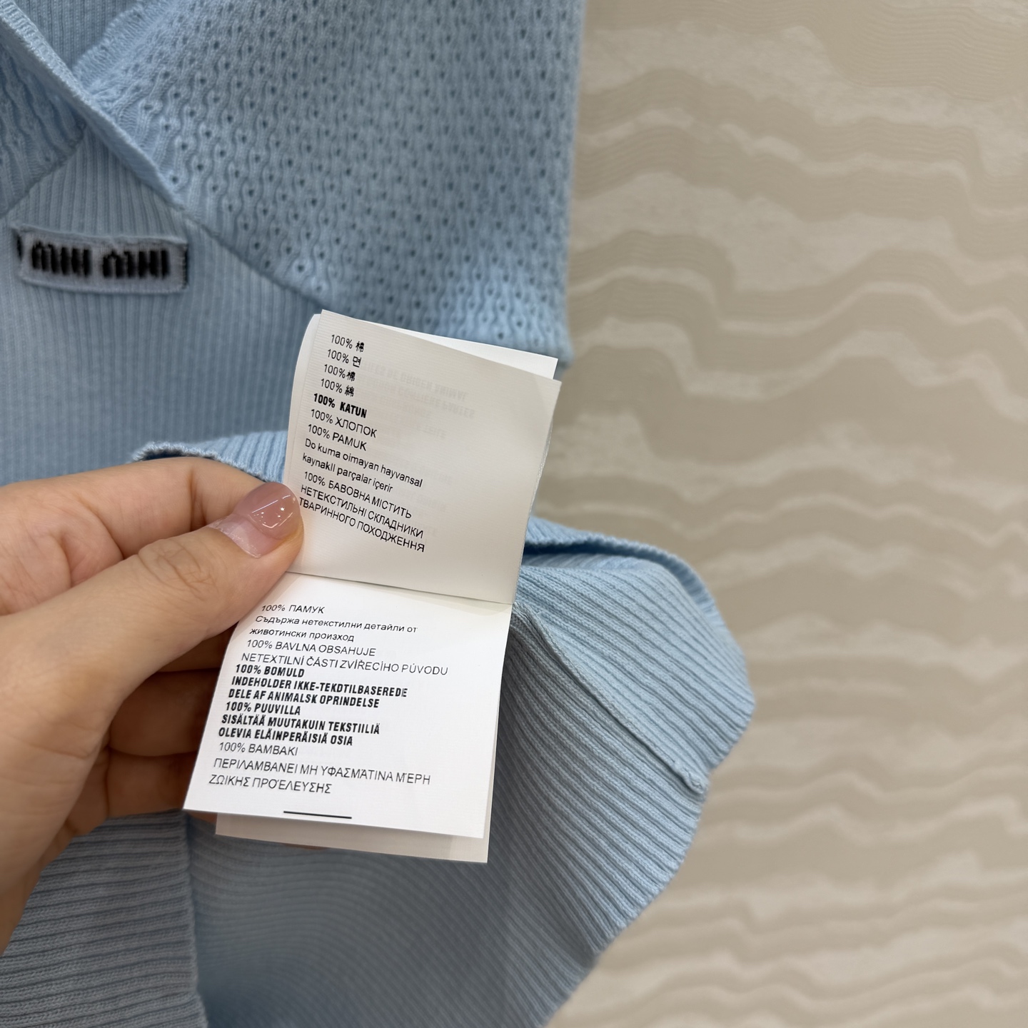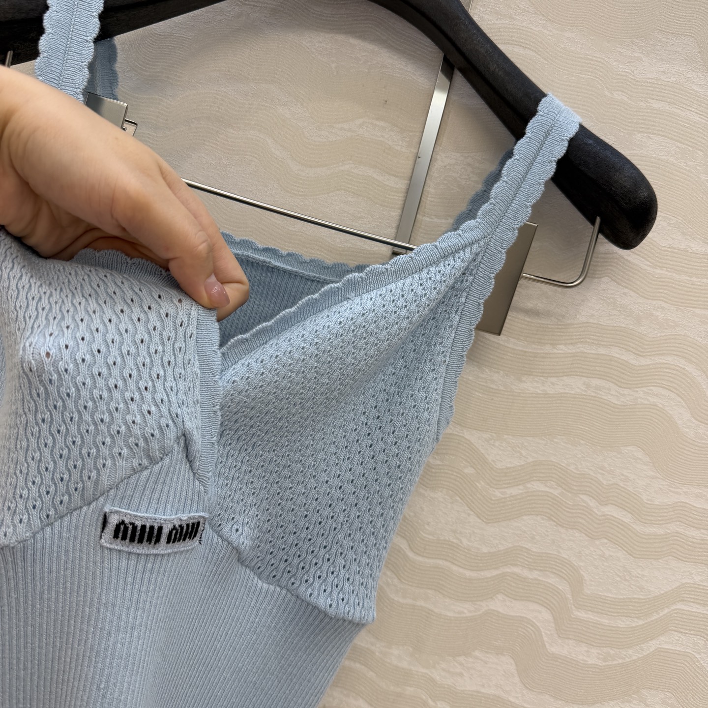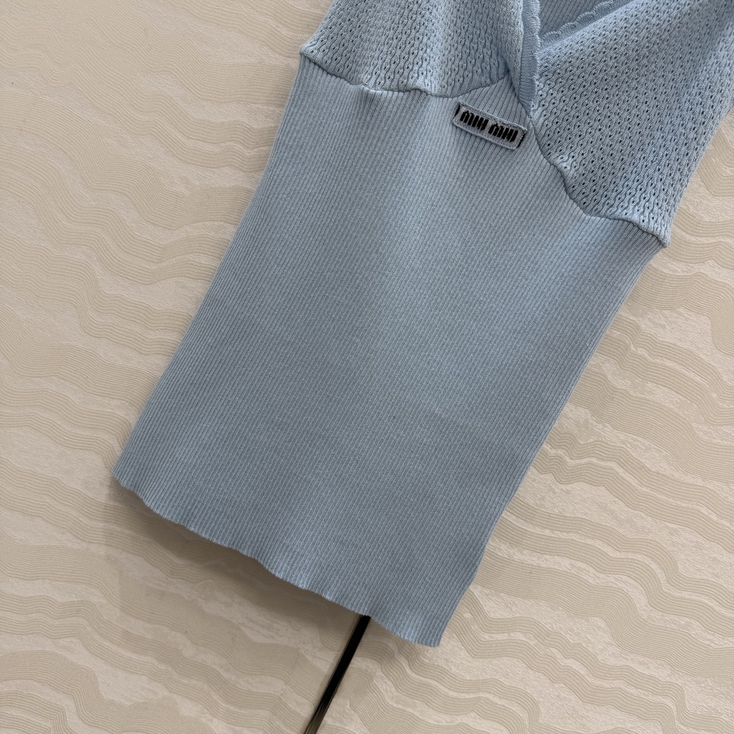 这款衣服是AAAAA 1:1 质量 (非常棒). 使用了和原版一模一样的材料. 商标部分也保持了和缪缪/Miu Miu一样. 图片拍摄是实物衣服拍摄, 您所收到的实物保证和我们图片一模一样.