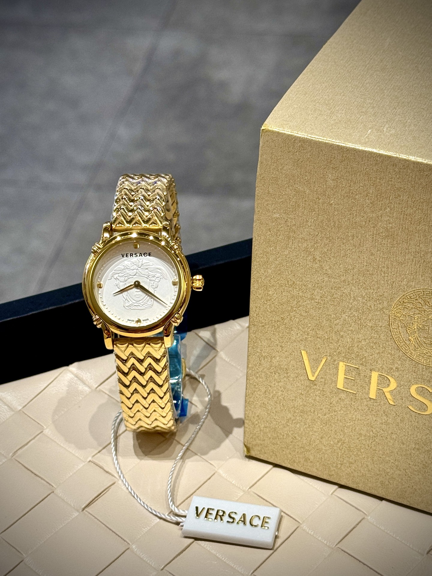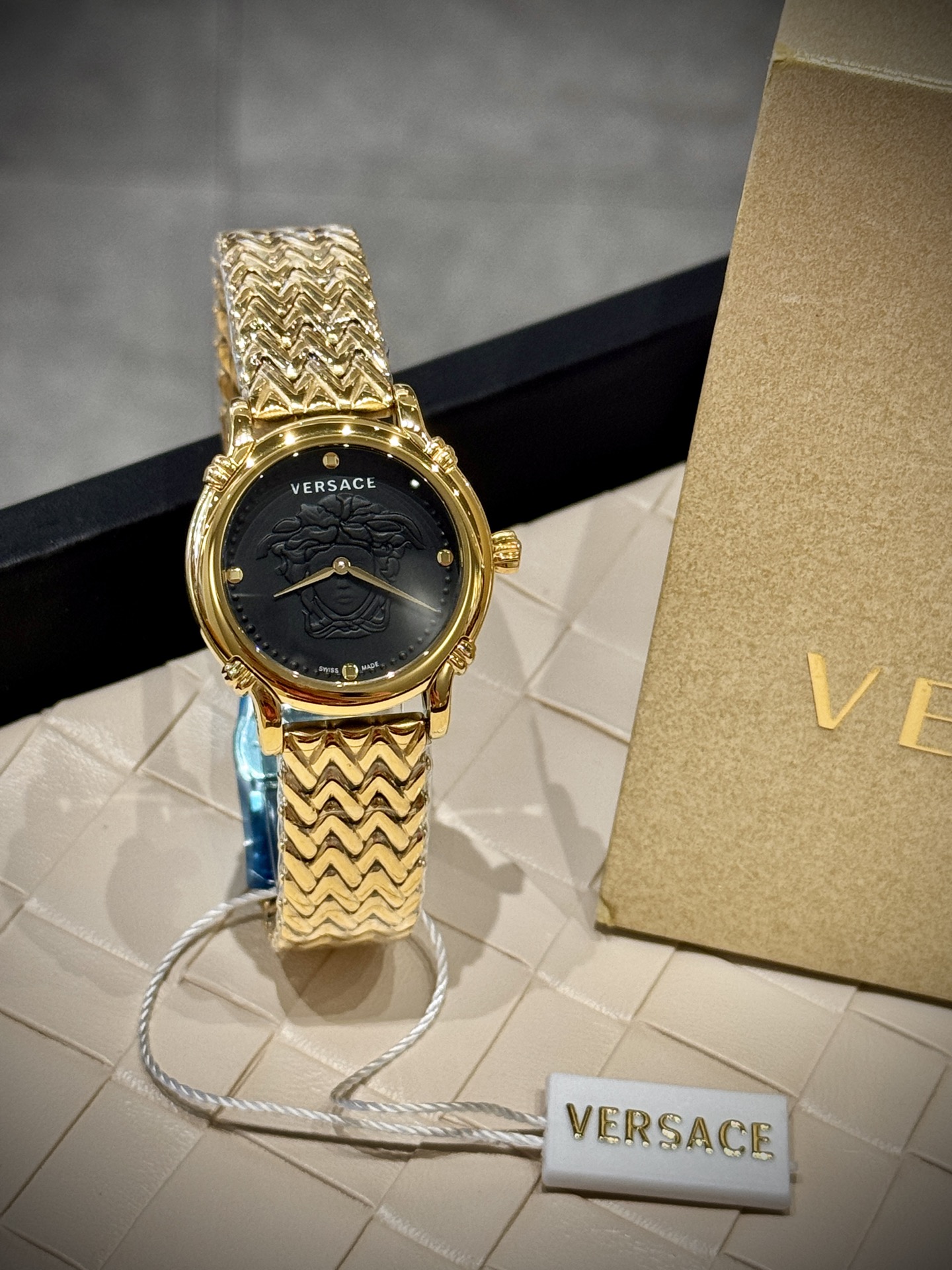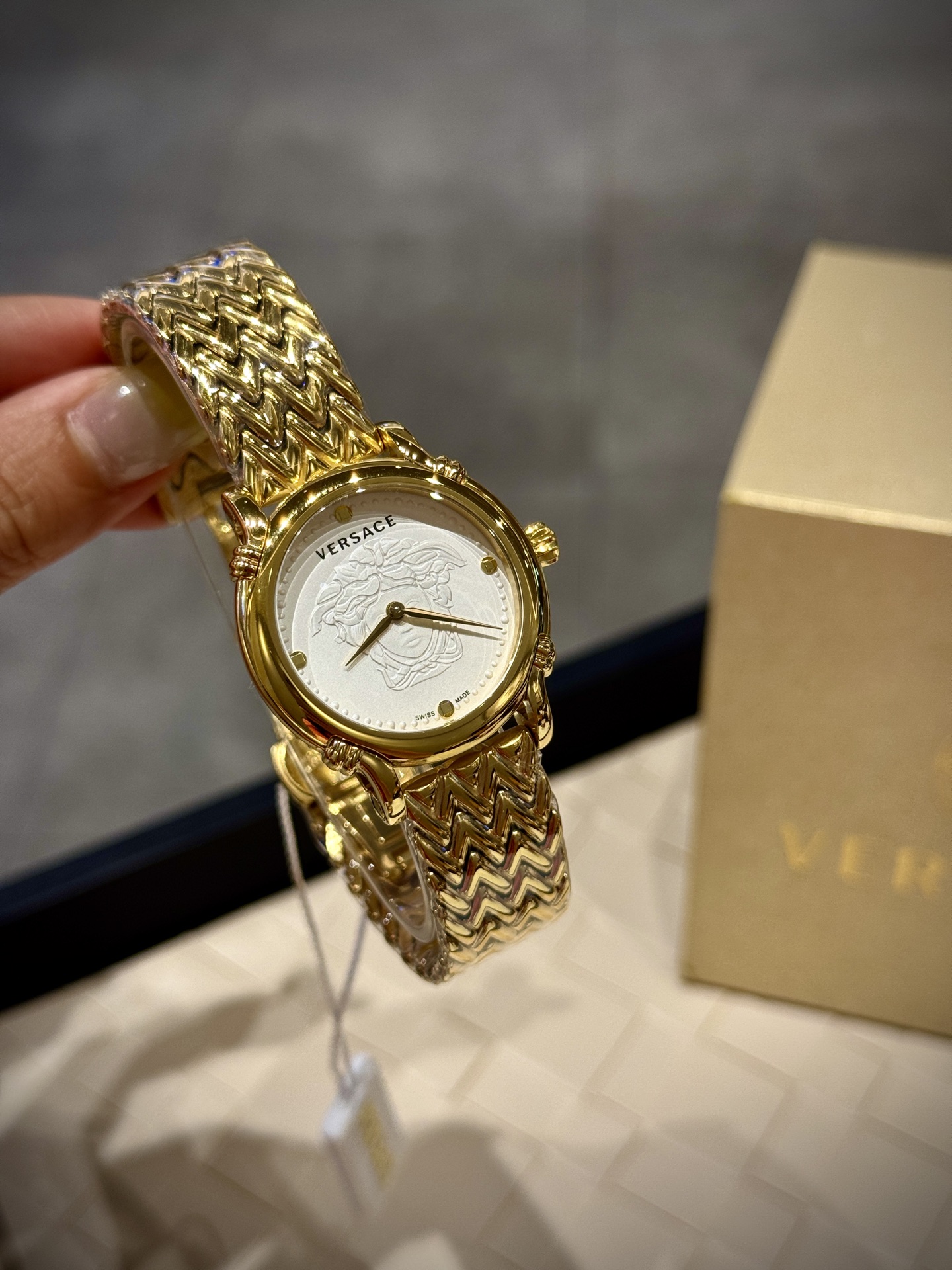 这款手表是AAAAA 1:1 质量 (非常棒). 使用了和原版一模一样的材料. 商标部分也保持了和范思哲/Versace一样. 图片拍摄是实物手表拍摄, 您所收到的实物保证和我们图片一模一样.