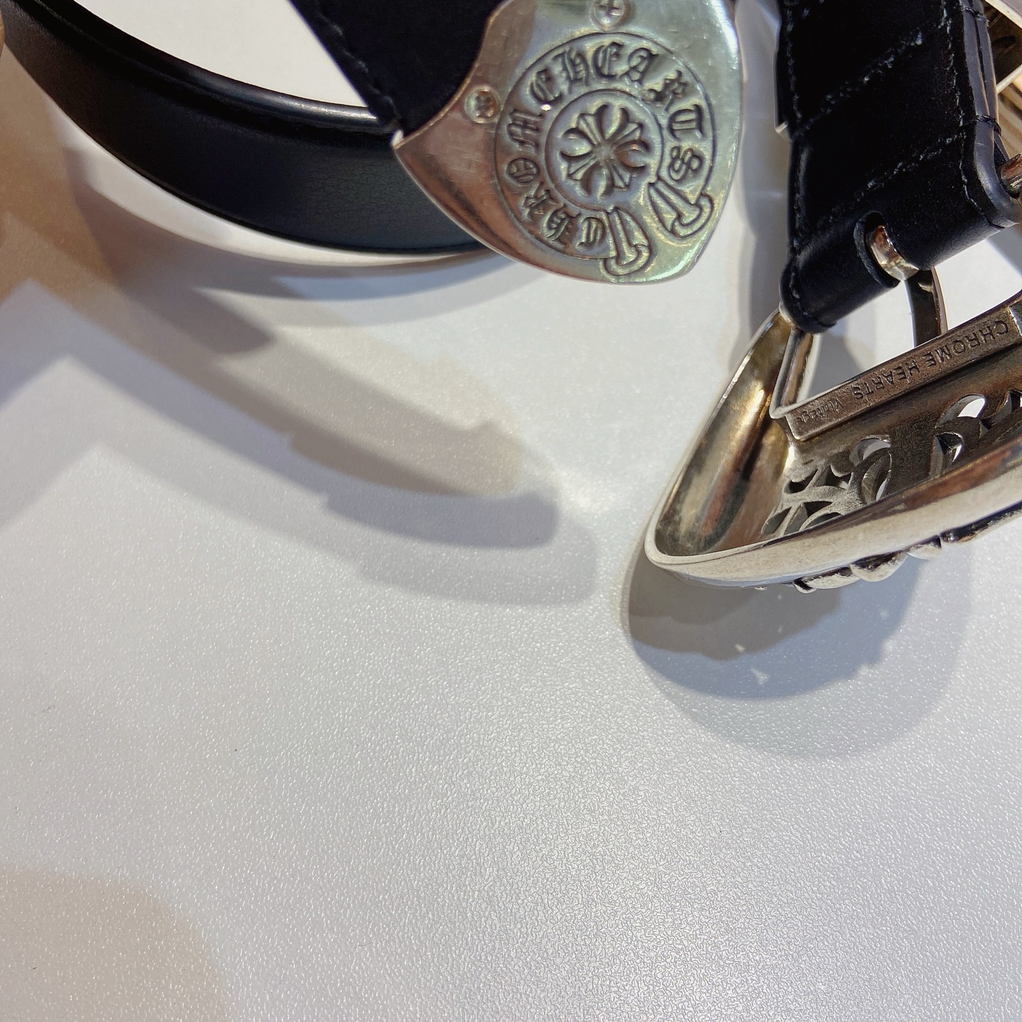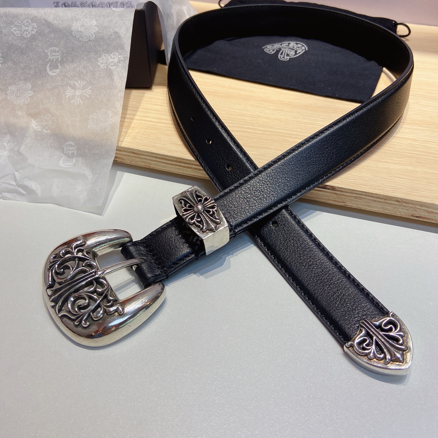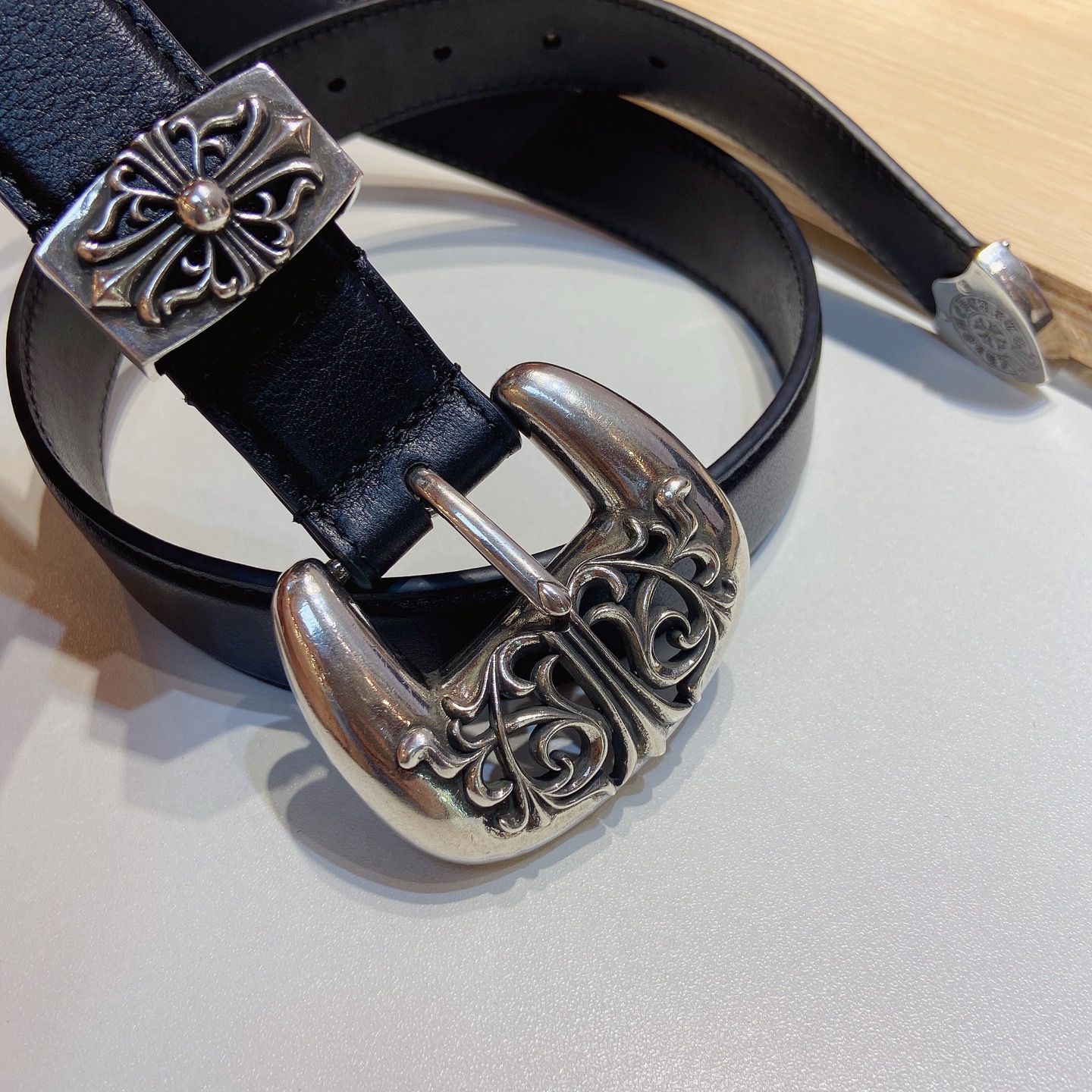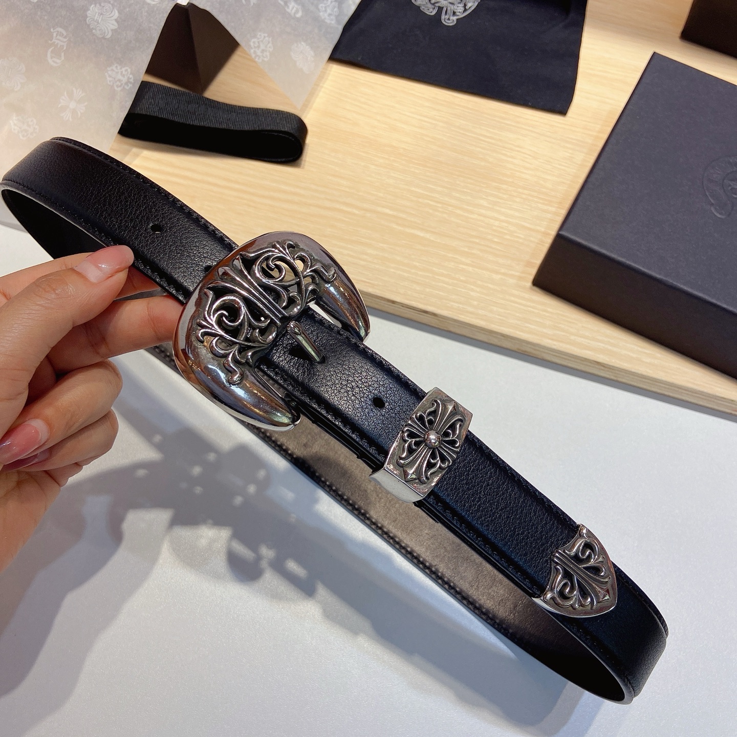 这款皮带是AAAAA 1:1 质量 (非常棒). 使用了和原版一模一样的材料. 商标部分也保持了和克罗心/Chrome Hearts一样. 图片拍摄是实物皮带拍摄, 您所收到的实物保证和我们图片一模一样.