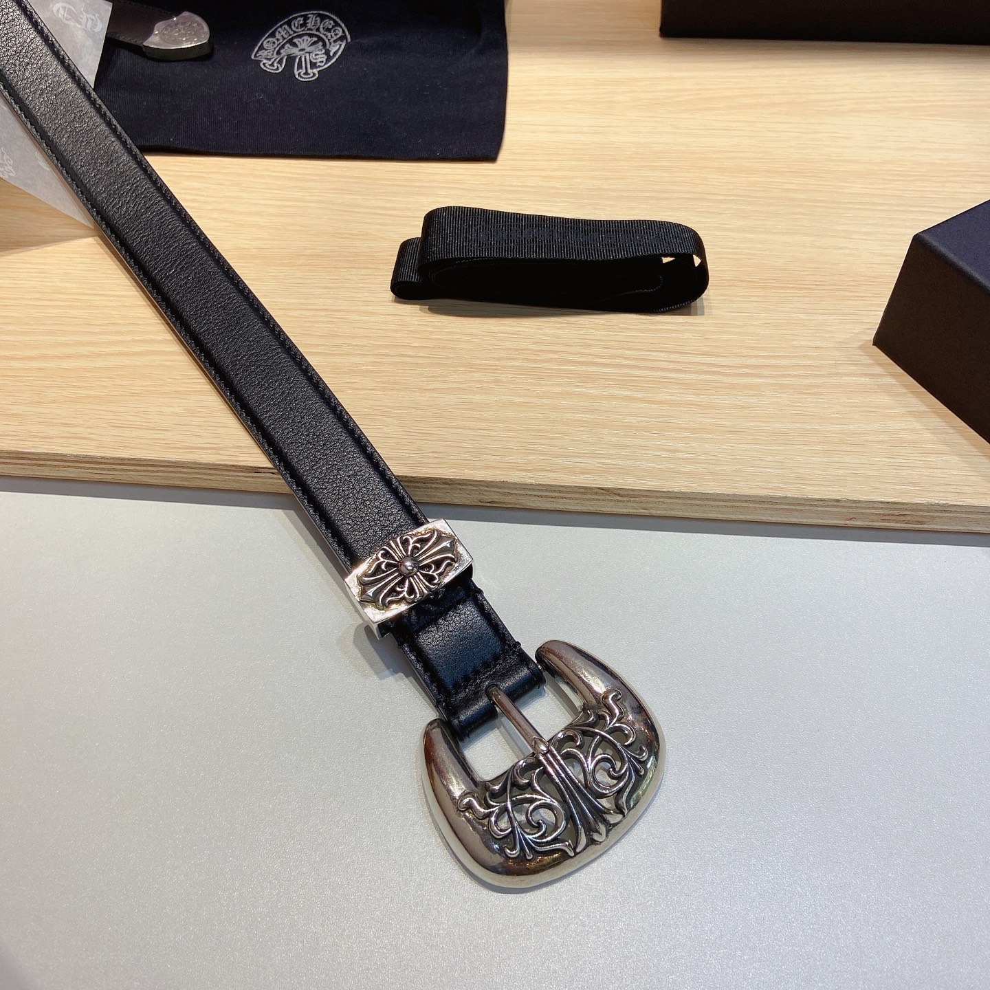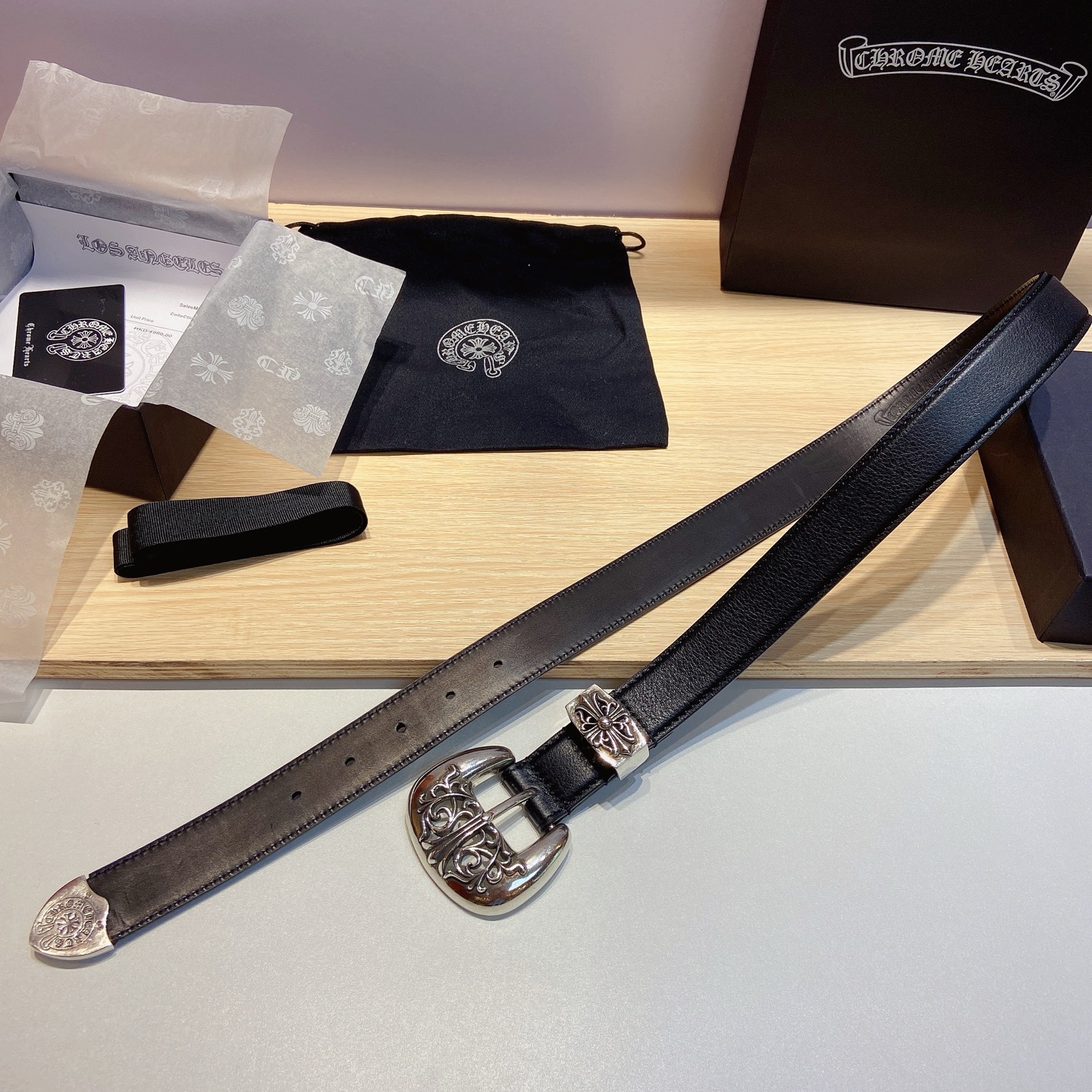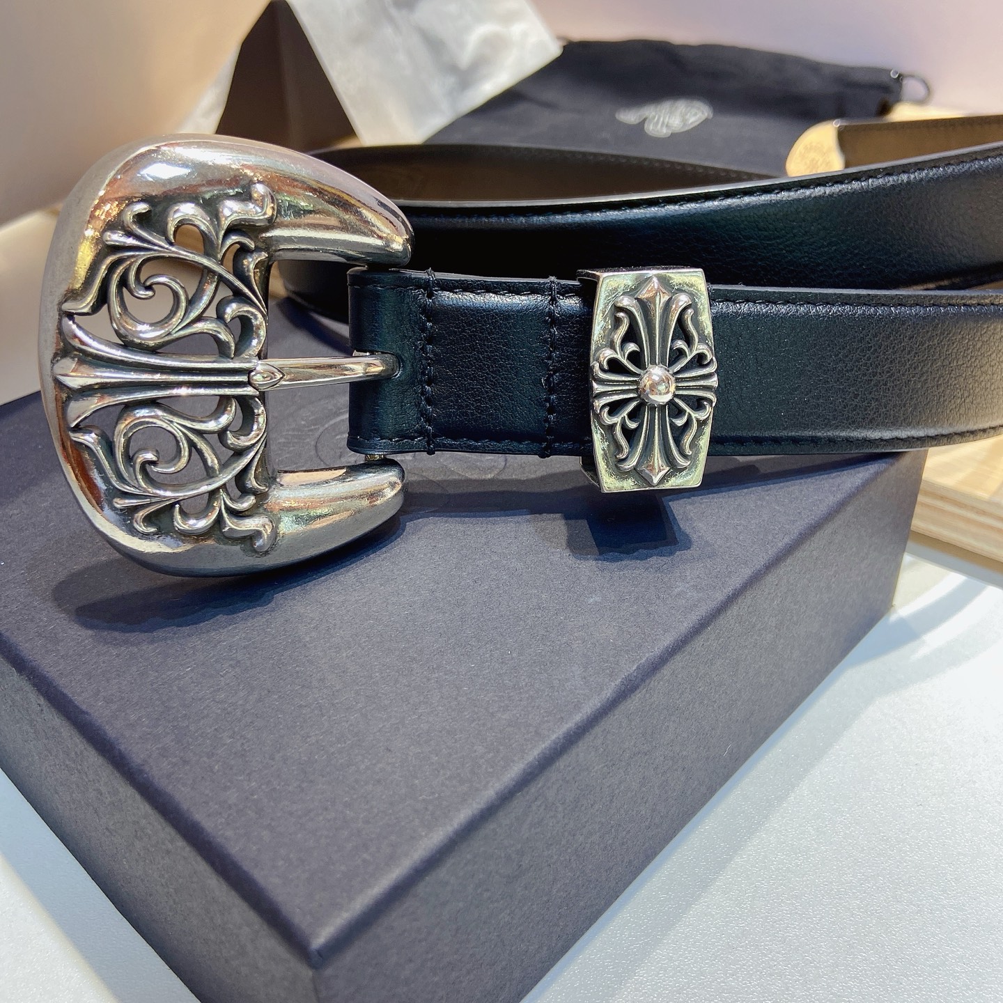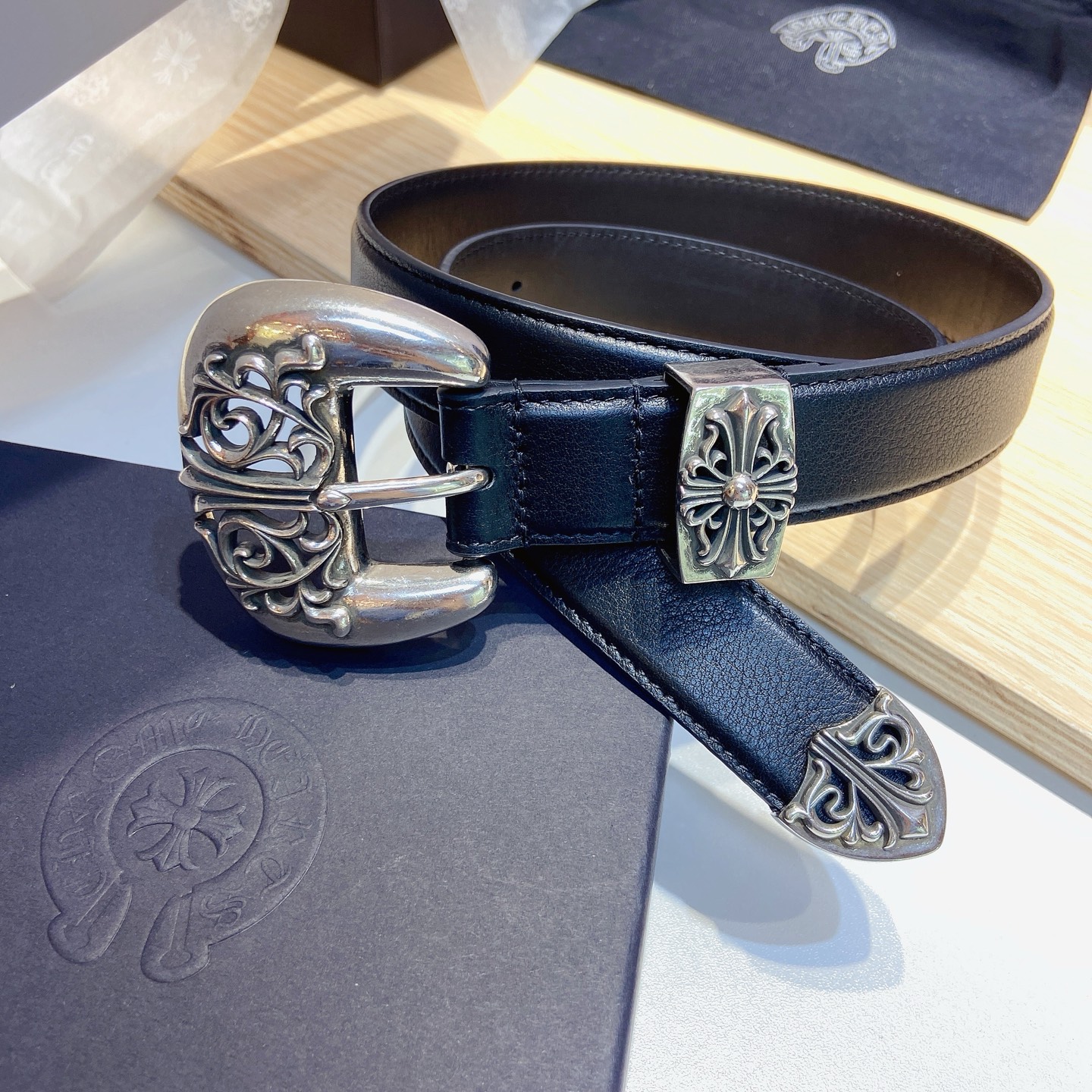 这款皮带是AAAAA 1:1 质量 (非常棒). 使用了和原版一模一样的材料. 商标部分也保持了和克罗心/Chrome Hearts一样. 图片拍摄是实物皮带拍摄, 您所收到的实物保证和我们图片一模一样.