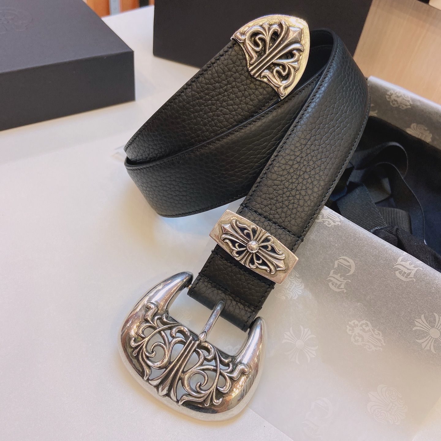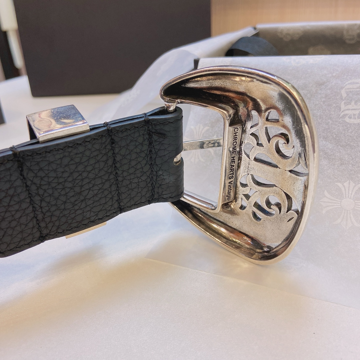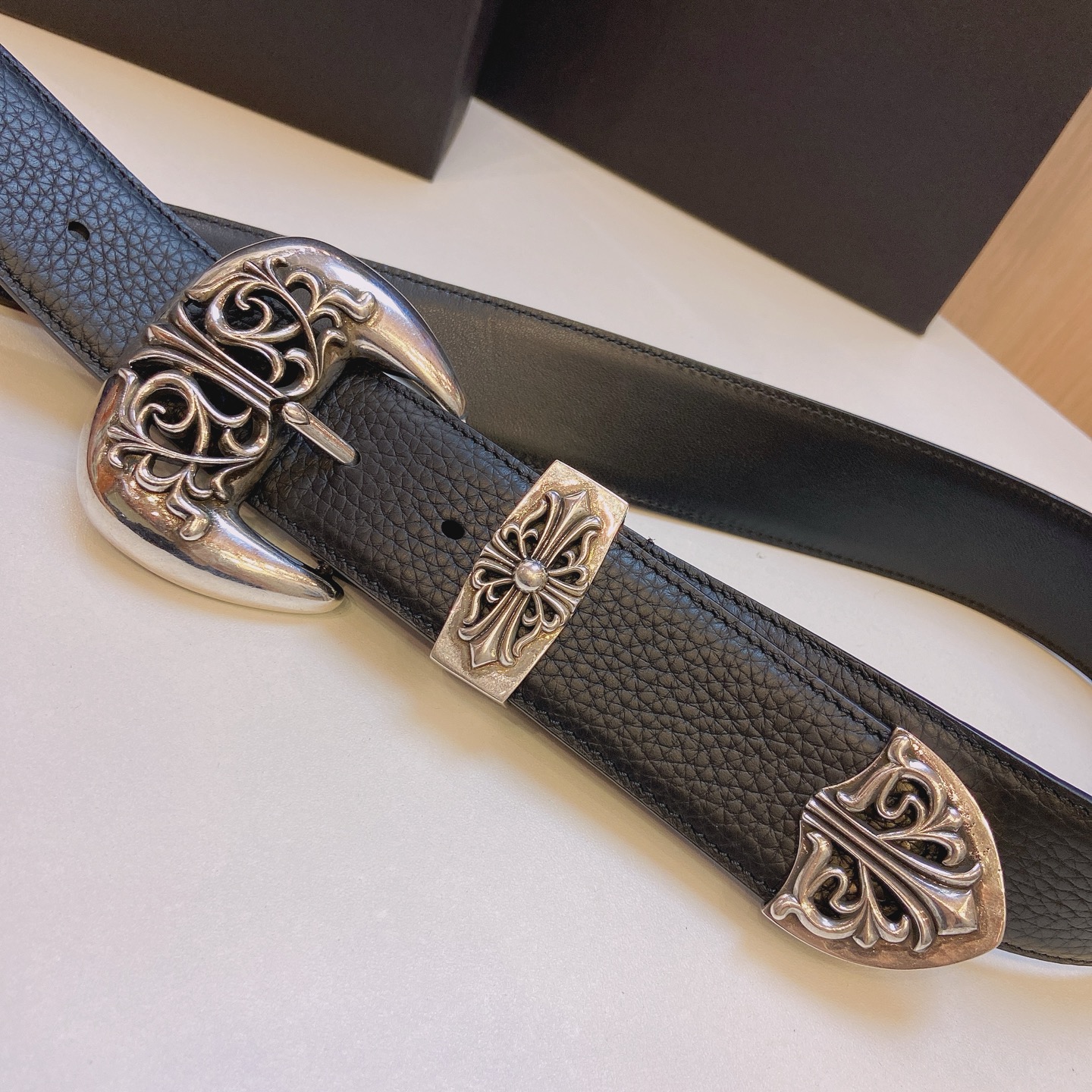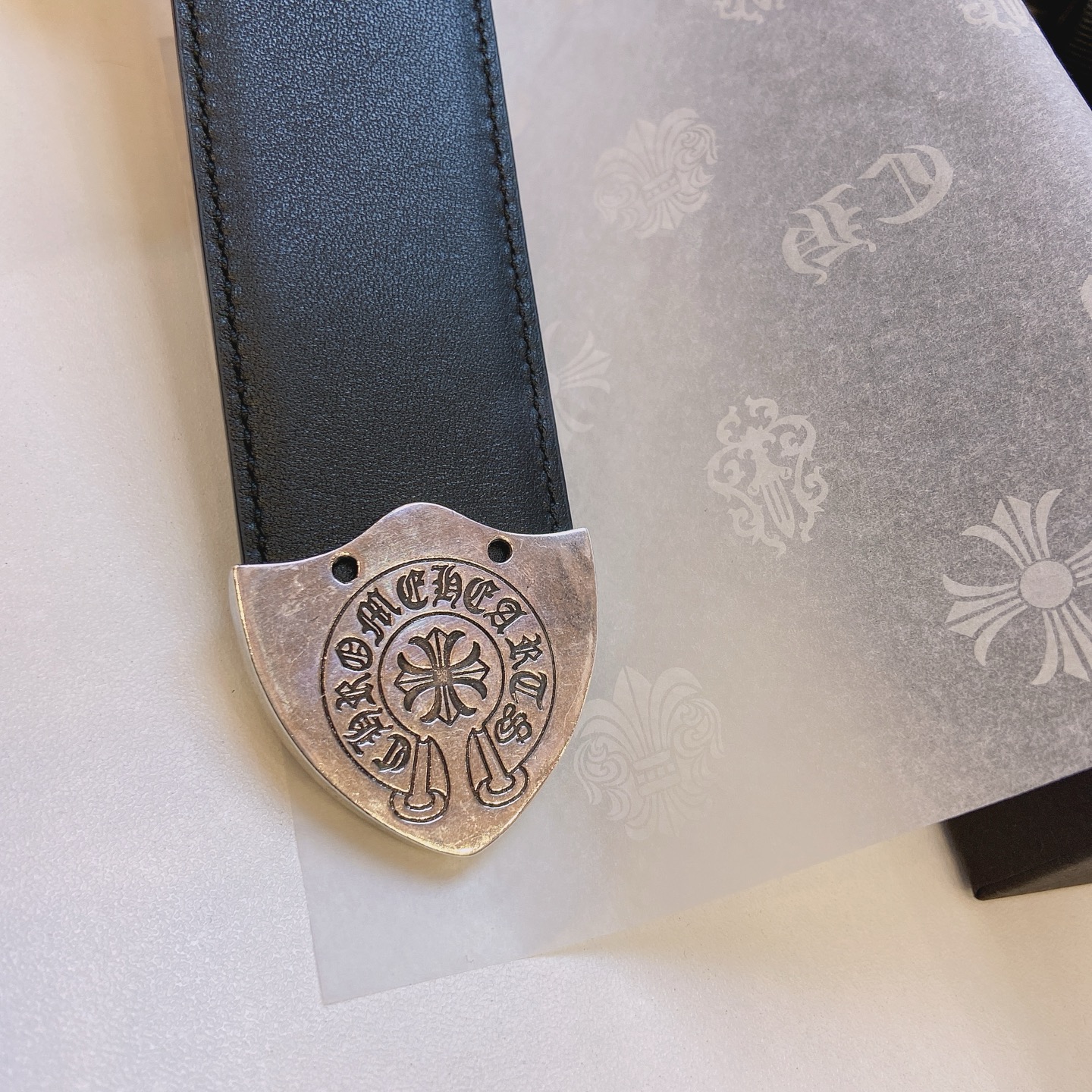 这款皮带是AAAAA 1:1 质量 (非常棒). 使用了和原版一模一样的材料. 商标部分也保持了和克罗心/Chrome Hearts一样. 图片拍摄是实物皮带拍摄, 您所收到的实物保证和我们图片一模一样.