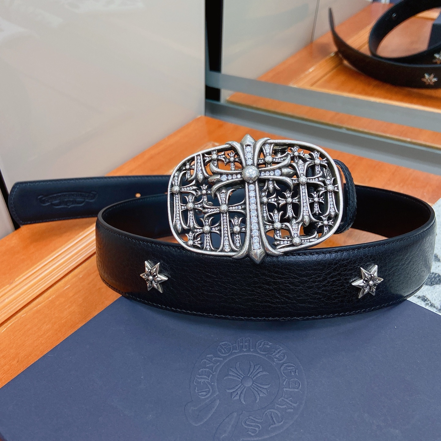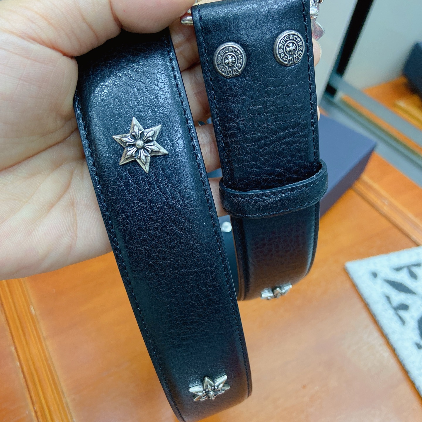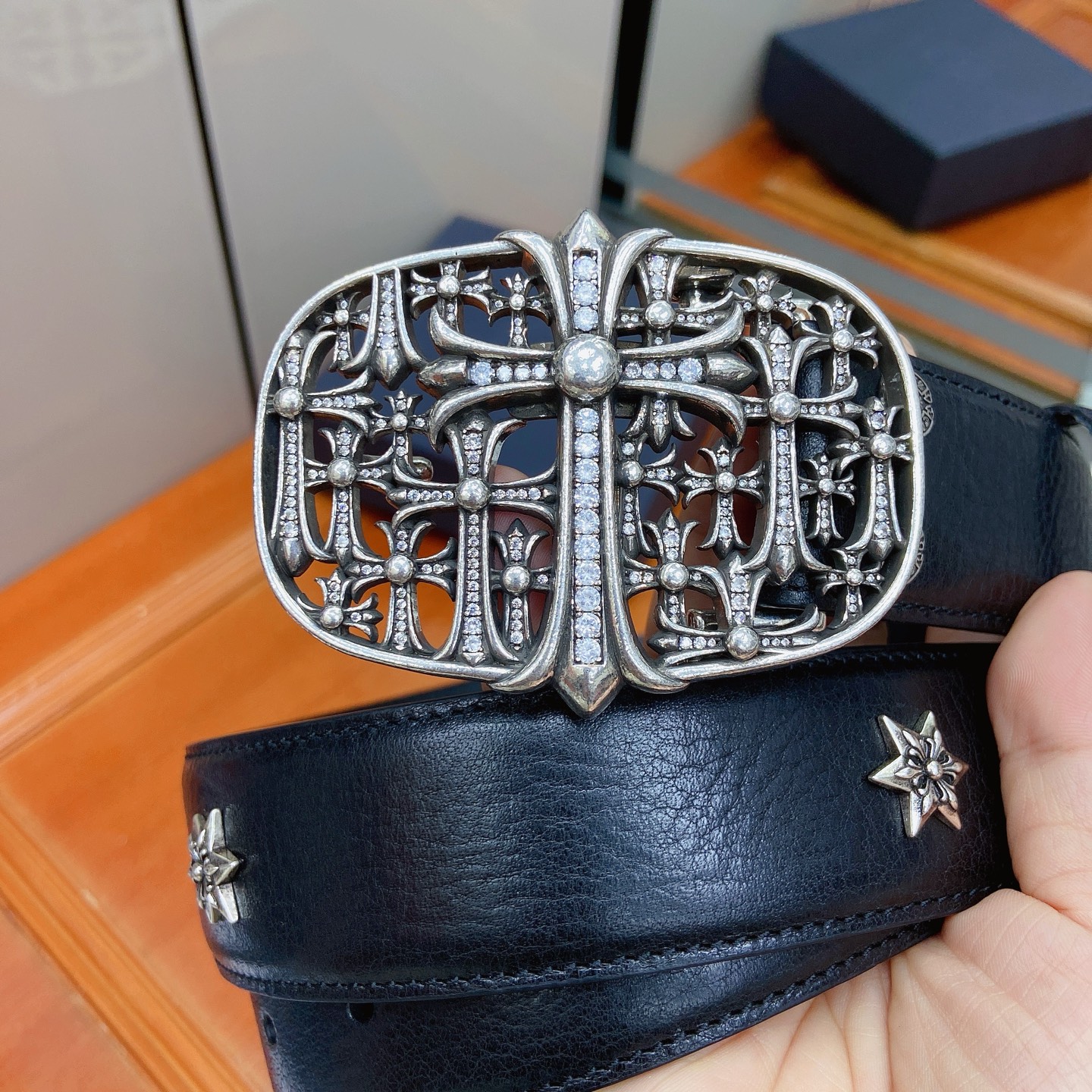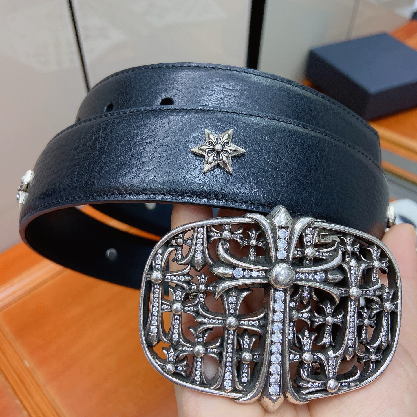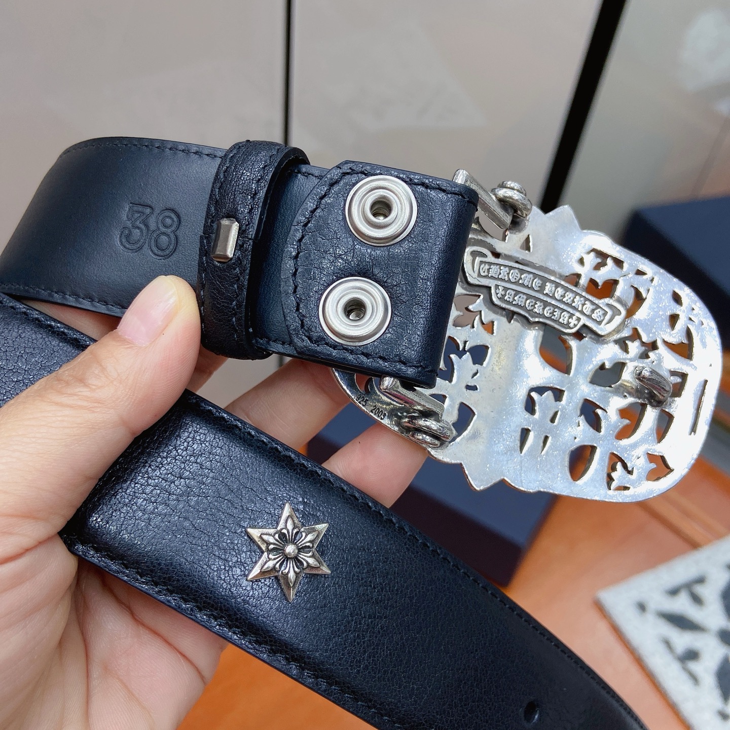这款皮带是AAAAA 1:1 质量 (非常棒). 使用了和原版一模一样的材料. 商标部分也保持了和克罗心/Chrome Hearts一样. 图片拍摄是实物皮带拍摄, 您所收到的实物保证和我们图片一模一样.