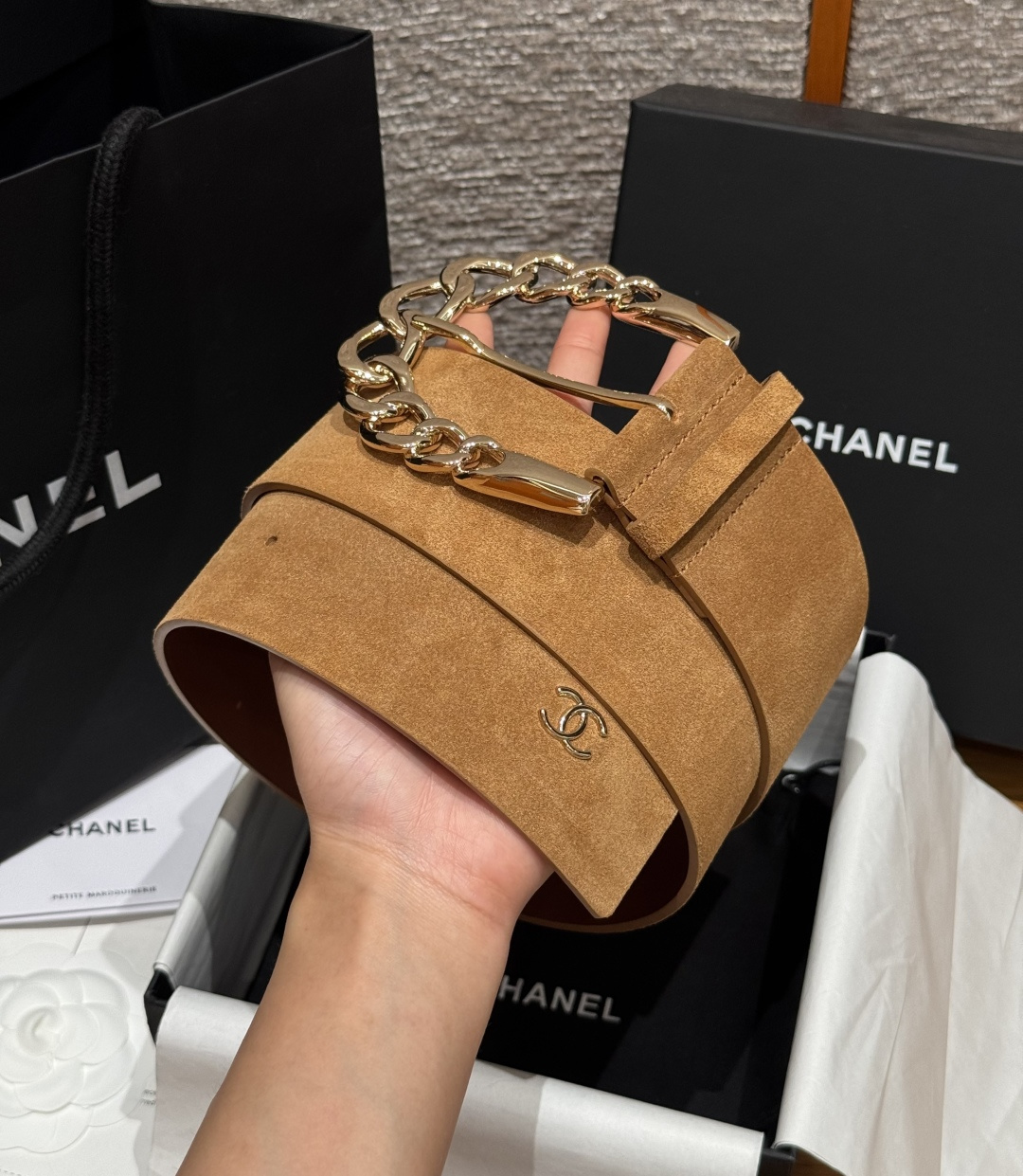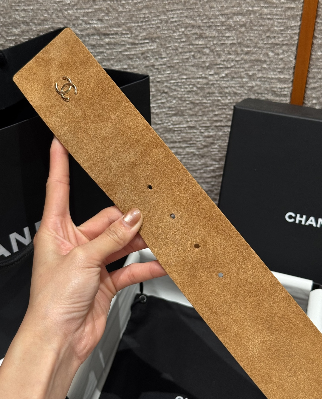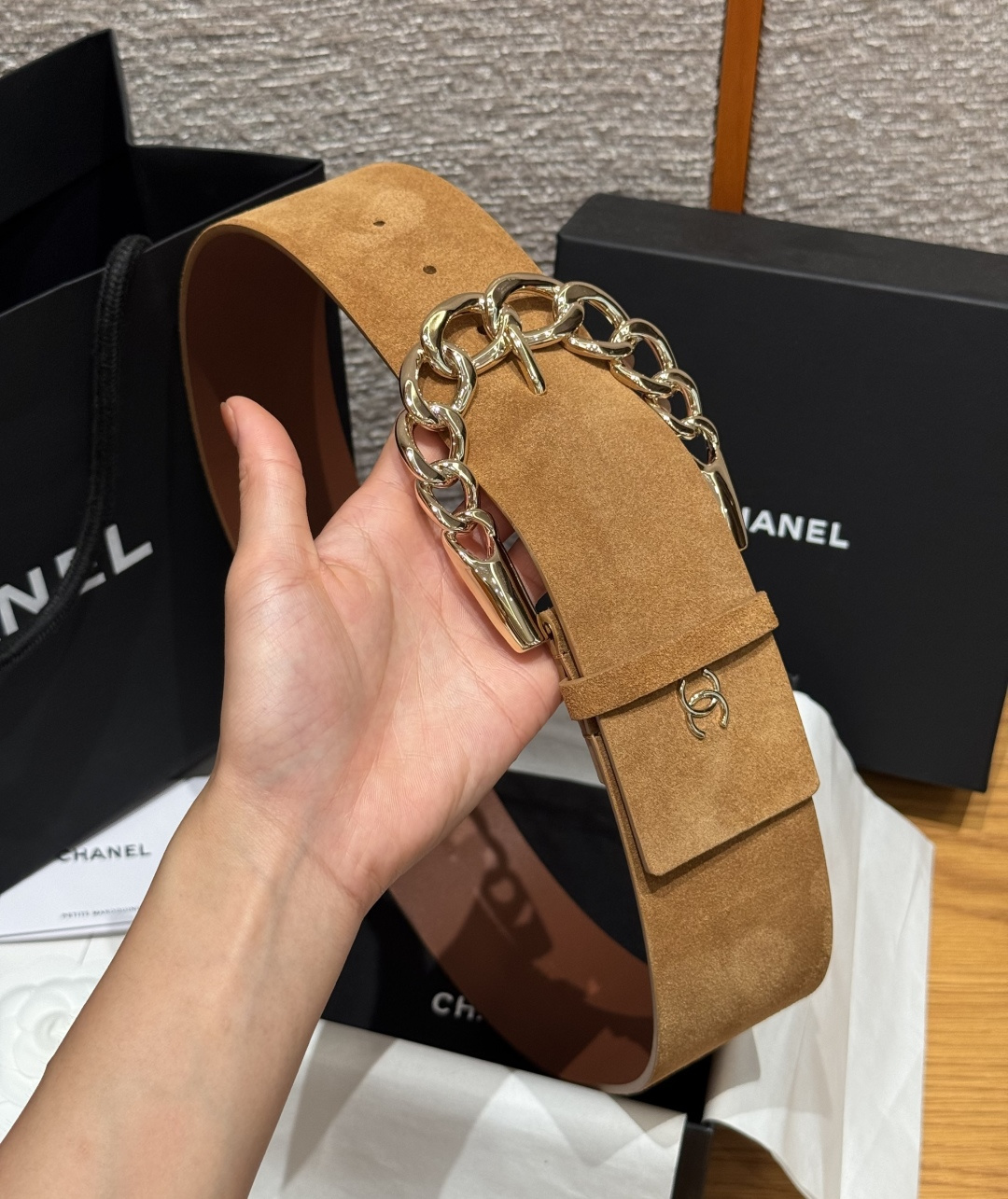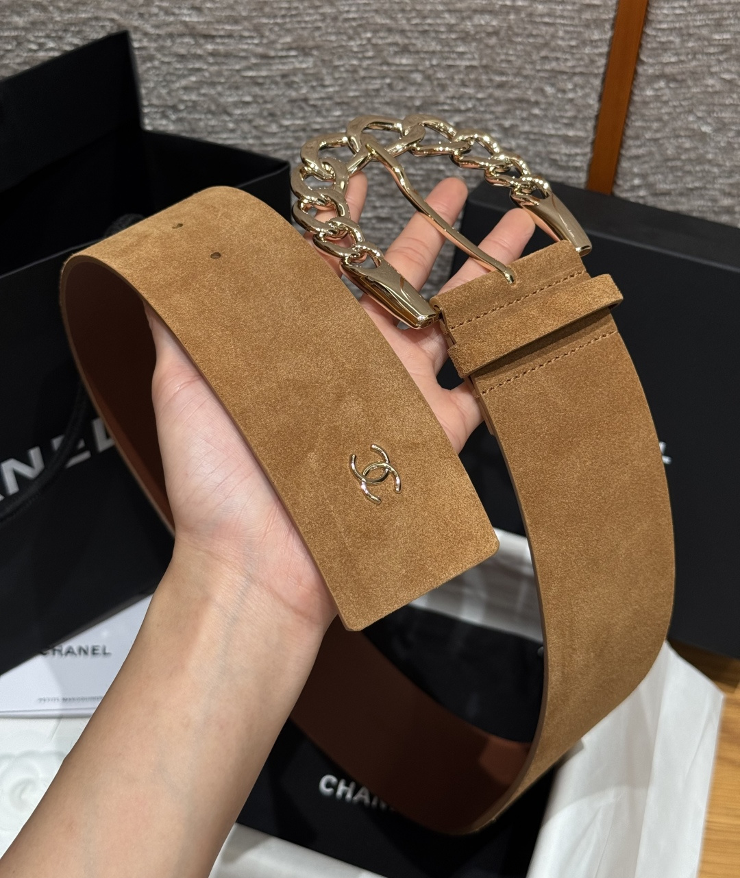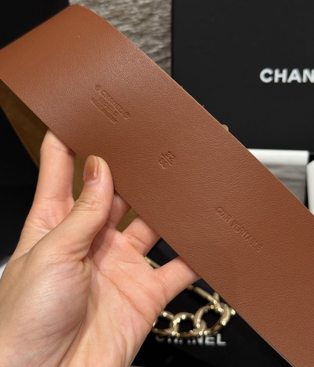 这款皮带是AAAAA 1:1 质量 (非常棒). 使用了和原版一模一样的材料. 商标部分也保持了和香奈儿/Chanel一样. 图片拍摄是实物皮带拍摄, 您所收到的实物保证和我们图片一模一样.