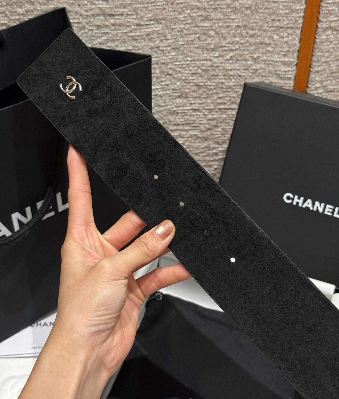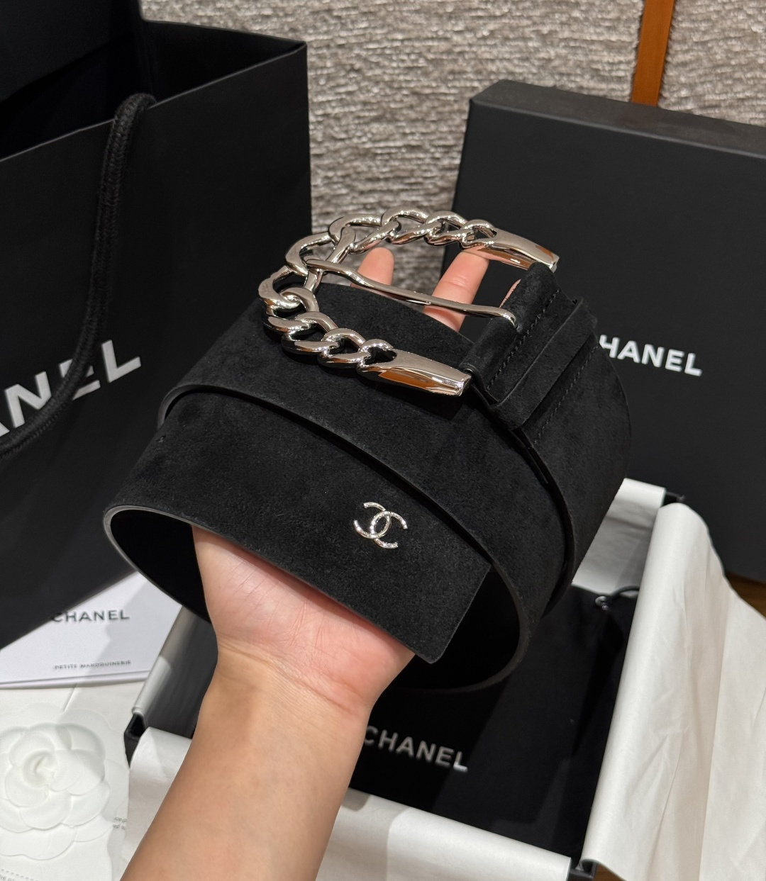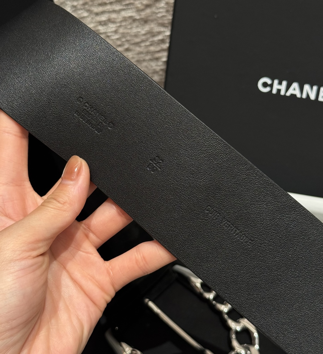 这款皮带是AAAAA 1:1 质量 (非常棒). 使用了和原版一模一样的材料. 商标部分也保持了和香奈儿/Chanel一样. 图片拍摄是实物皮带拍摄, 您所收到的实物保证和我们图片一模一样.