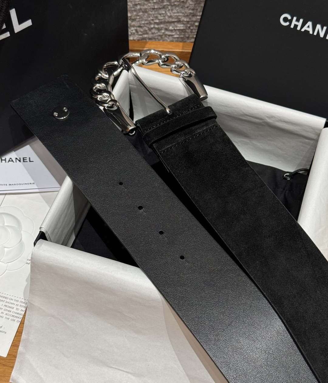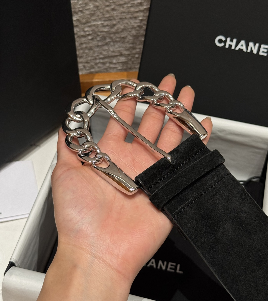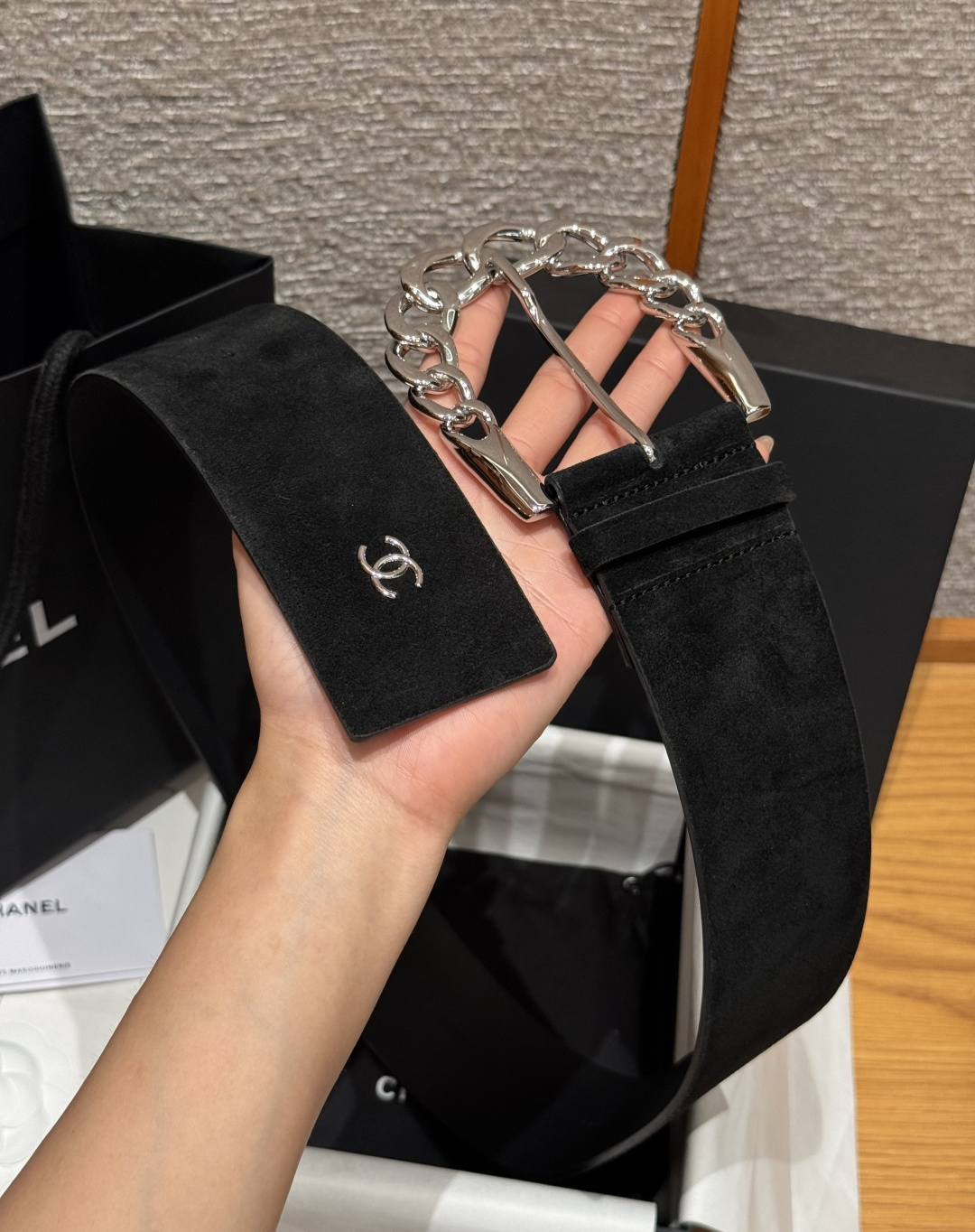 这款皮带是AAAAA 1:1 质量 (非常棒). 使用了和原版一模一样的材料. 商标部分也保持了和香奈儿/Chanel一样. 图片拍摄是实物皮带拍摄, 您所收到的实物保证和我们图片一模一样.