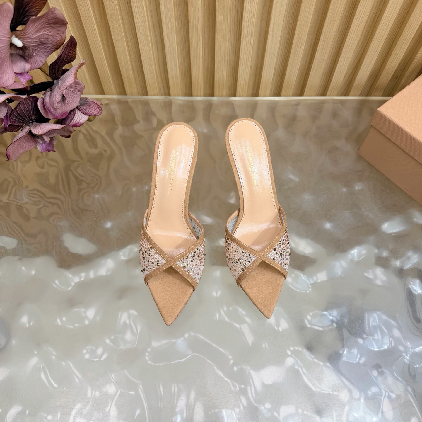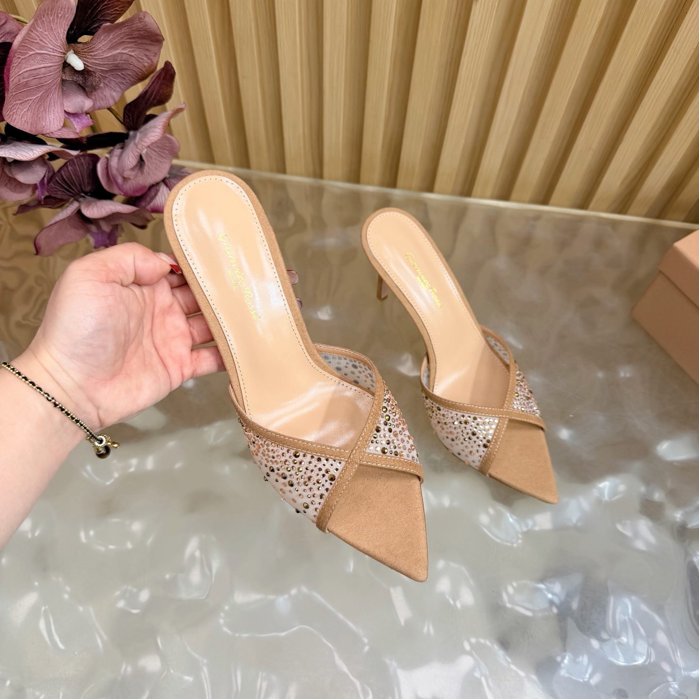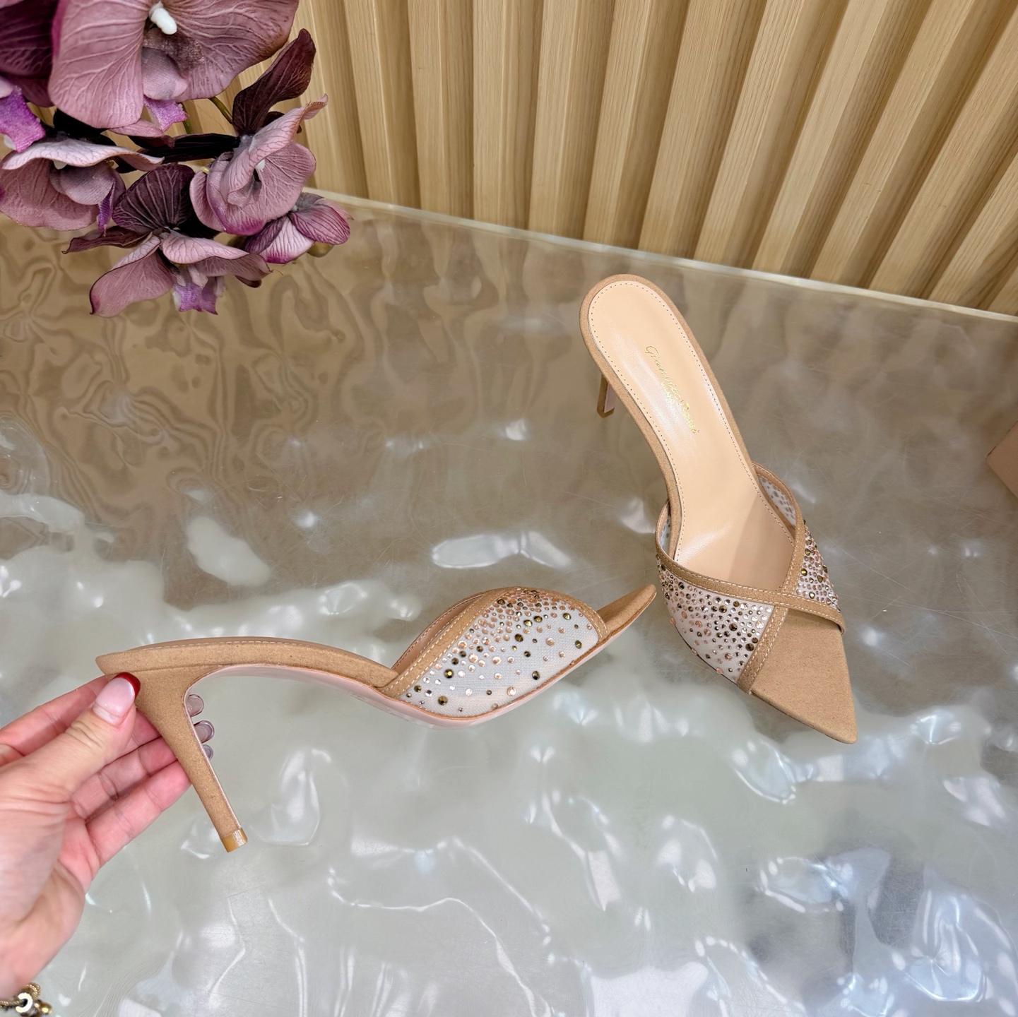 这款鞋子是AAAAA 1:1 质量 (非常棒). 使用了和原版一模一样的材料. 商标部分也保持了和Gianvito Rossi一样. 图片拍摄是实物鞋子拍摄, 您所收到的实物保证和我们图片一模一样.