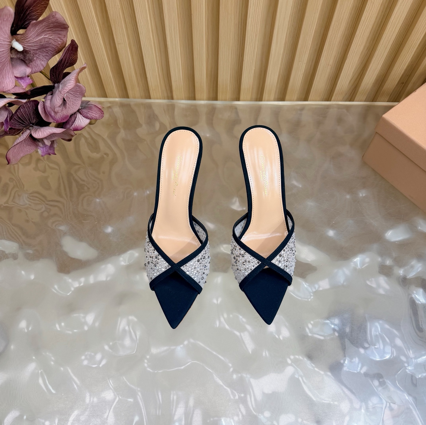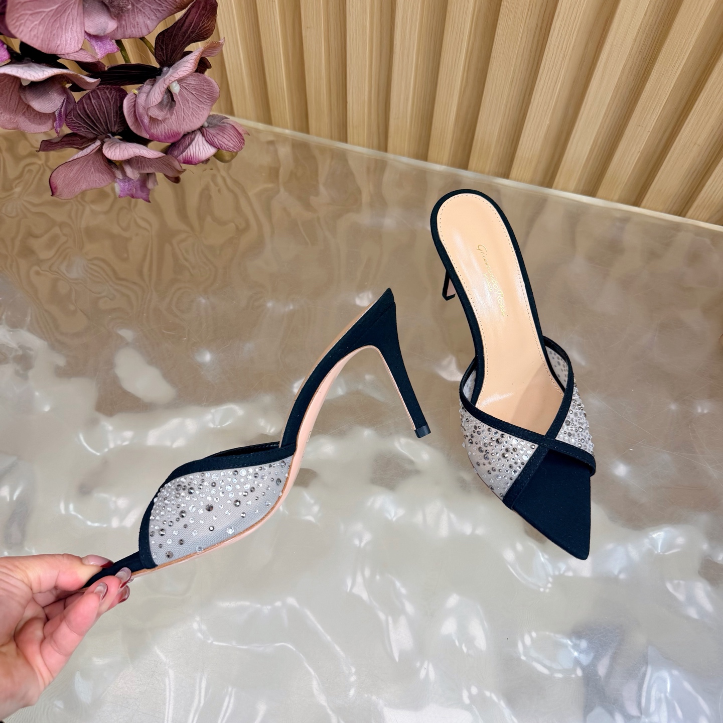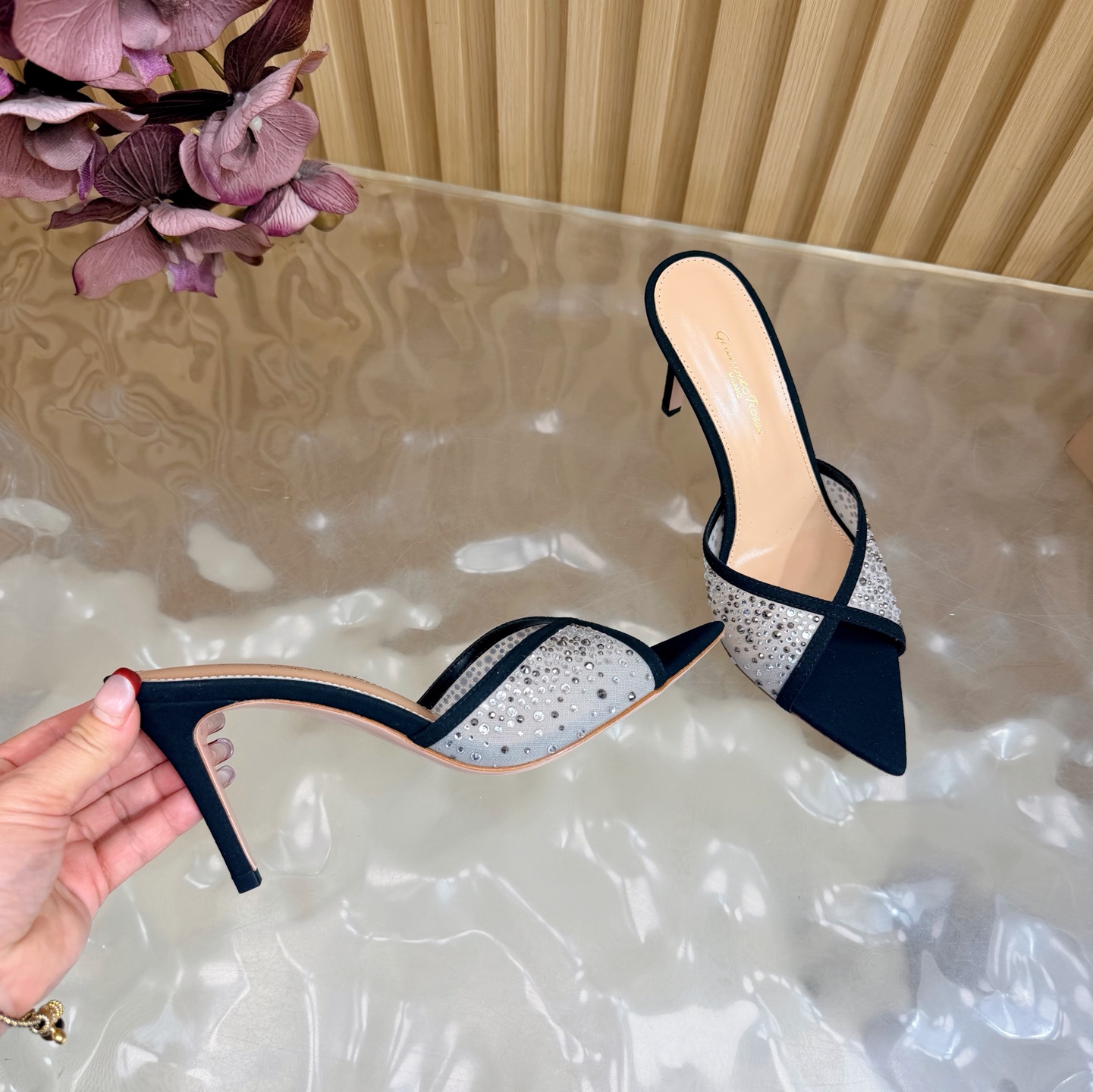 这款鞋子是AAAAA 1:1 质量 (非常棒). 使用了和原版一模一样的材料. 商标部分也保持了和Gianvito Rossi一样. 图片拍摄是实物鞋子拍摄, 您所收到的实物保证和我们图片一模一样.