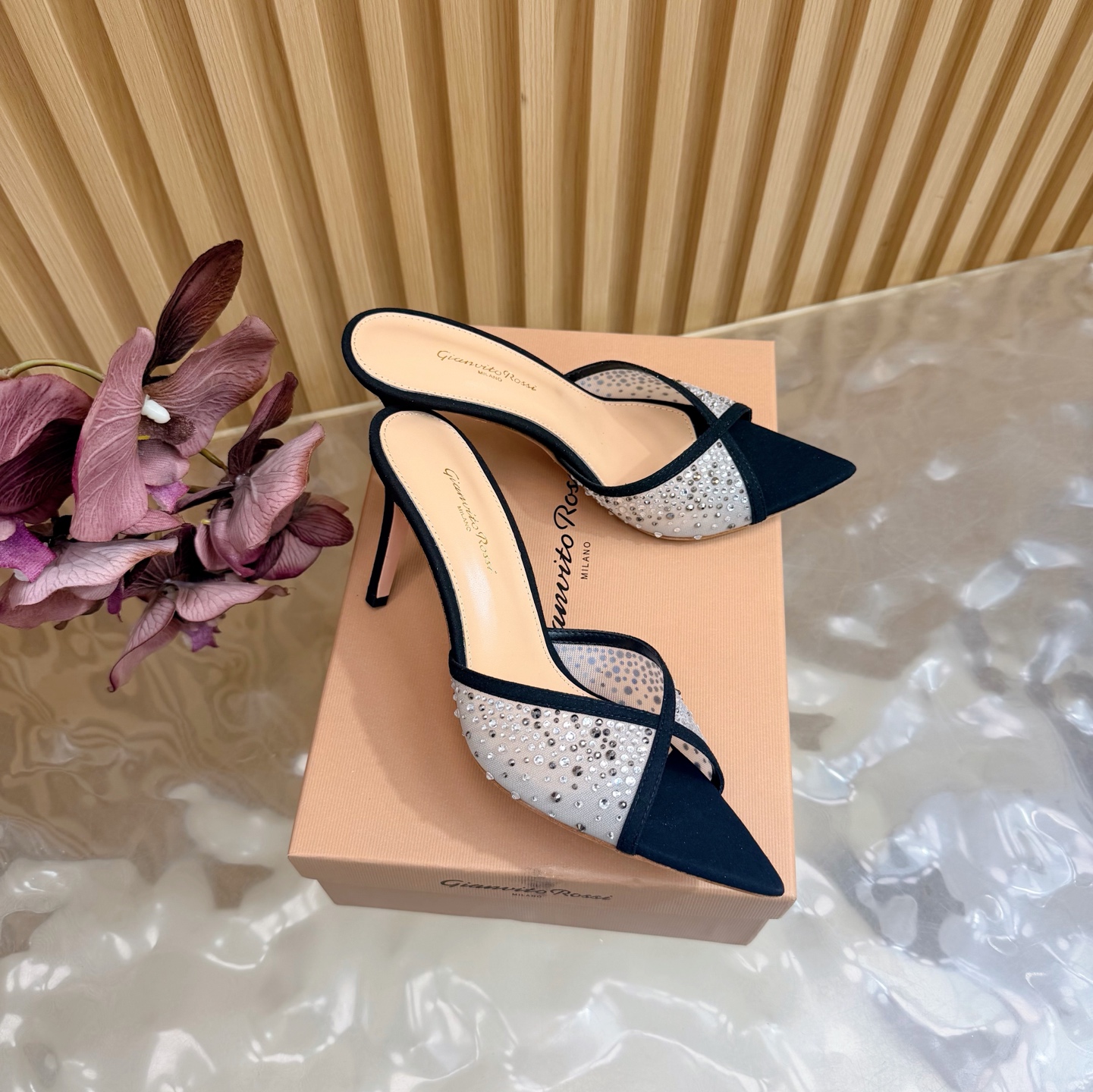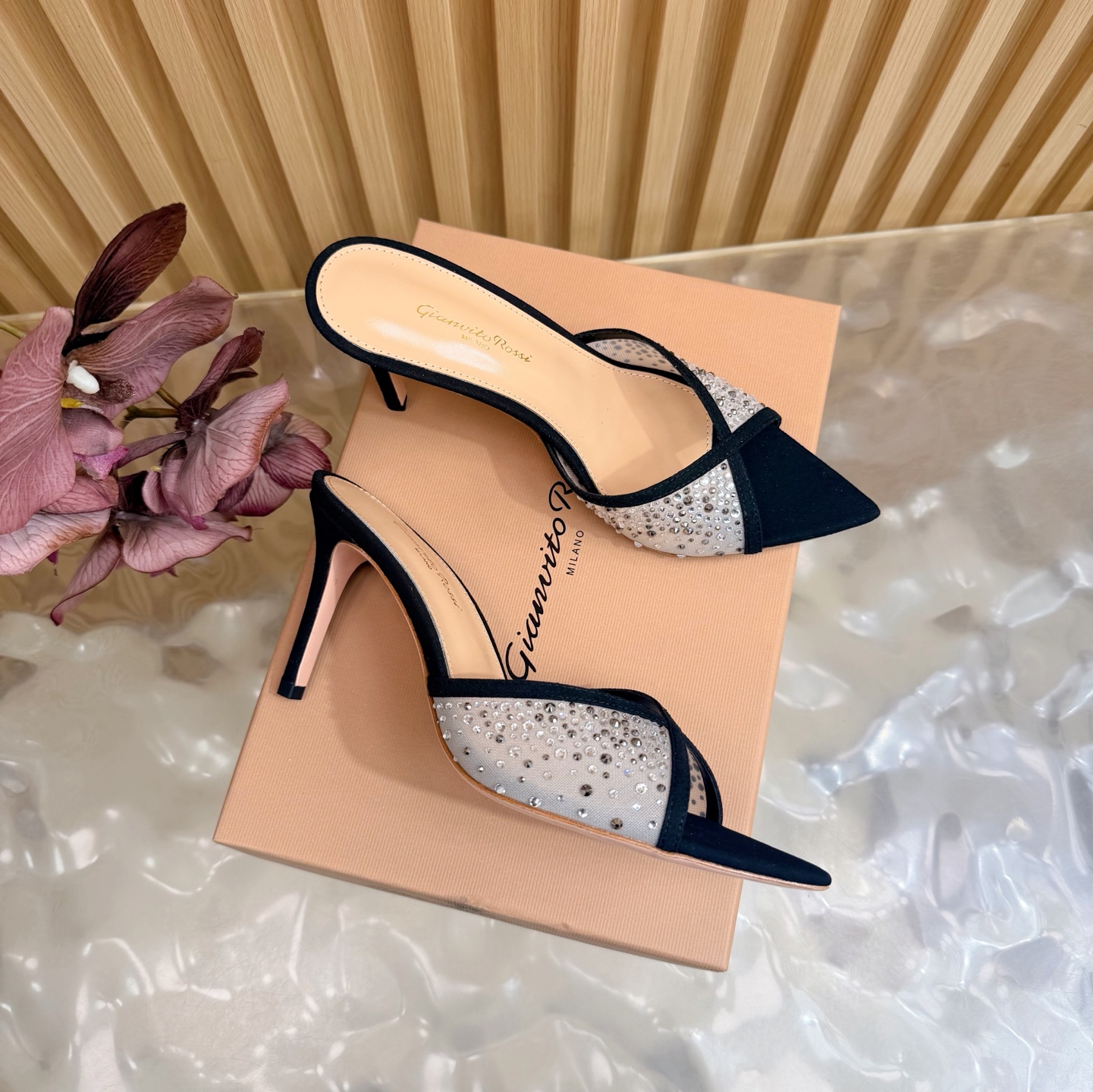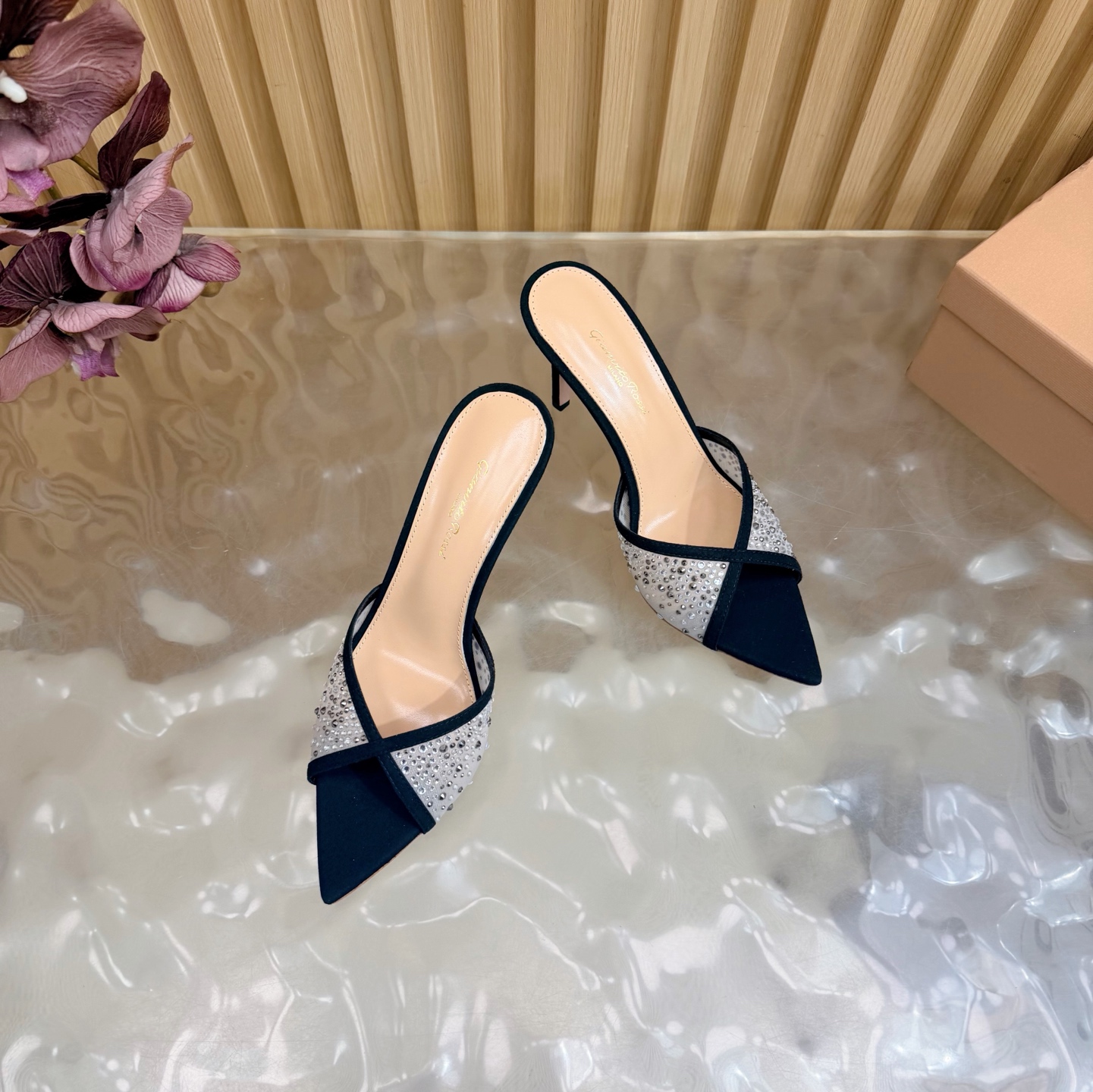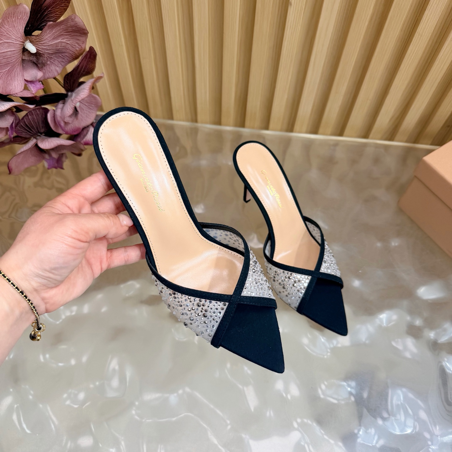 这款鞋子是AAAAA 1:1 质量 (非常棒). 使用了和原版一模一样的材料. 商标部分也保持了和Gianvito Rossi一样. 图片拍摄是实物鞋子拍摄, 您所收到的实物保证和我们图片一模一样.