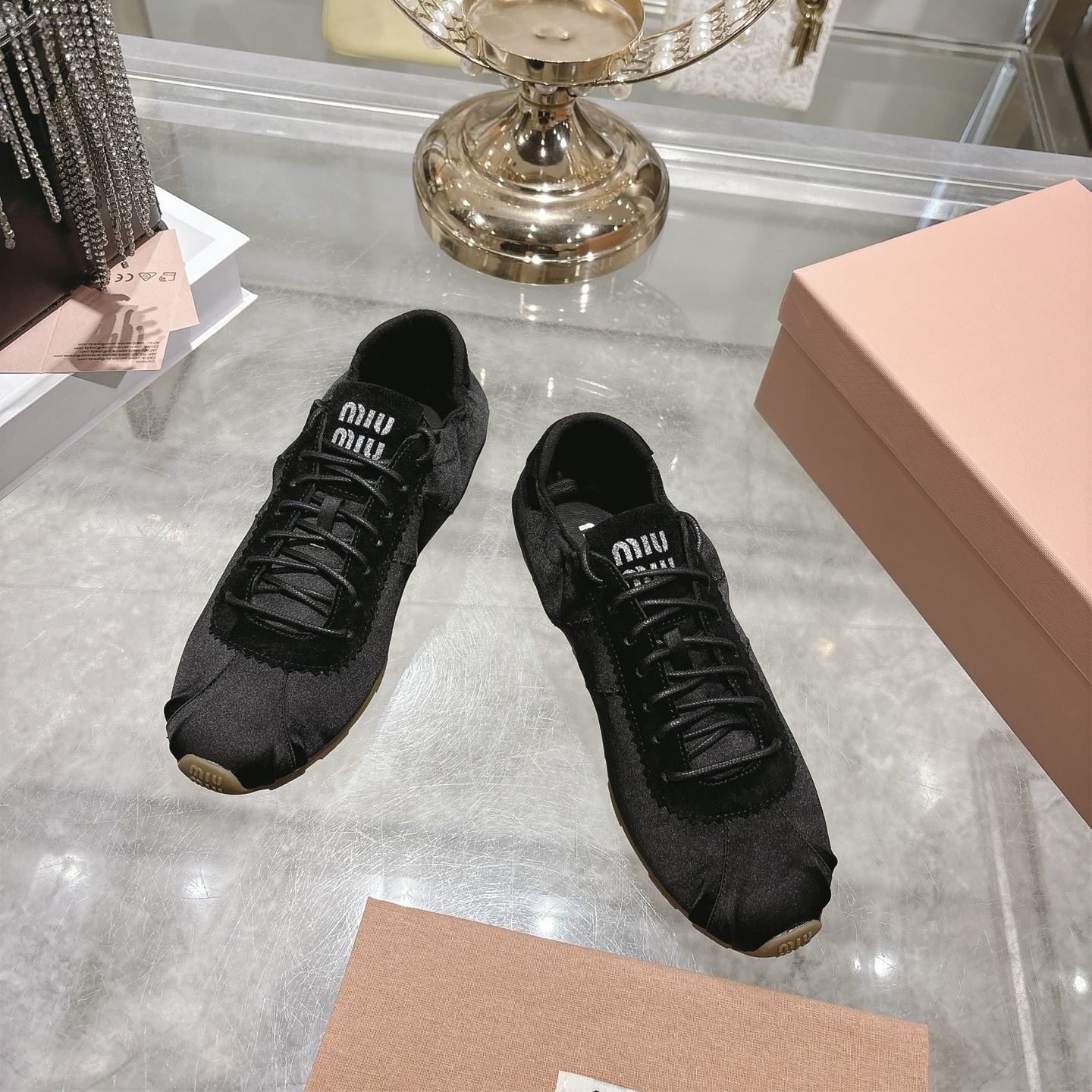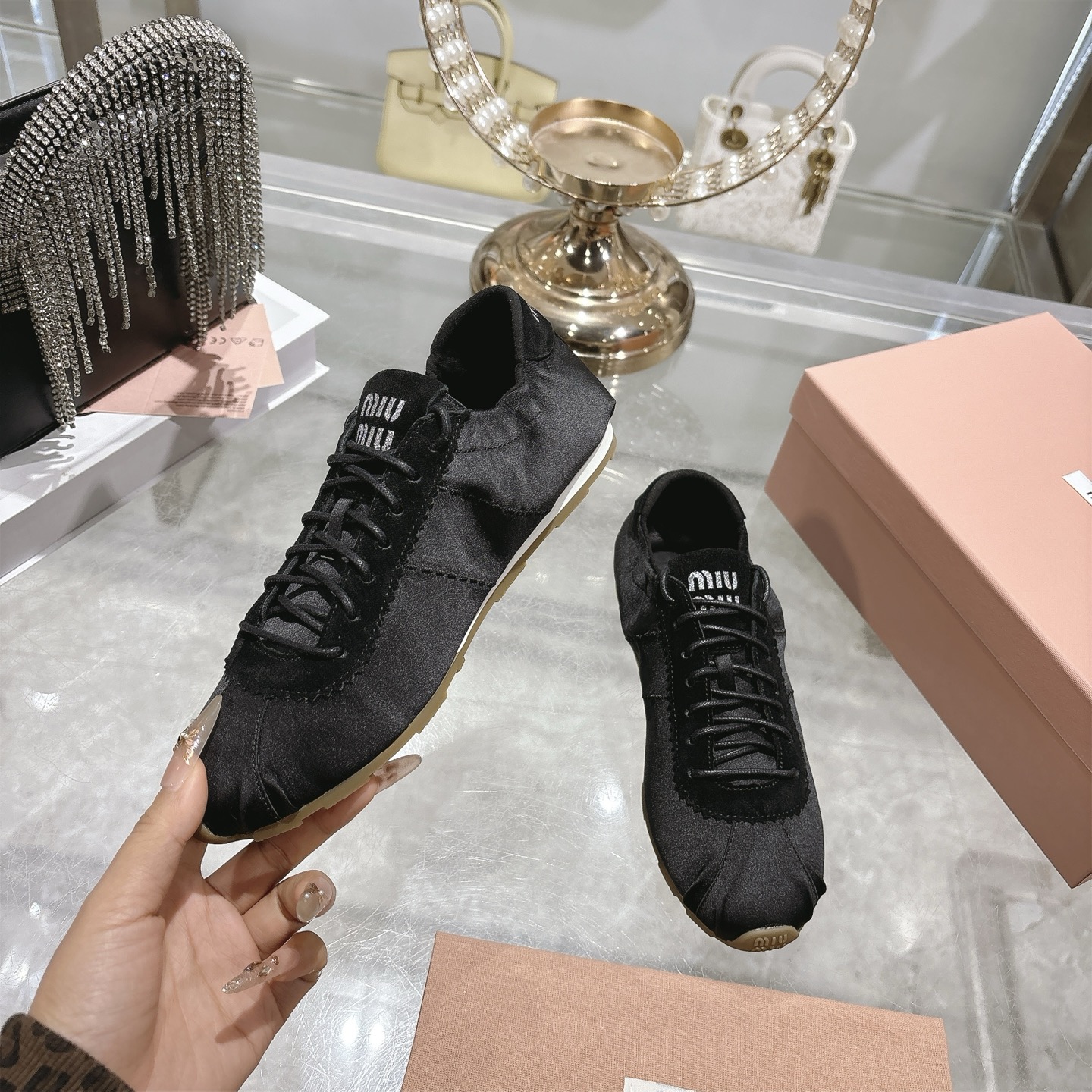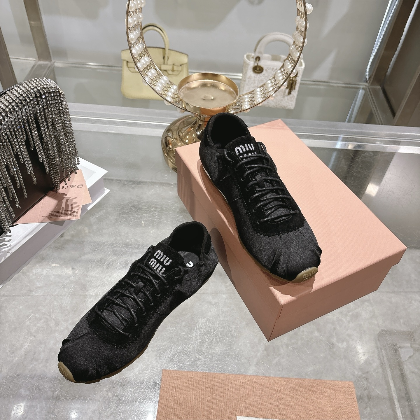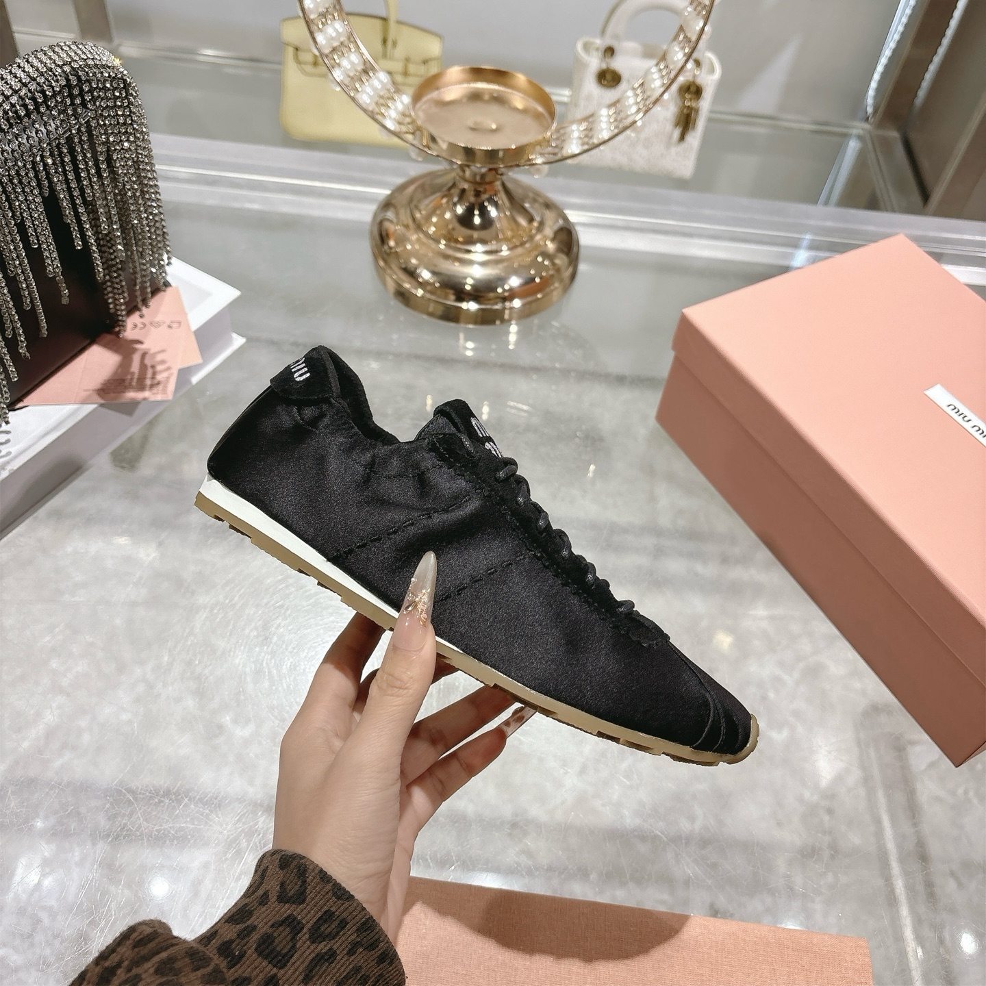 这款鞋子是AAAAA 1:1 质量 (非常棒). 使用了和原版一模一样的材料. 商标部分也保持了和缪缪/Miu Miu一样. 图片拍摄是实物鞋子拍摄, 您所收到的实物保证和我们图片一模一样.