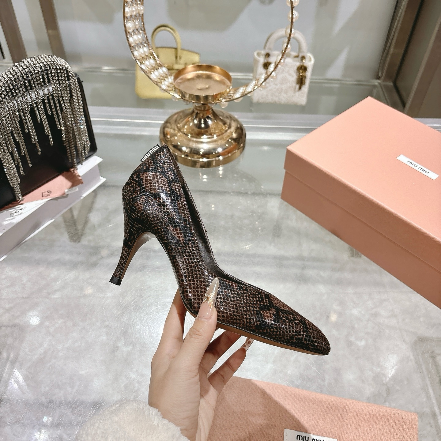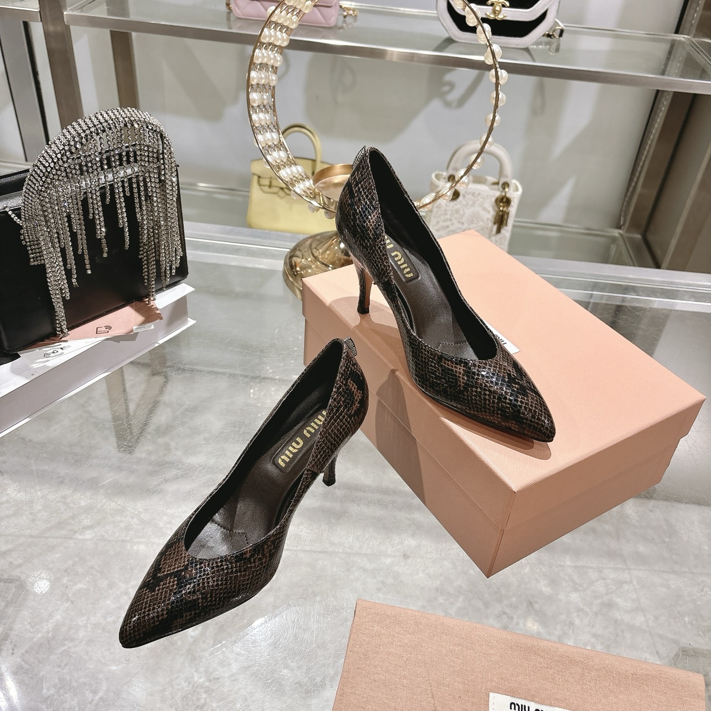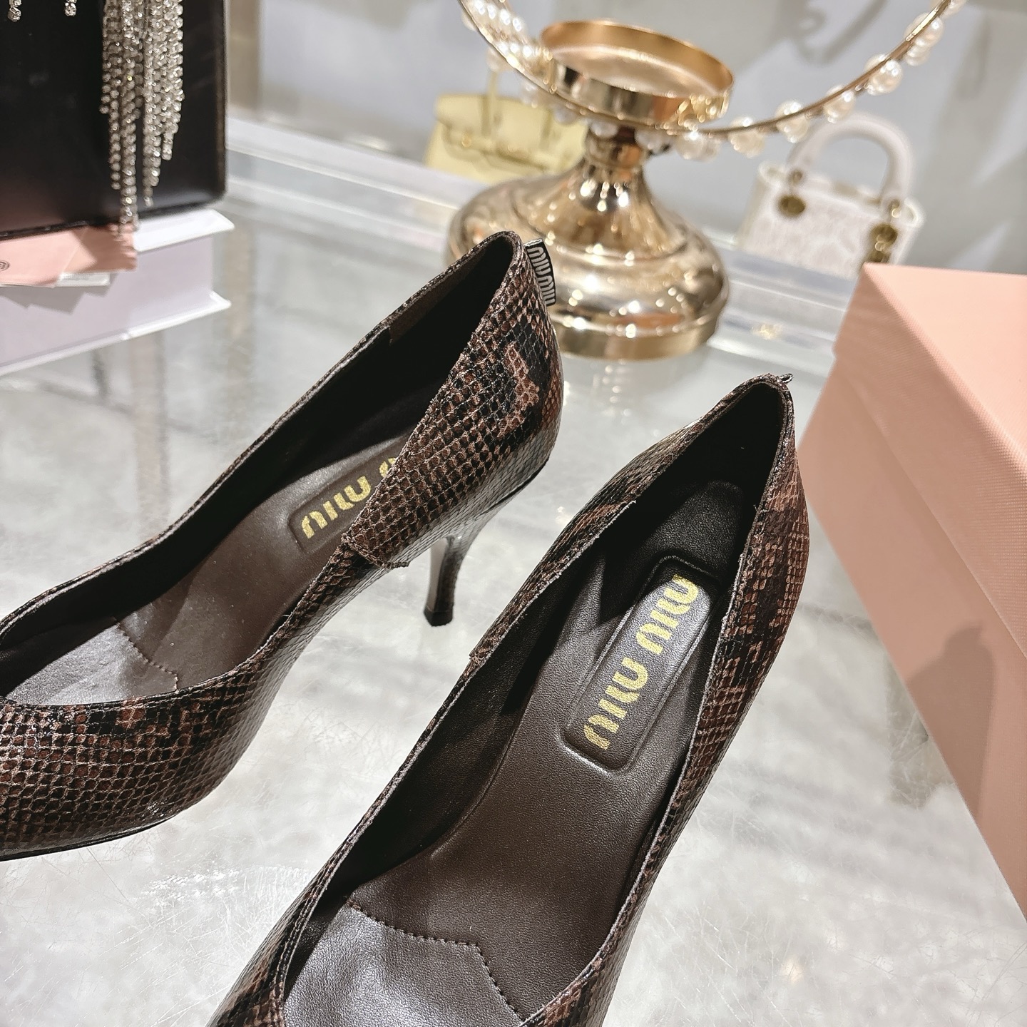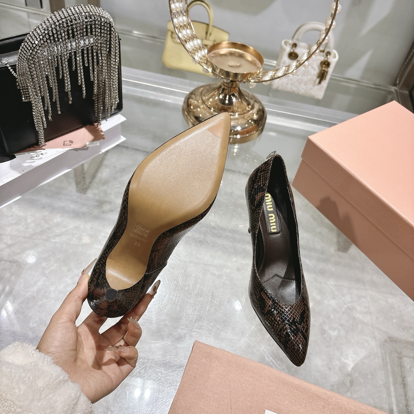 这款鞋子是AAAAA 1:1 质量 (非常棒). 使用了和原版一模一样的材料. 商标部分也保持了和缪缪/Miu Miu一样. 图片拍摄是实物鞋子拍摄, 您所收到的实物保证和我们图片一模一样.