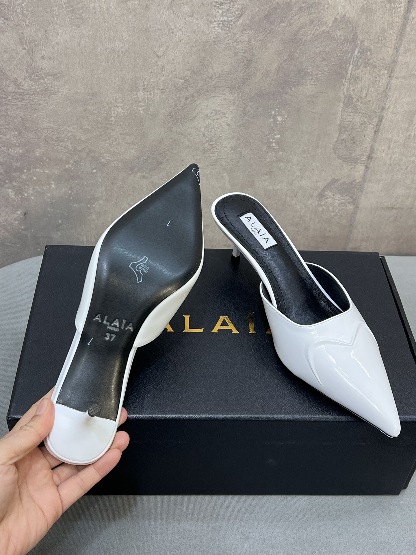 这款鞋子是AAAAA 1:1 质量 (非常棒). 使用了和原版一模一样的材料. 商标部分也保持了和Alaia一样. 图片拍摄是实物鞋子拍摄, 您所收到的实物保证和我们图片一模一样.