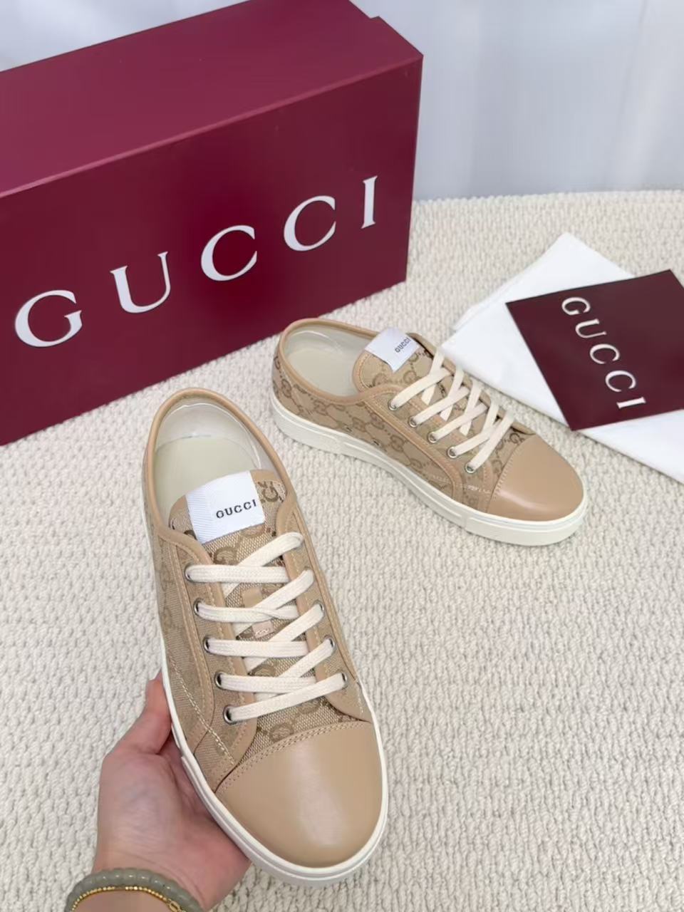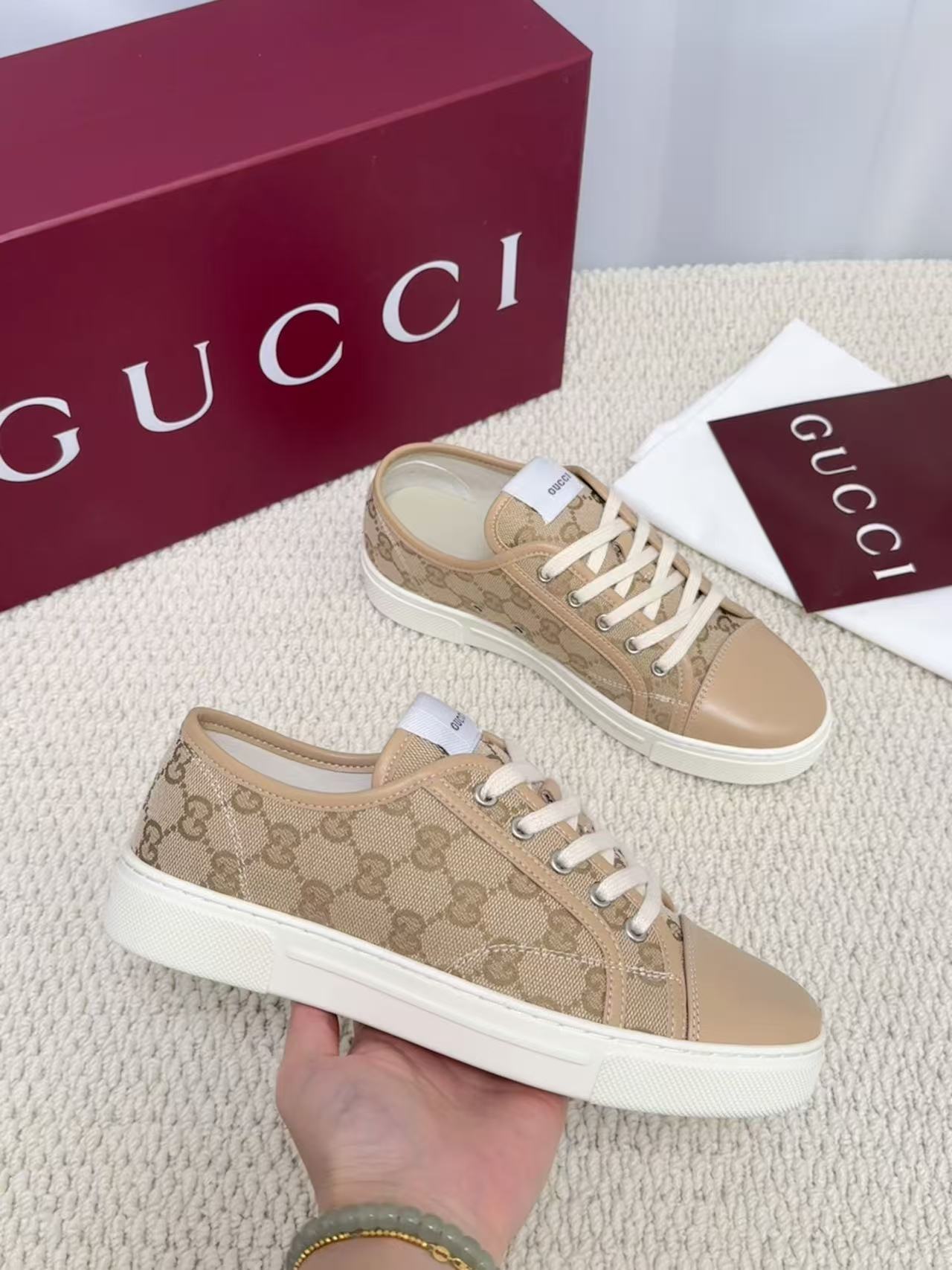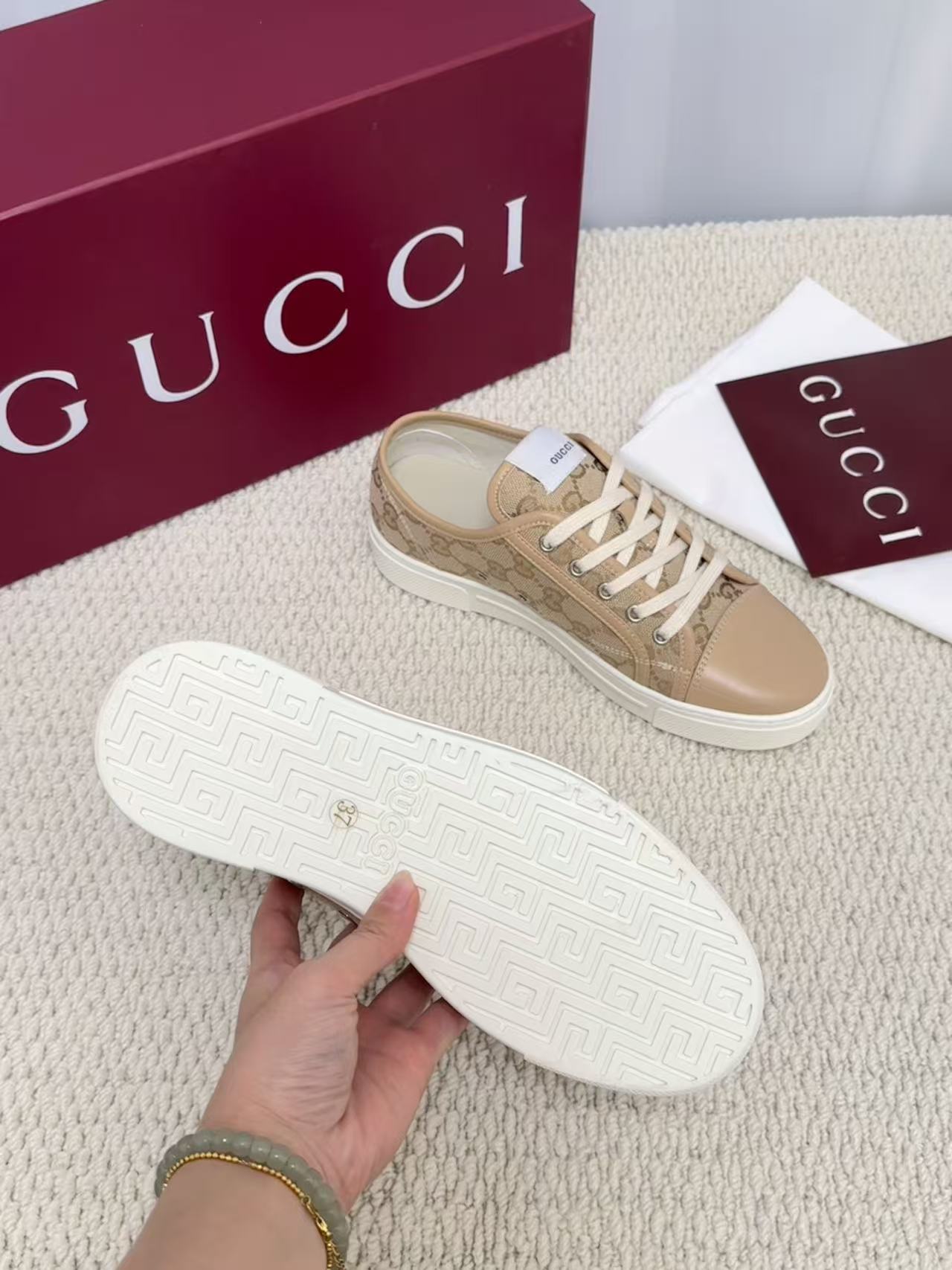 这款鞋子是AAAAA 1:1 质量 (非常棒). 使用了和原版一模一样的材料. 商标部分也保持了和古奇/Gucci一样. 图片拍摄是实物鞋子拍摄, 您所收到的实物保证和我们图片一模一样.