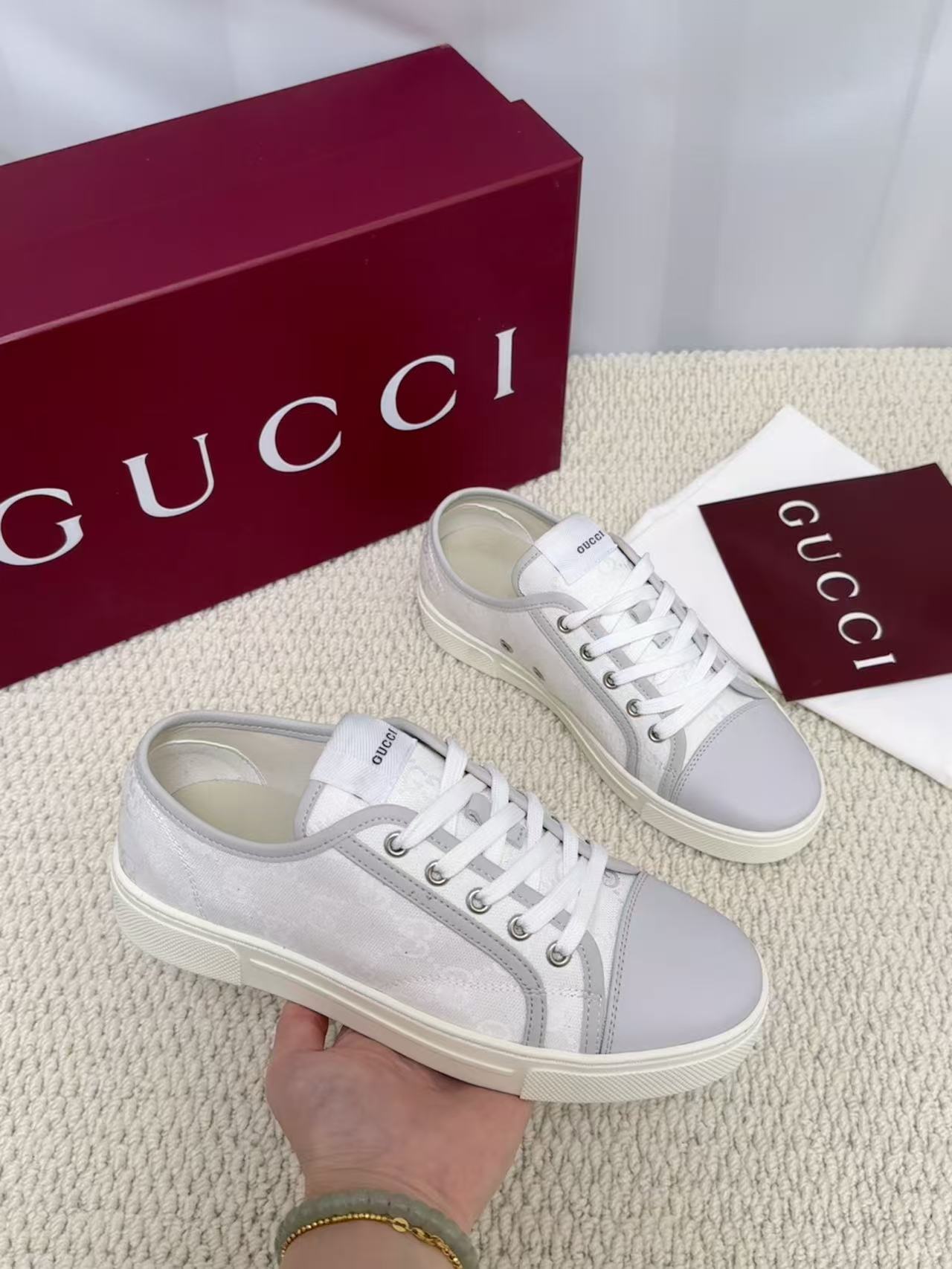 这款鞋子是AAAAA 1:1 质量 (非常棒). 使用了和原版一模一样的材料. 商标部分也保持了和古奇/Gucci一样. 图片拍摄是实物鞋子拍摄, 您所收到的实物保证和我们图片一模一样.