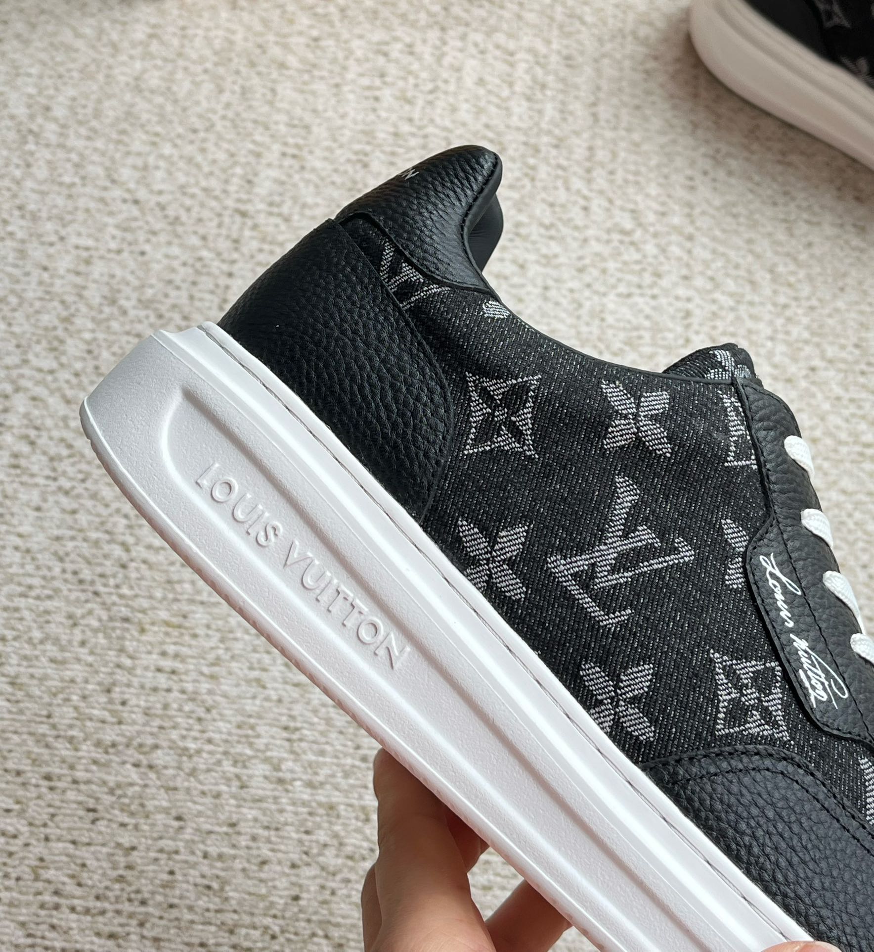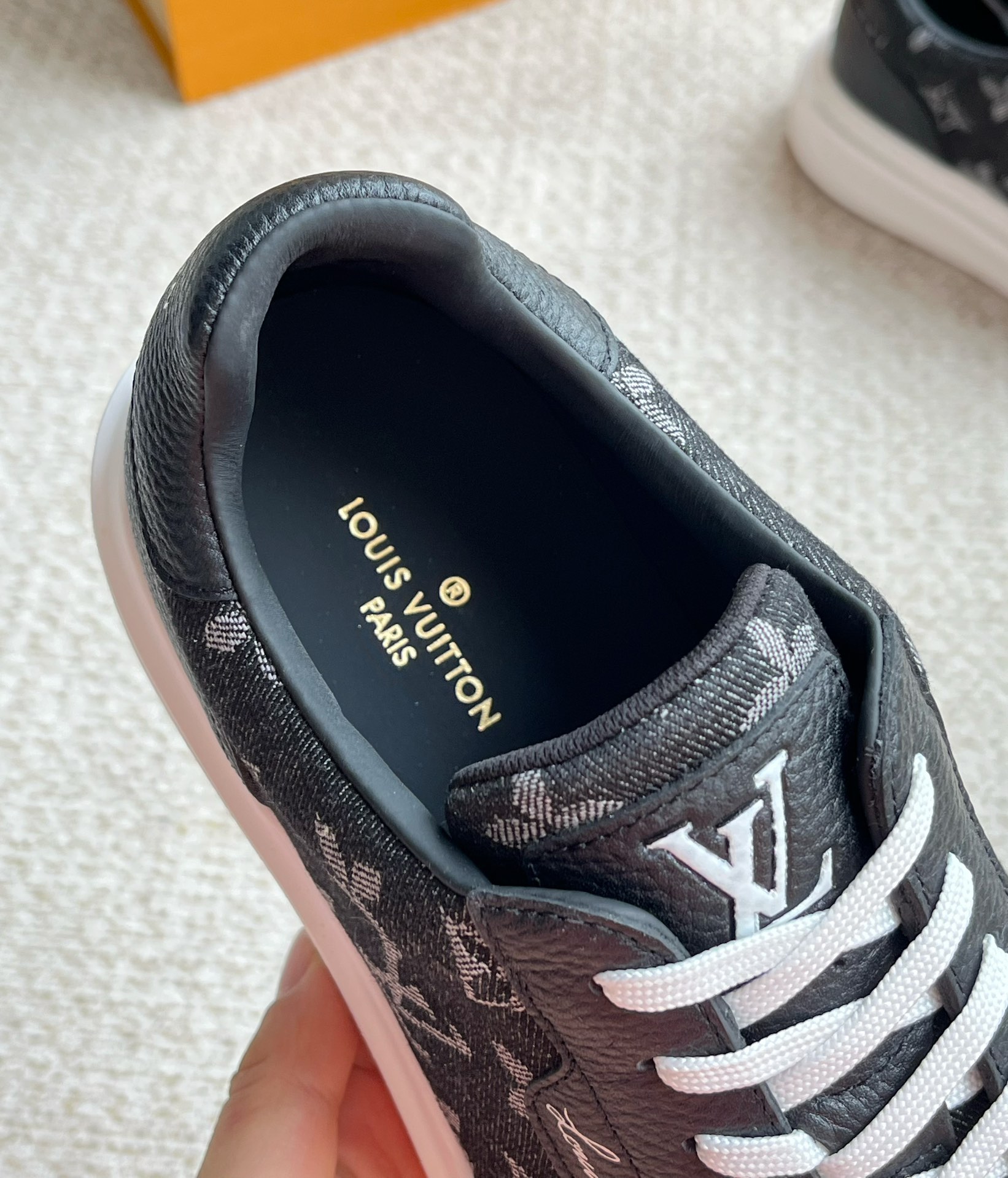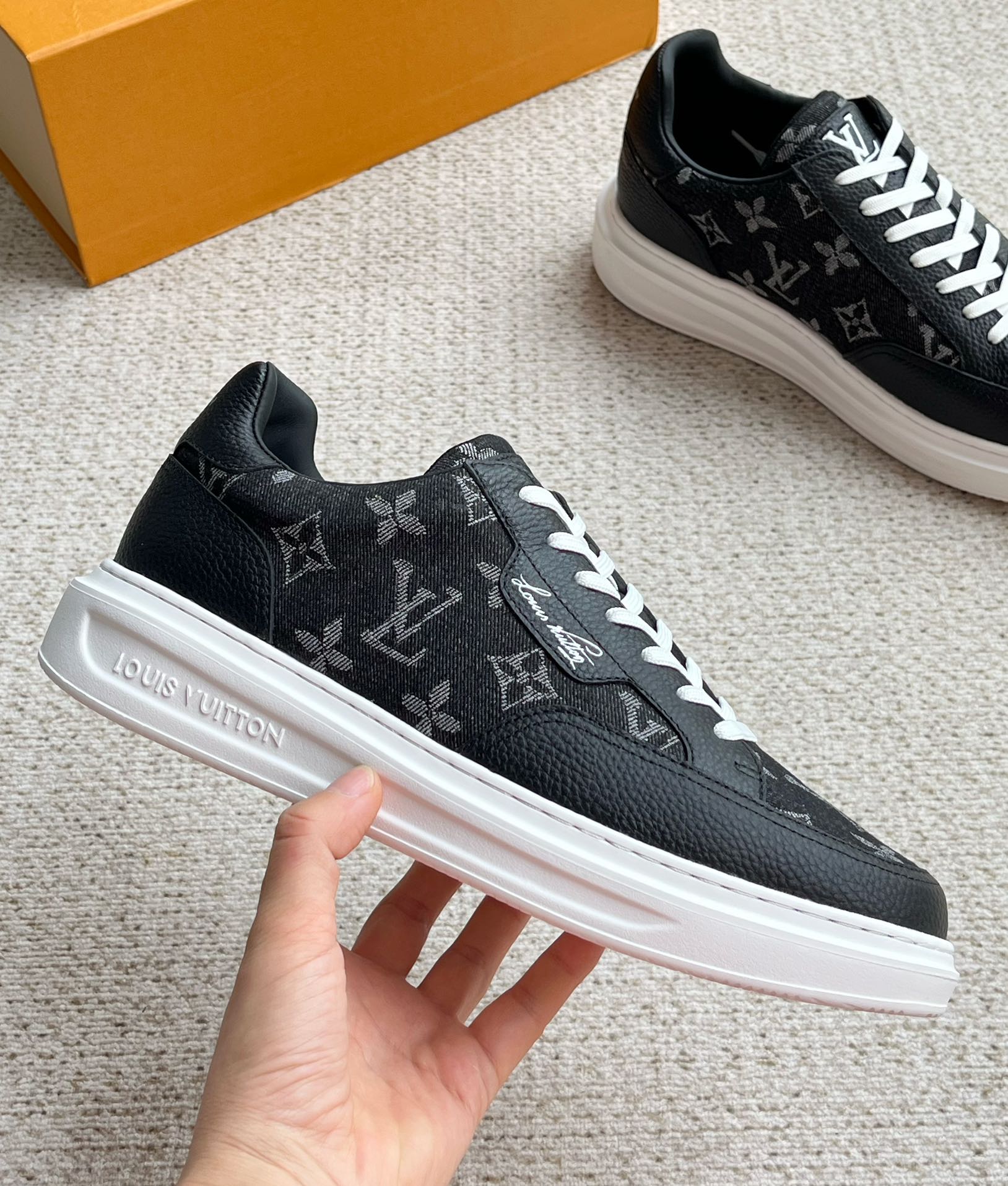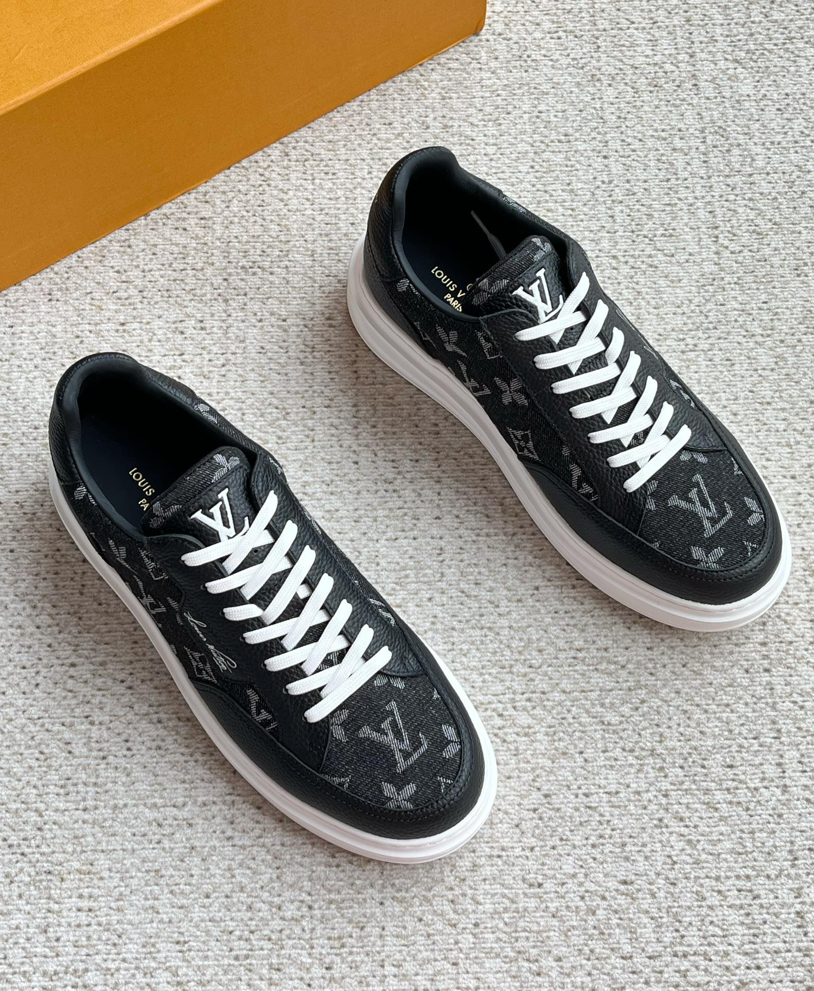 这款鞋子是AAAAA 1:1 质量 (非常棒). 使用了和原版一模一样的材料. 商标部分也保持了和路易威登/Louis Vuitton一样. 图片拍摄是实物鞋子拍摄, 您所收到的实物保证和我们图片一模一样.