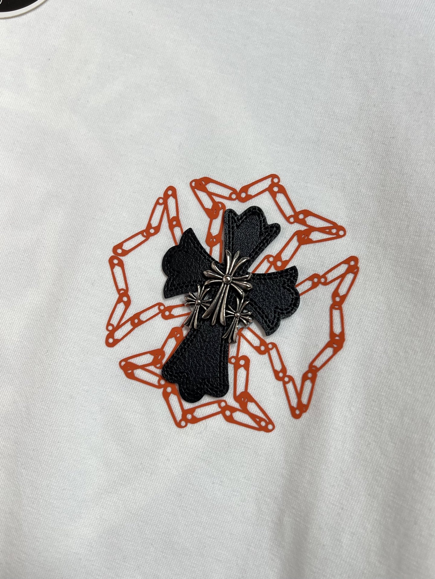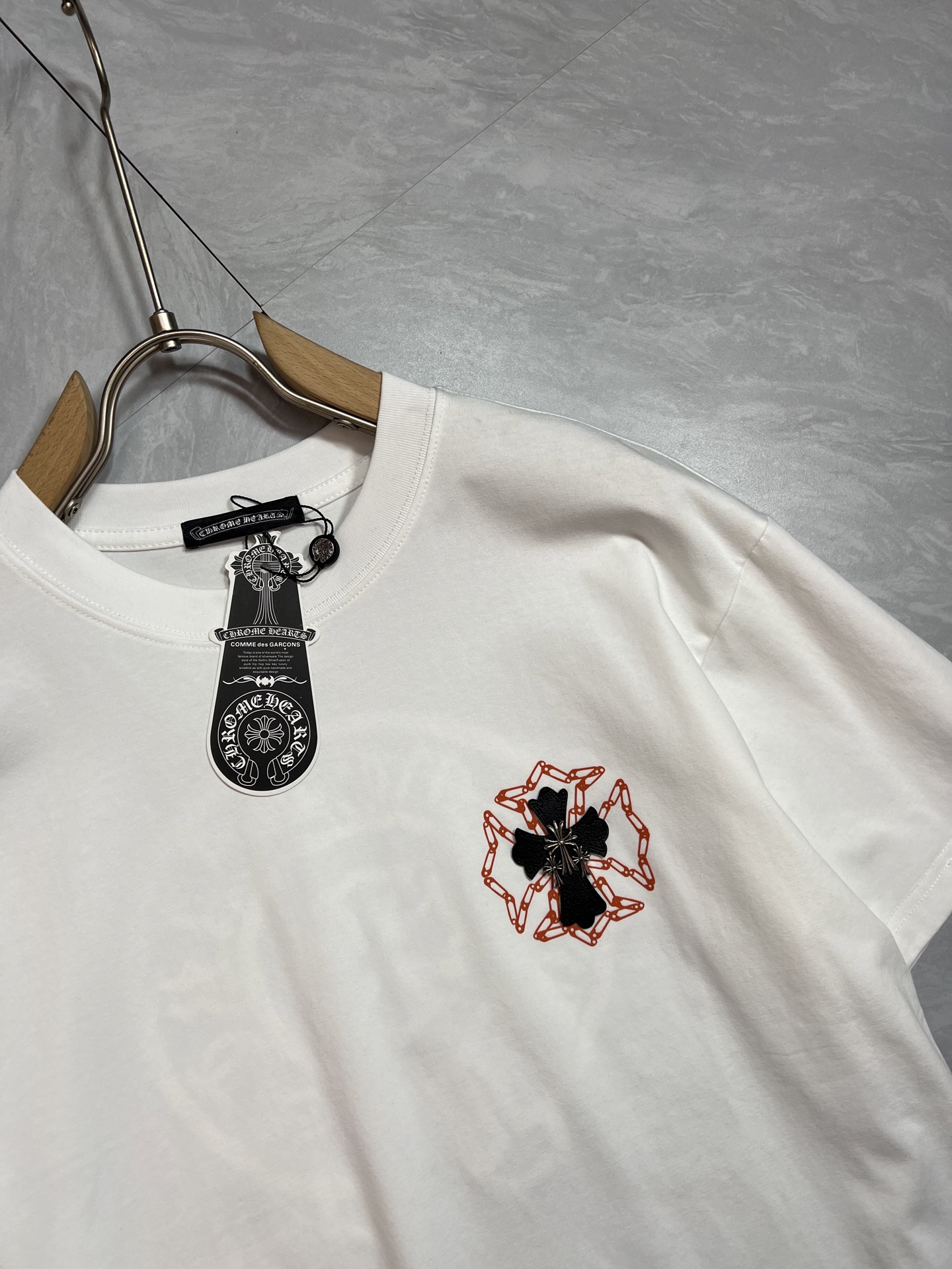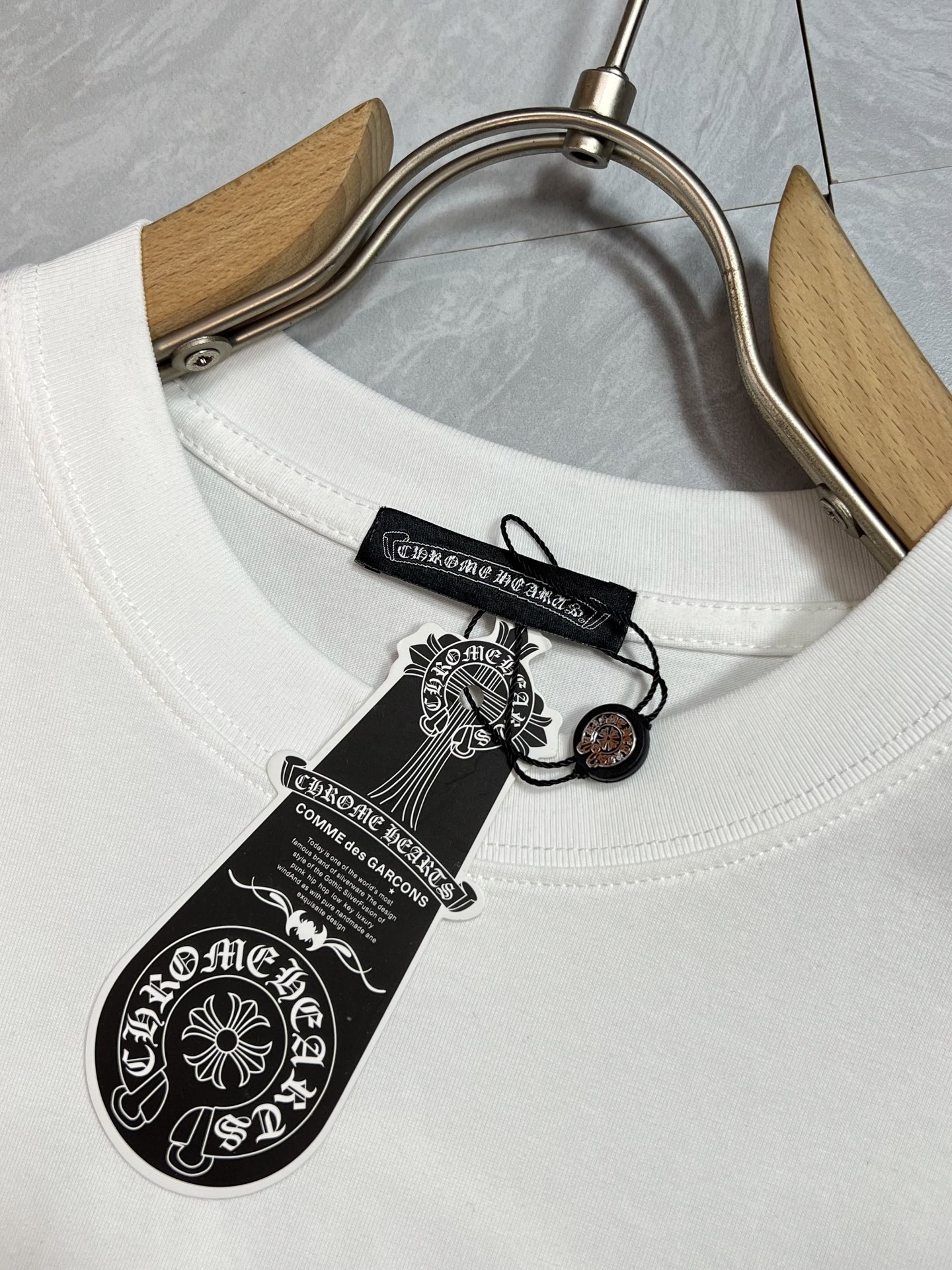 这款衣服是AAAAA 1:1 质量 (非常棒). 使用了和原版一模一样的材料. 商标部分也保持了和克罗心/Chrome Hearts一样. 图片拍摄是实物衣服拍摄, 您所收到的实物保证和我们图片一模一样.