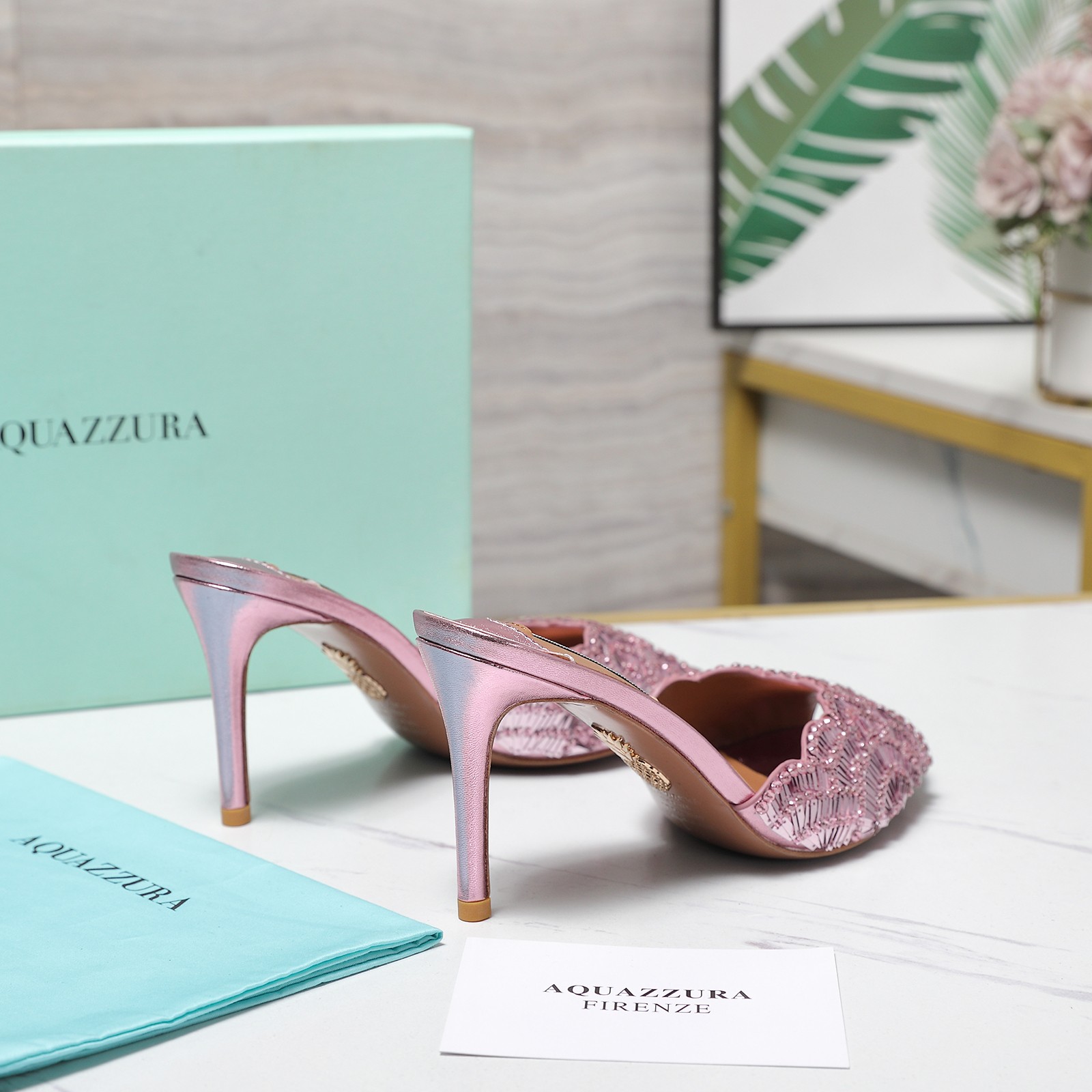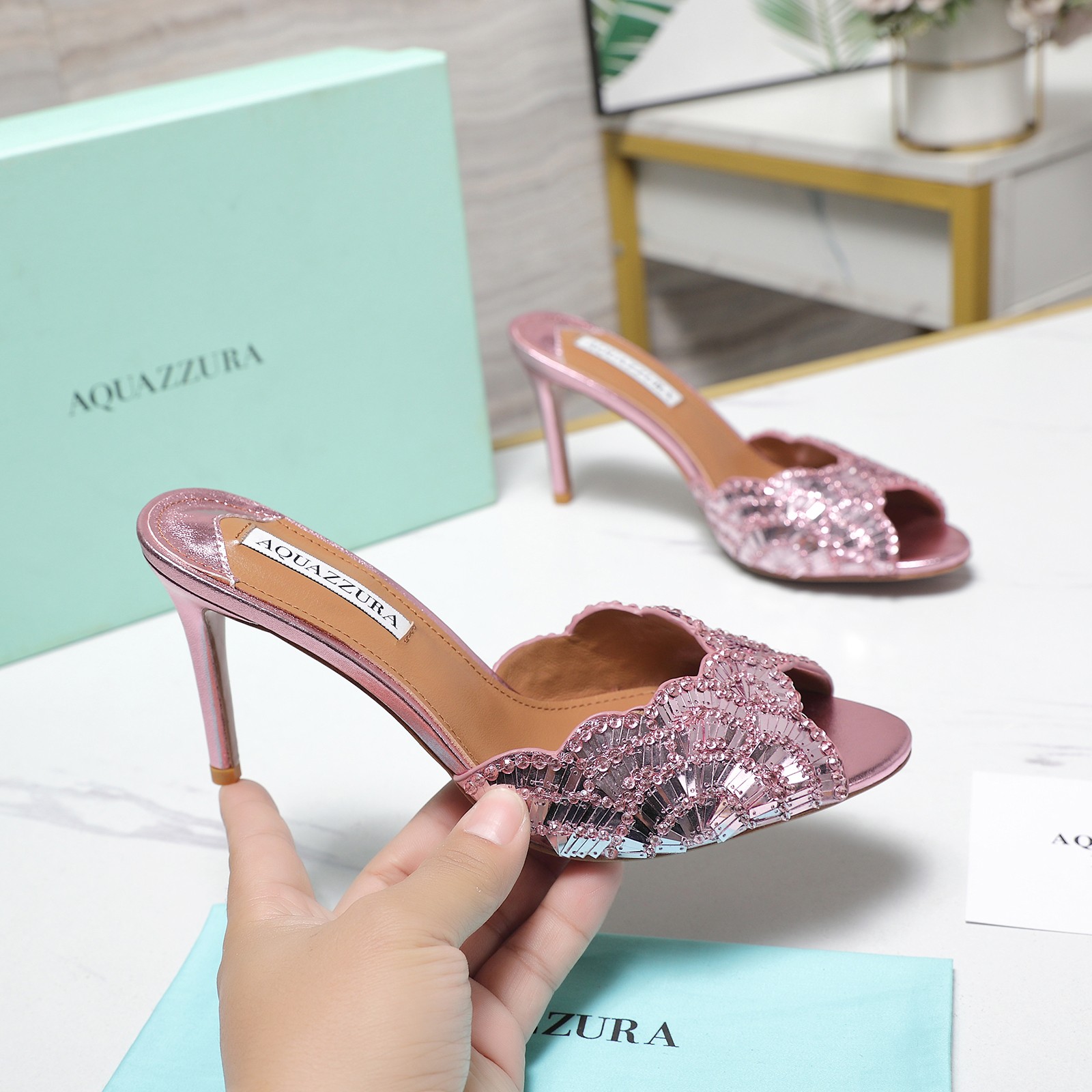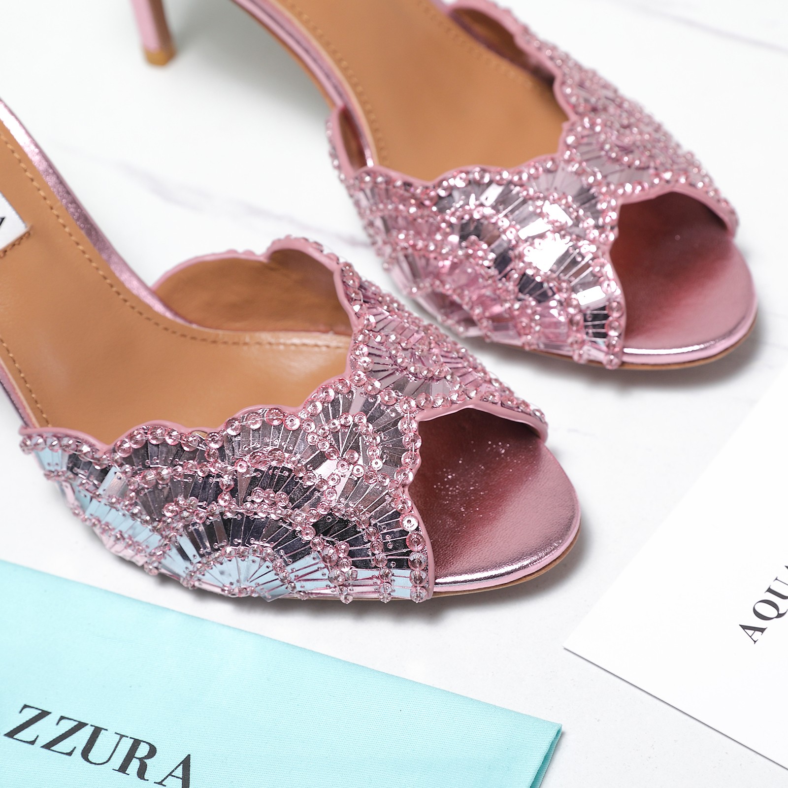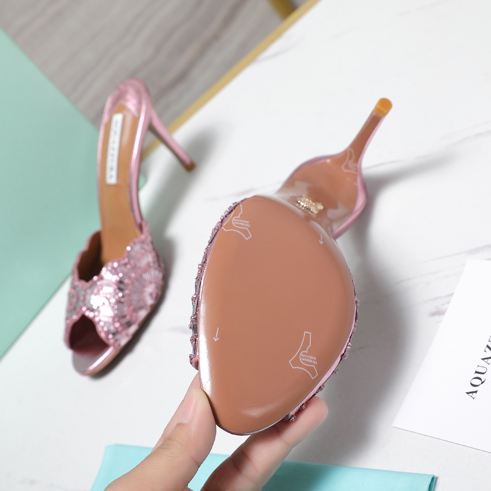 这款鞋子是AAAAA 1:1 质量 (非常棒). 使用了和原版一模一样的材料. 商标部分也保持了和Aquazzura一样. 图片拍摄是实物鞋子拍摄, 您所收到的实物保证和我们图片一模一样.