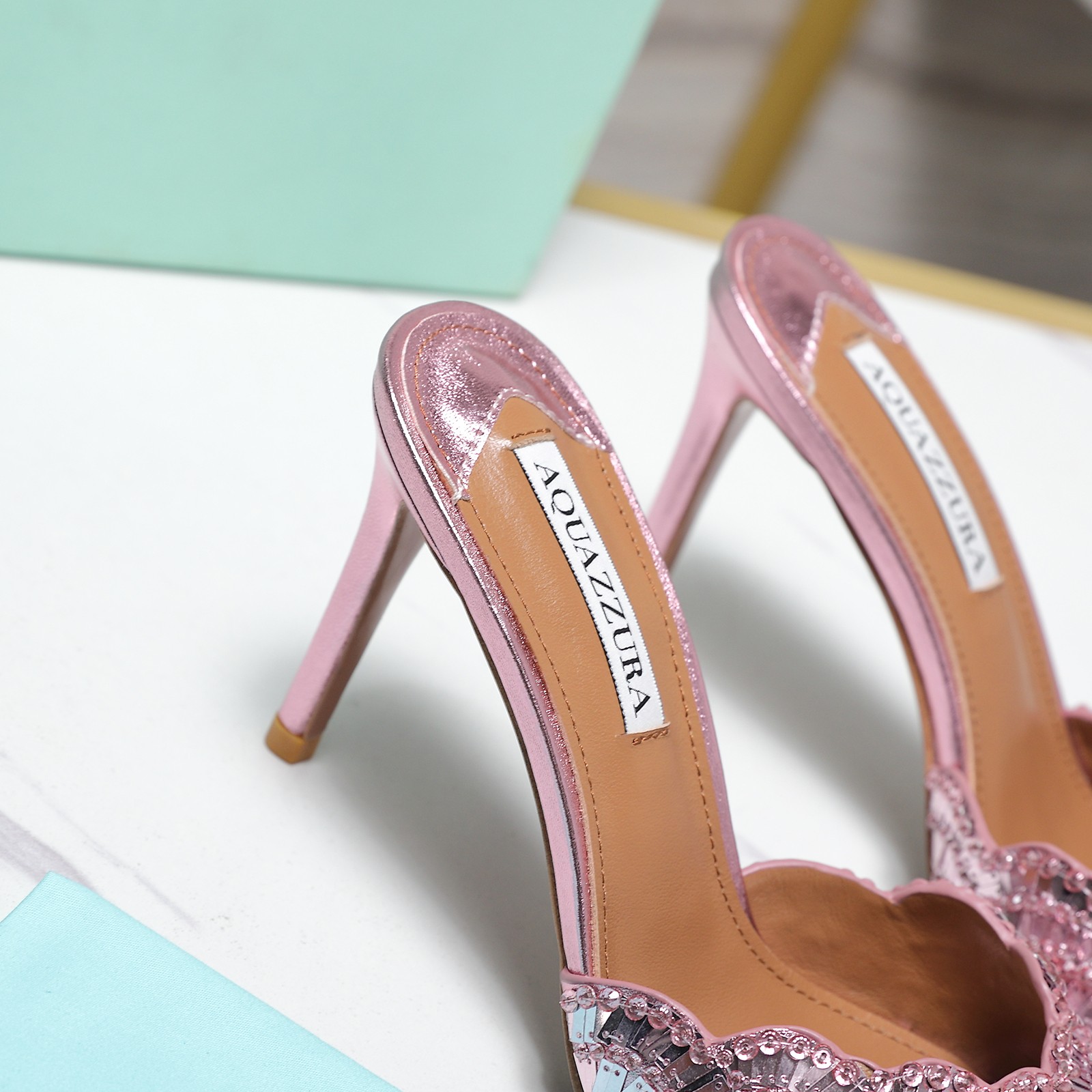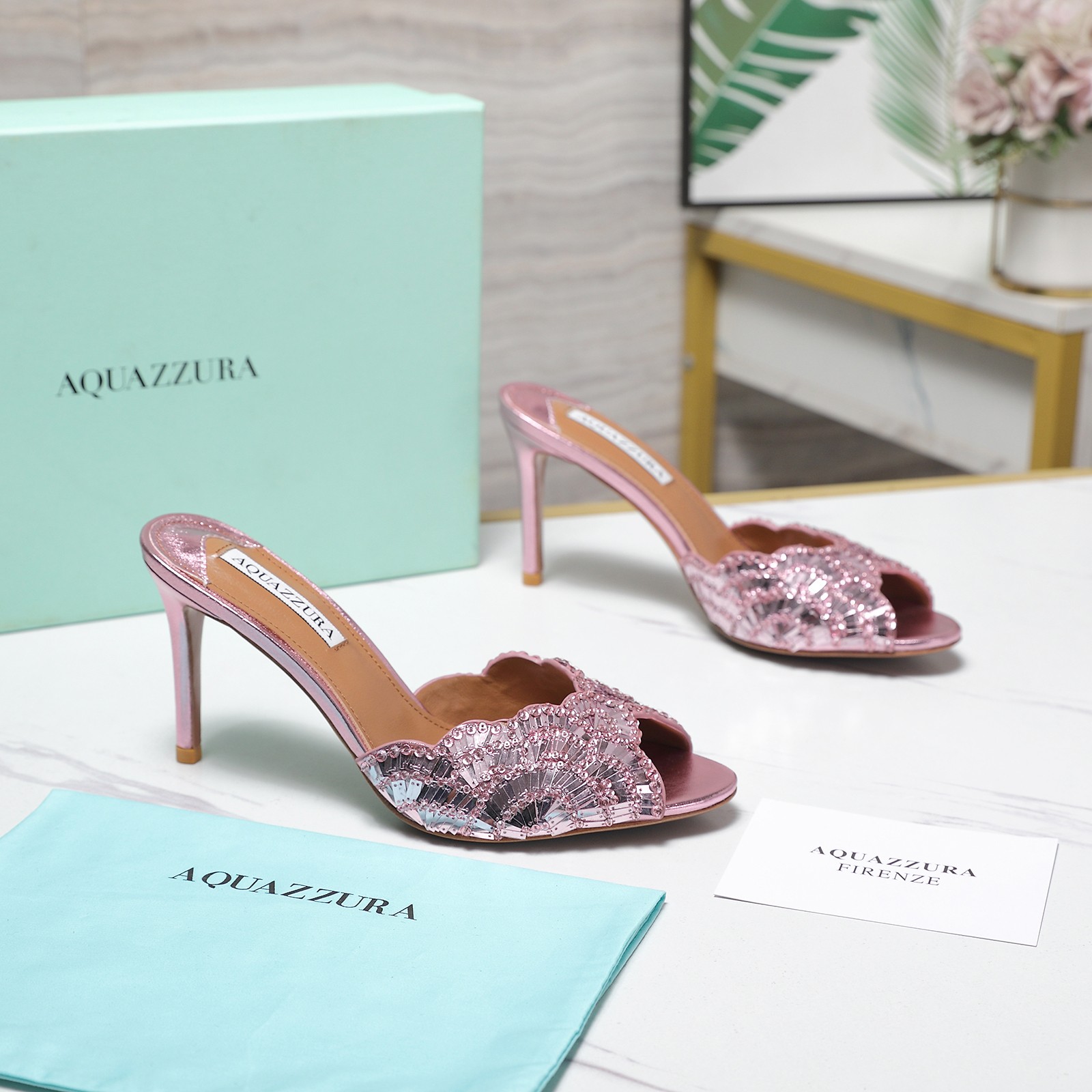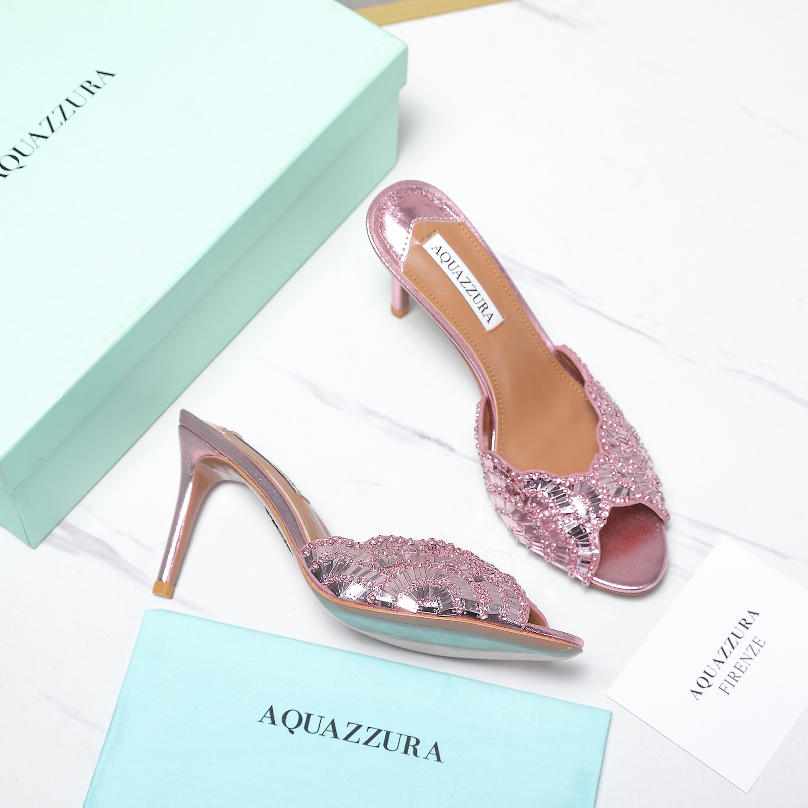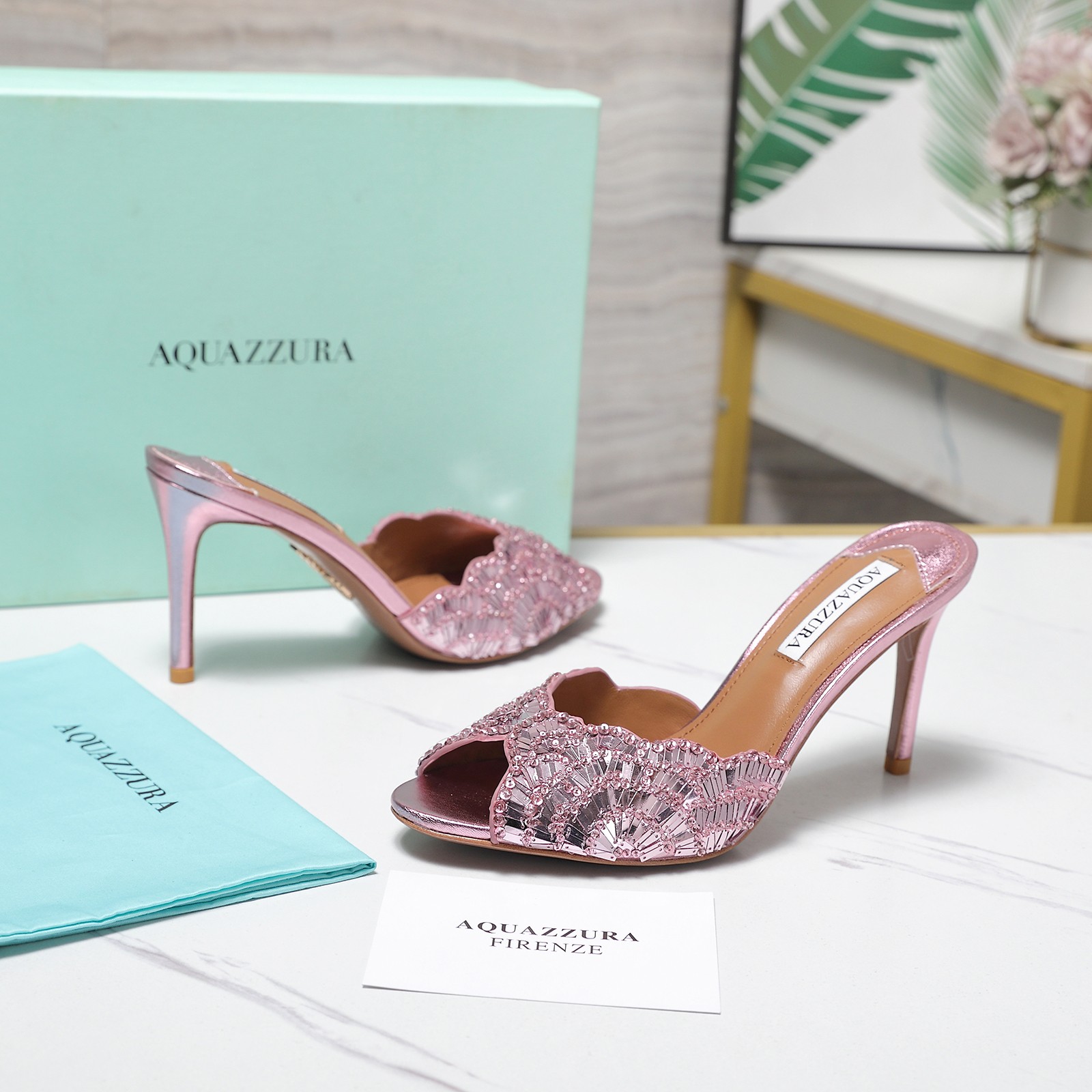 这款鞋子是AAAAA 1:1 质量 (非常棒). 使用了和原版一模一样的材料. 商标部分也保持了和Aquazzura一样. 图片拍摄是实物鞋子拍摄, 您所收到的实物保证和我们图片一模一样.