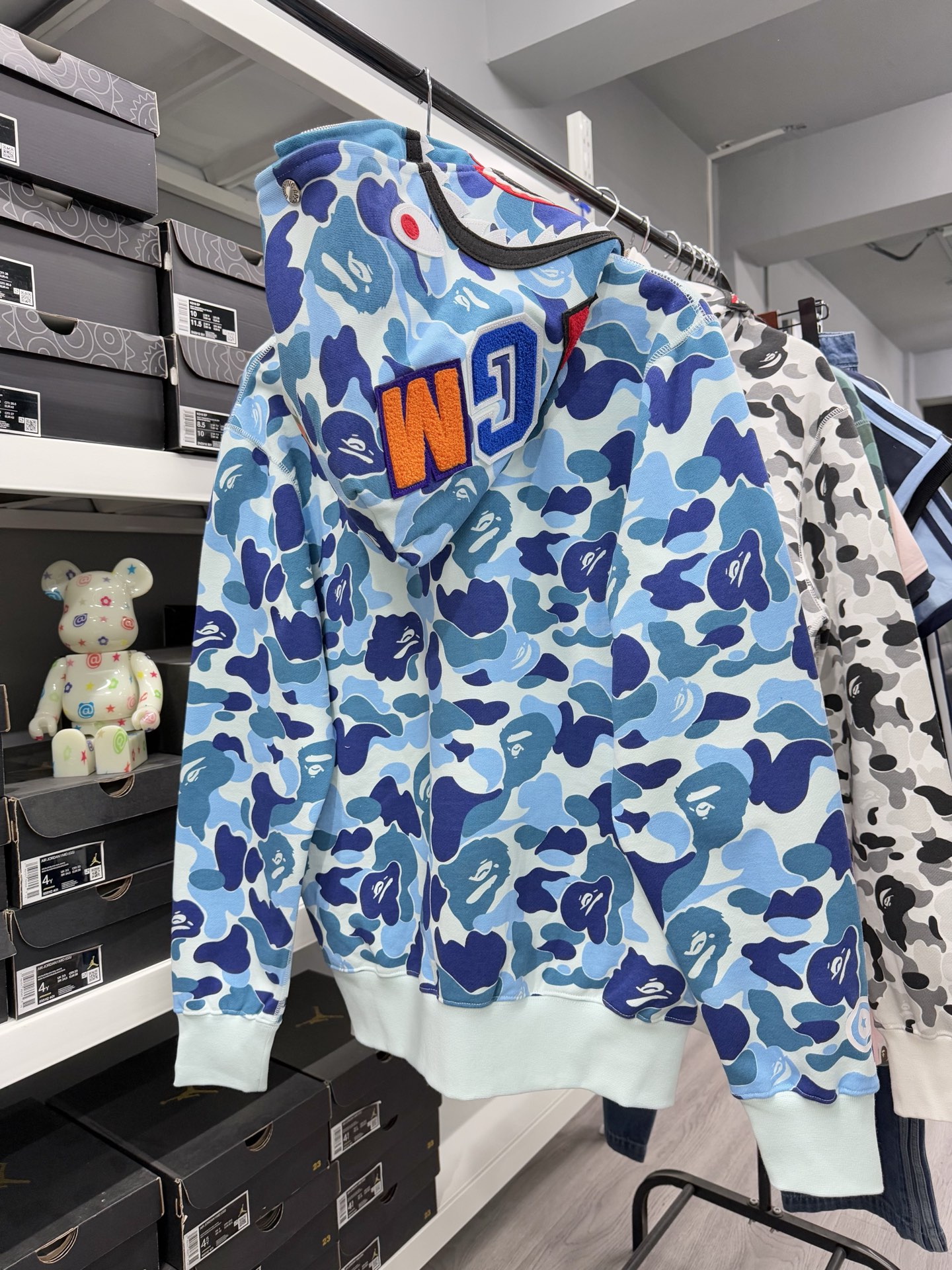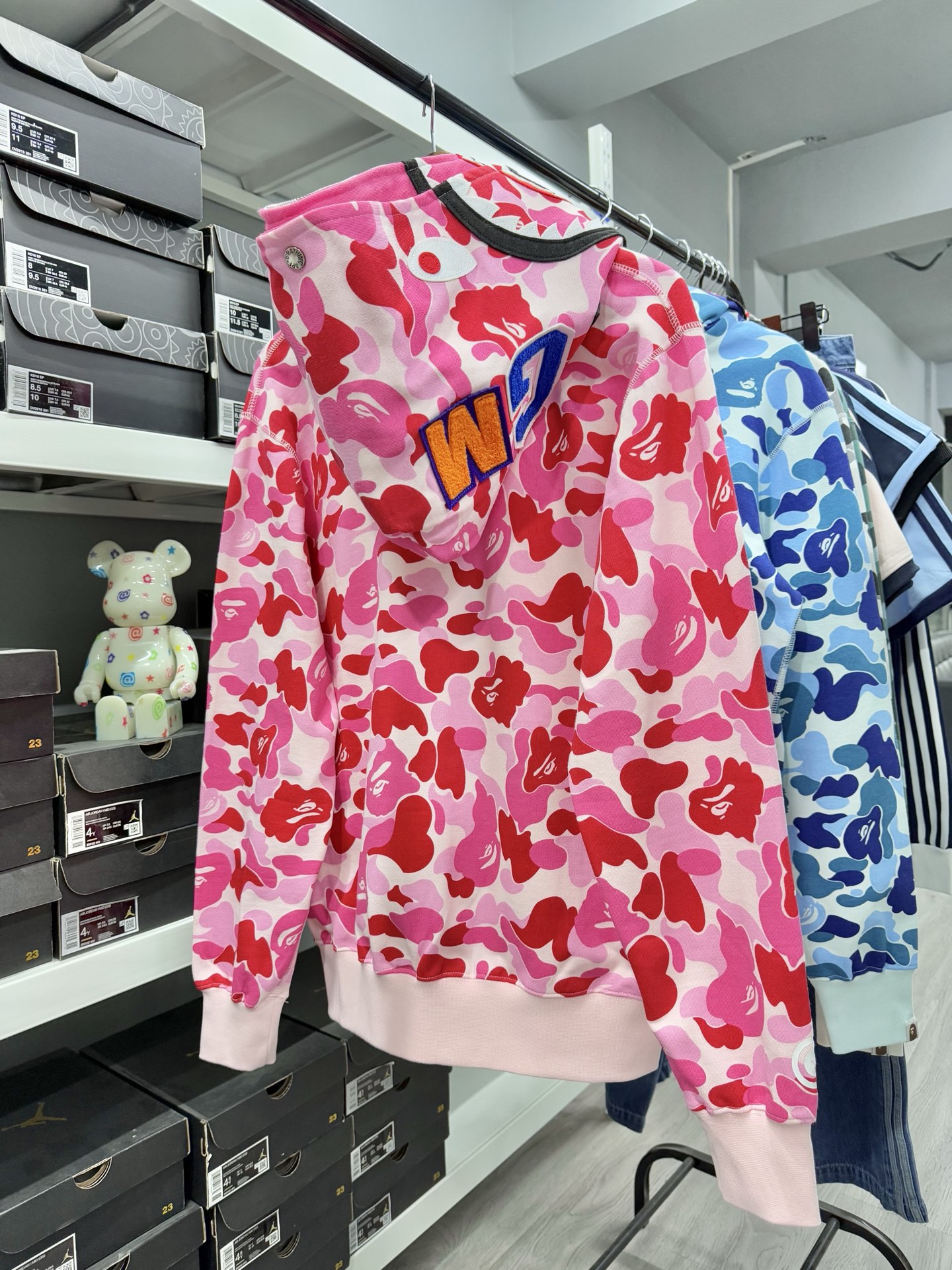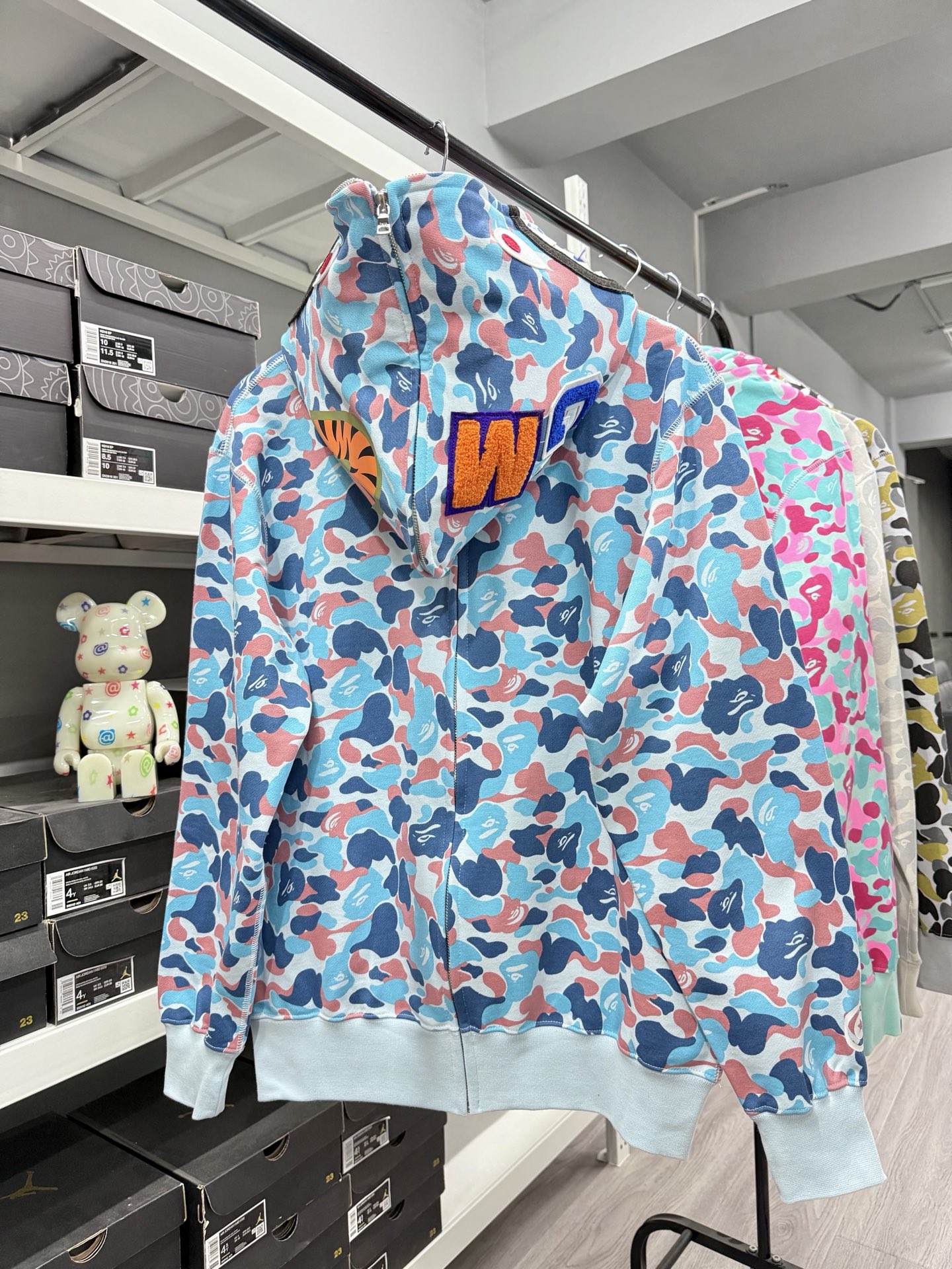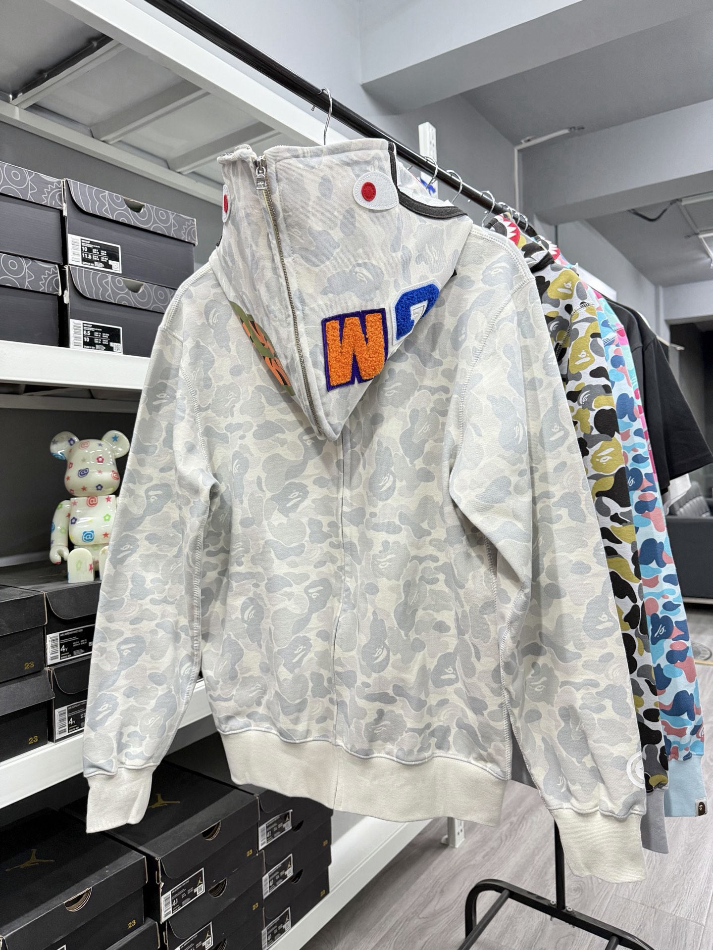 这款衣服是AAAAA 1:1 质量 (非常棒). 使用了和原版一模一样的材料. 商标部分也保持了和Bape一样. 图片拍摄是实物衣服拍摄, 您所收到的实物保证和我们图片一模一样.