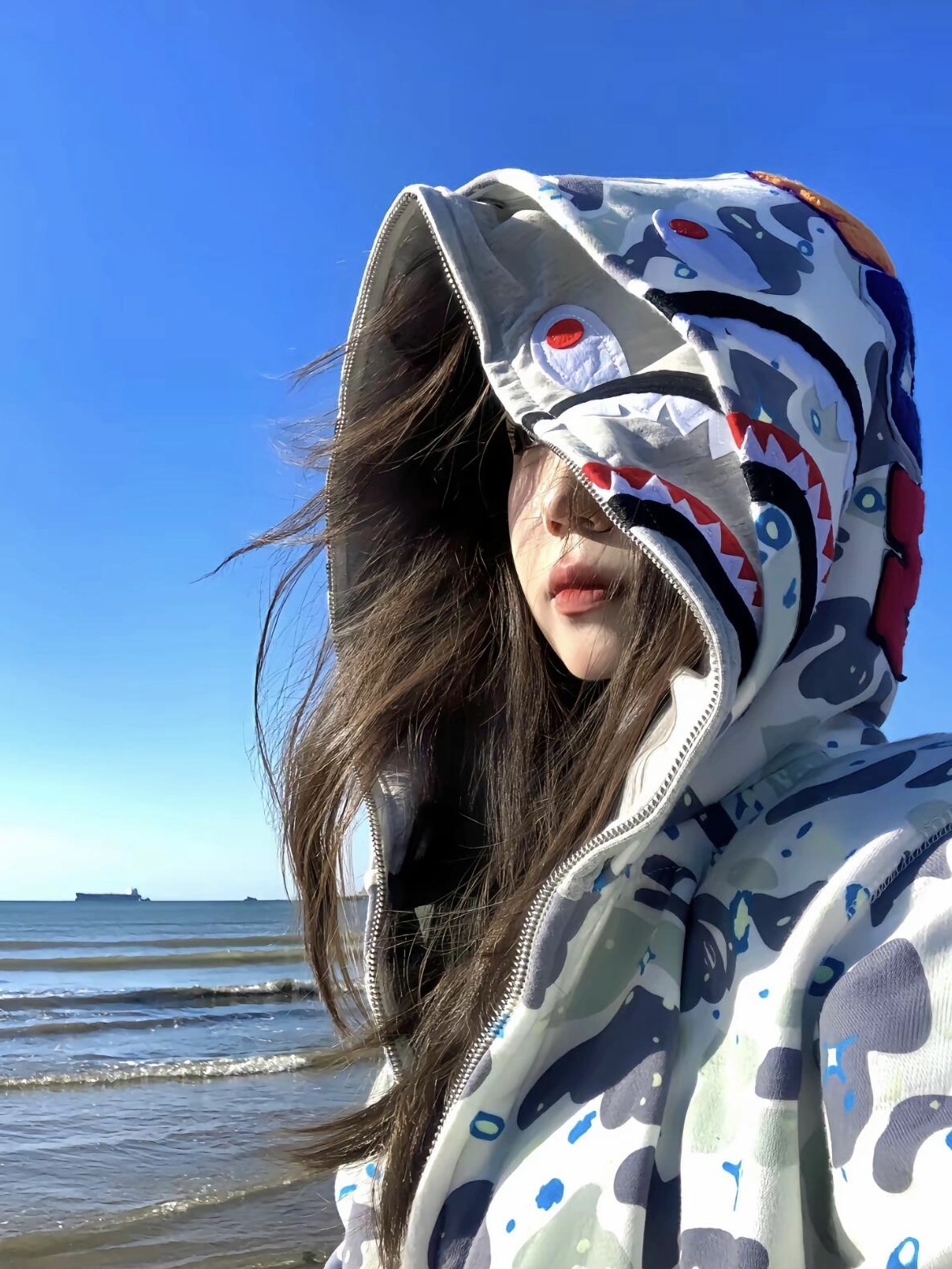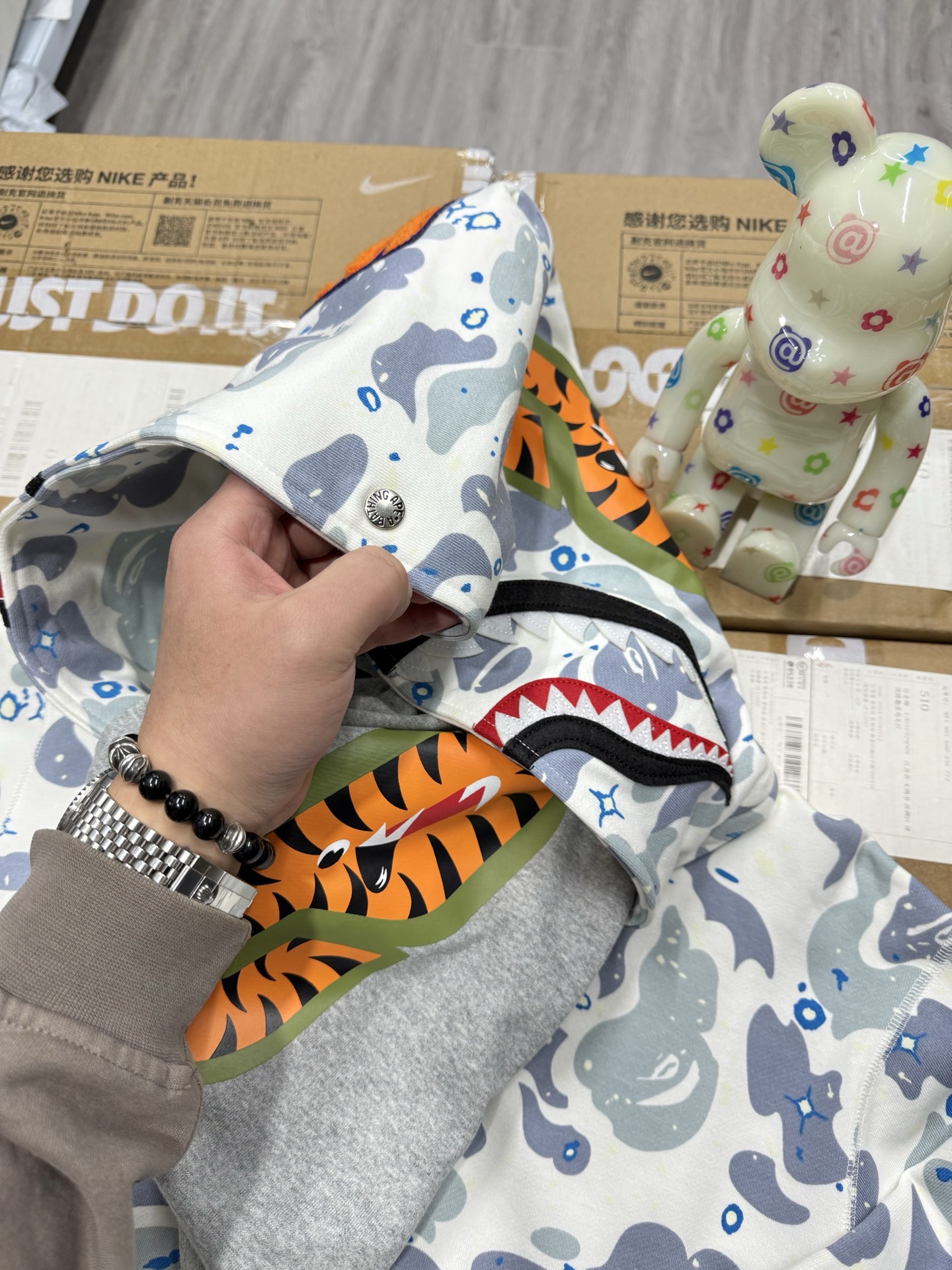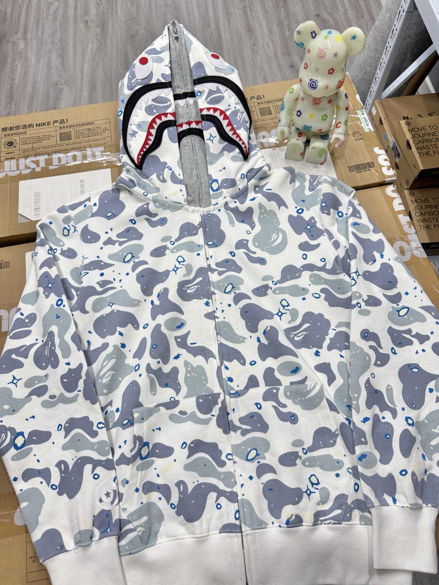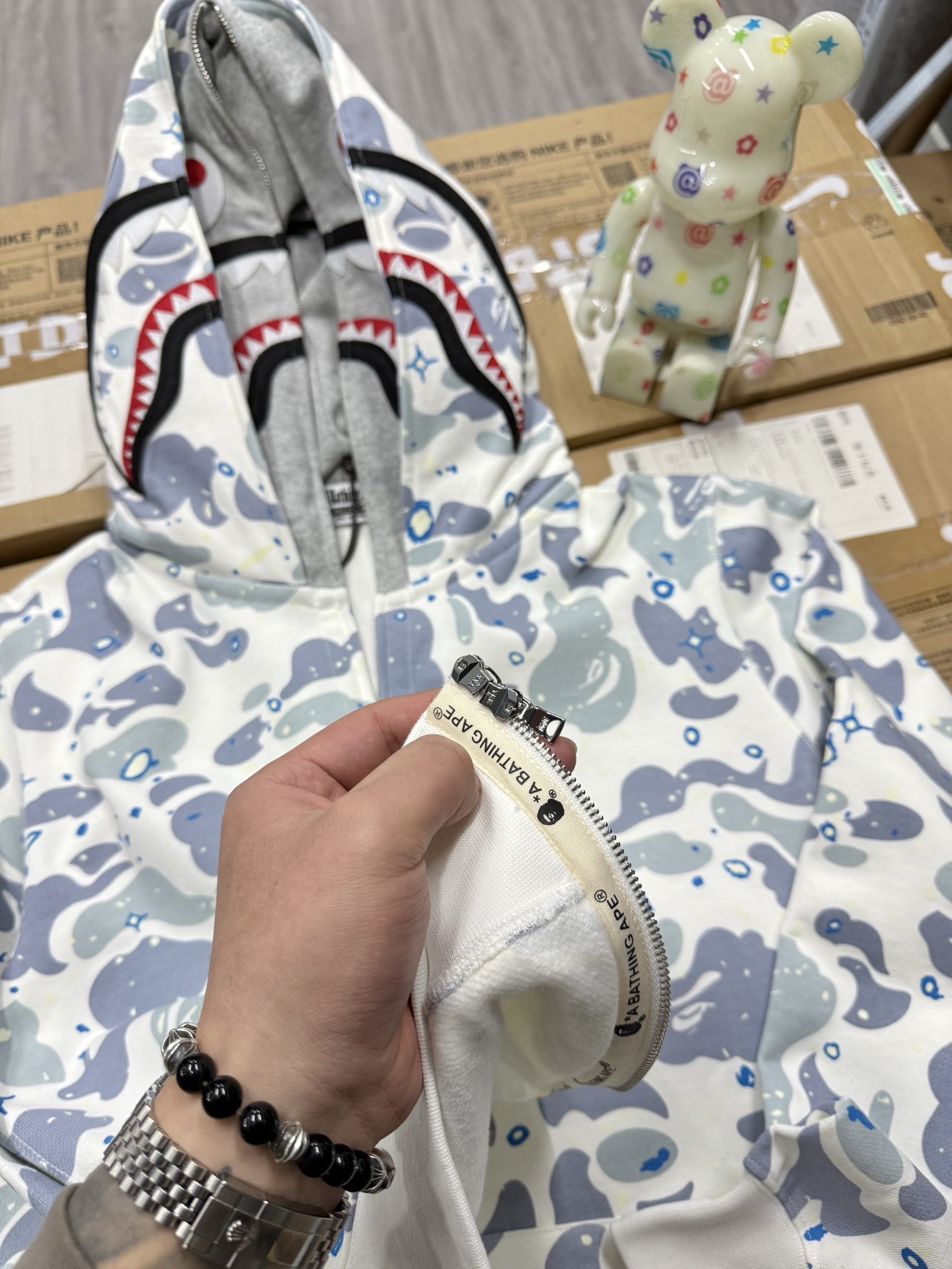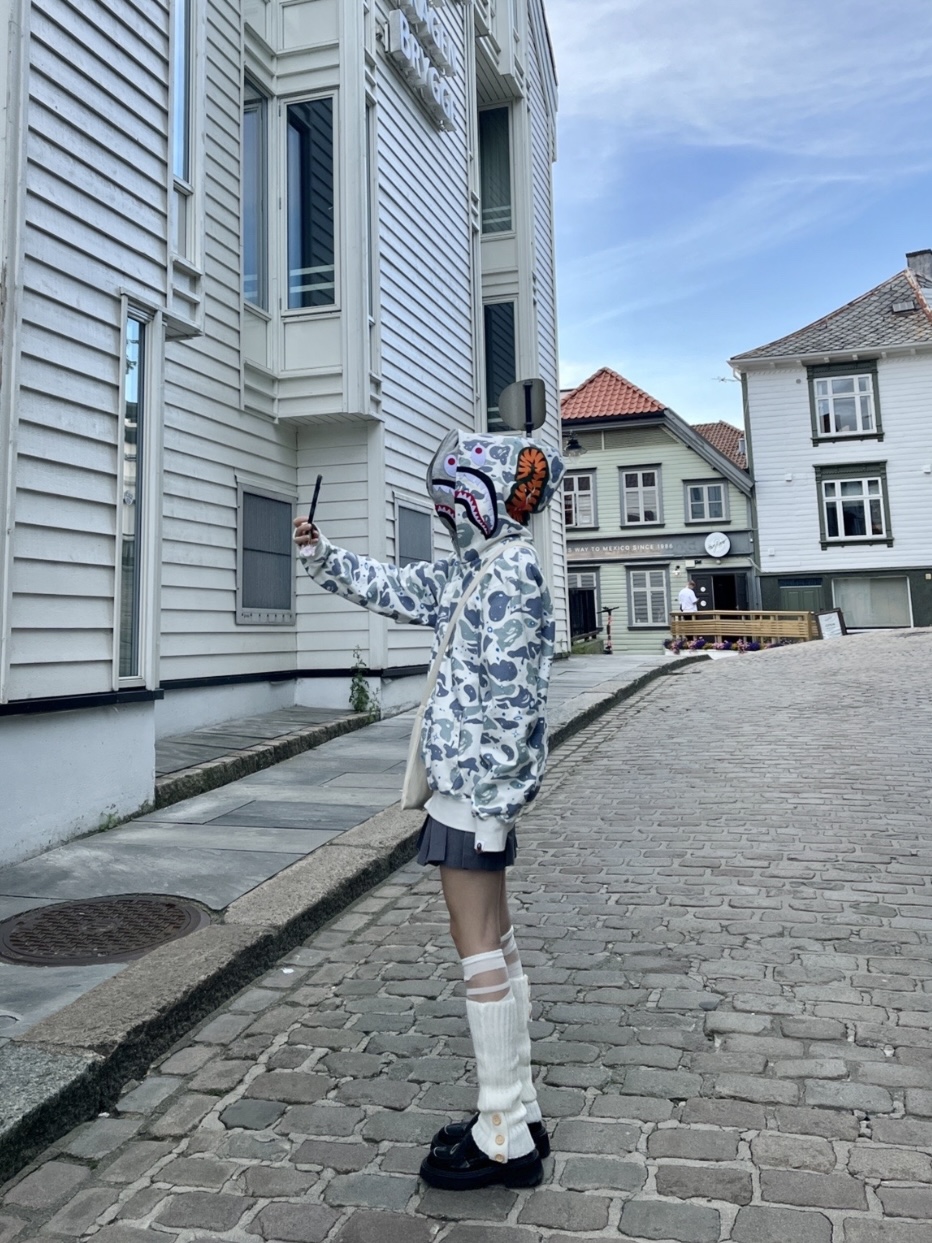 这款衣服是AAAAA 1:1 质量 (非常棒). 使用了和原版一模一样的材料. 商标部分也保持了和Bape一样. 图片拍摄是实物衣服拍摄, 您所收到的实物保证和我们图片一模一样.