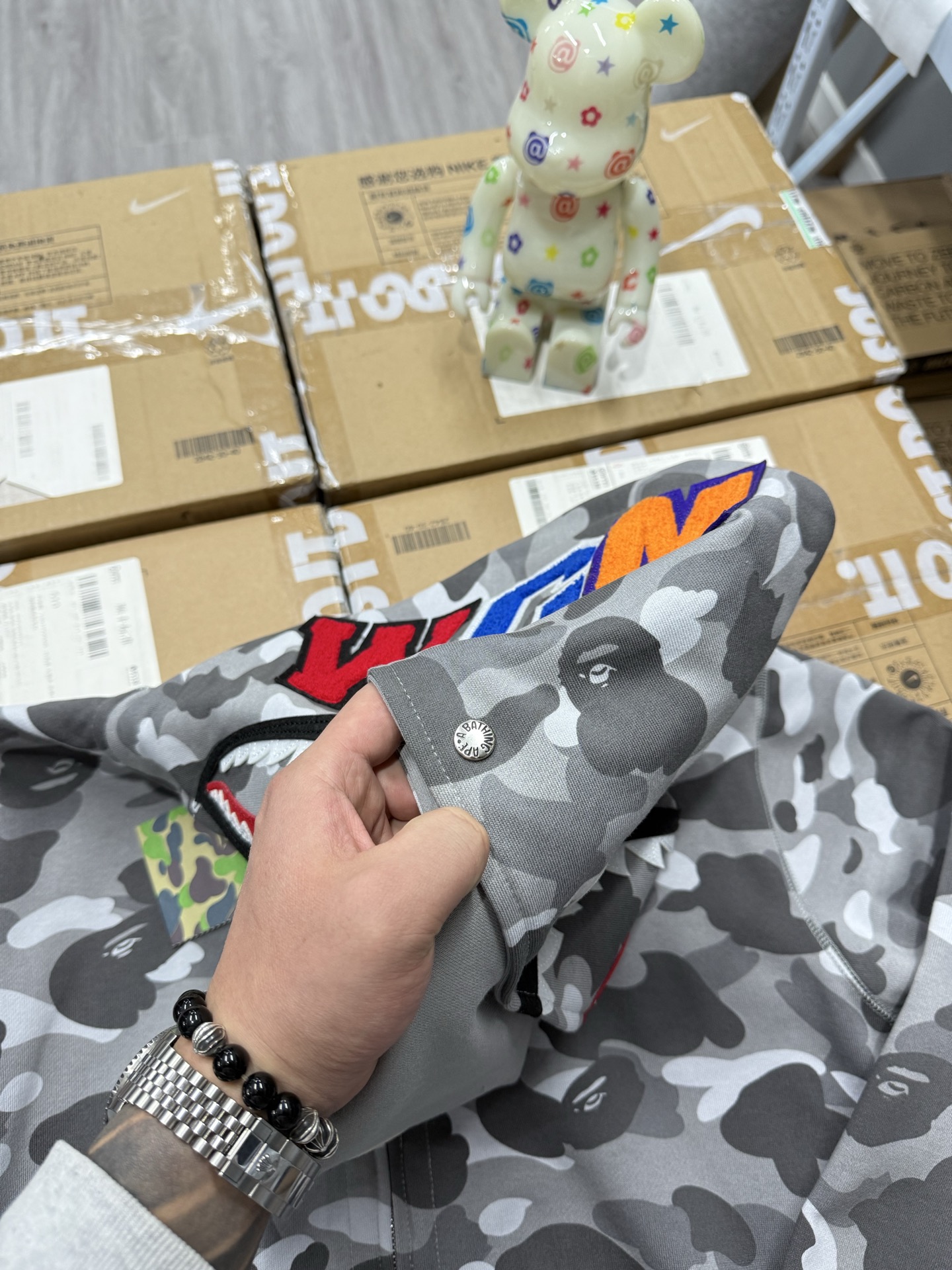 这款衣服是AAAAA 1:1 质量 (非常棒). 使用了和原版一模一样的材料. 商标部分也保持了和Bape一样. 图片拍摄是实物衣服拍摄, 您所收到的实物保证和我们图片一模一样.