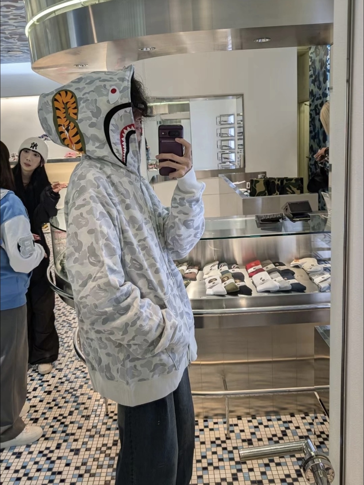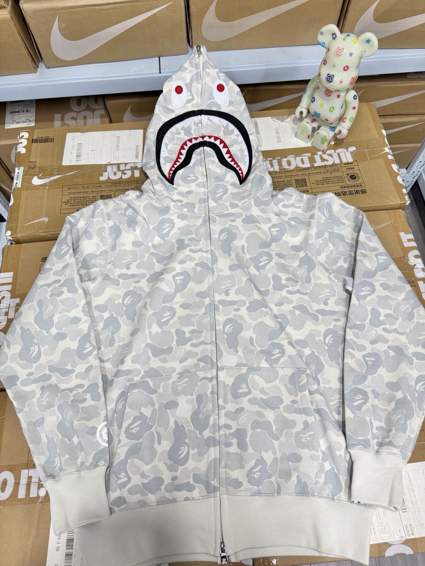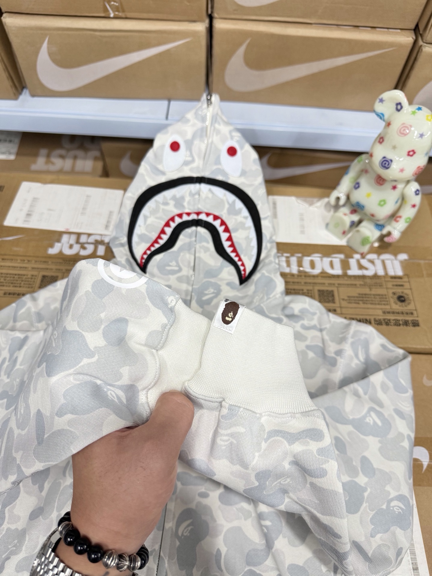这款衣服是AAAAA 1:1 质量 (非常棒). 使用了和原版一模一样的材料. 商标部分也保持了和Bape一样. 图片拍摄是实物衣服拍摄, 您所收到的实物保证和我们图片一模一样.