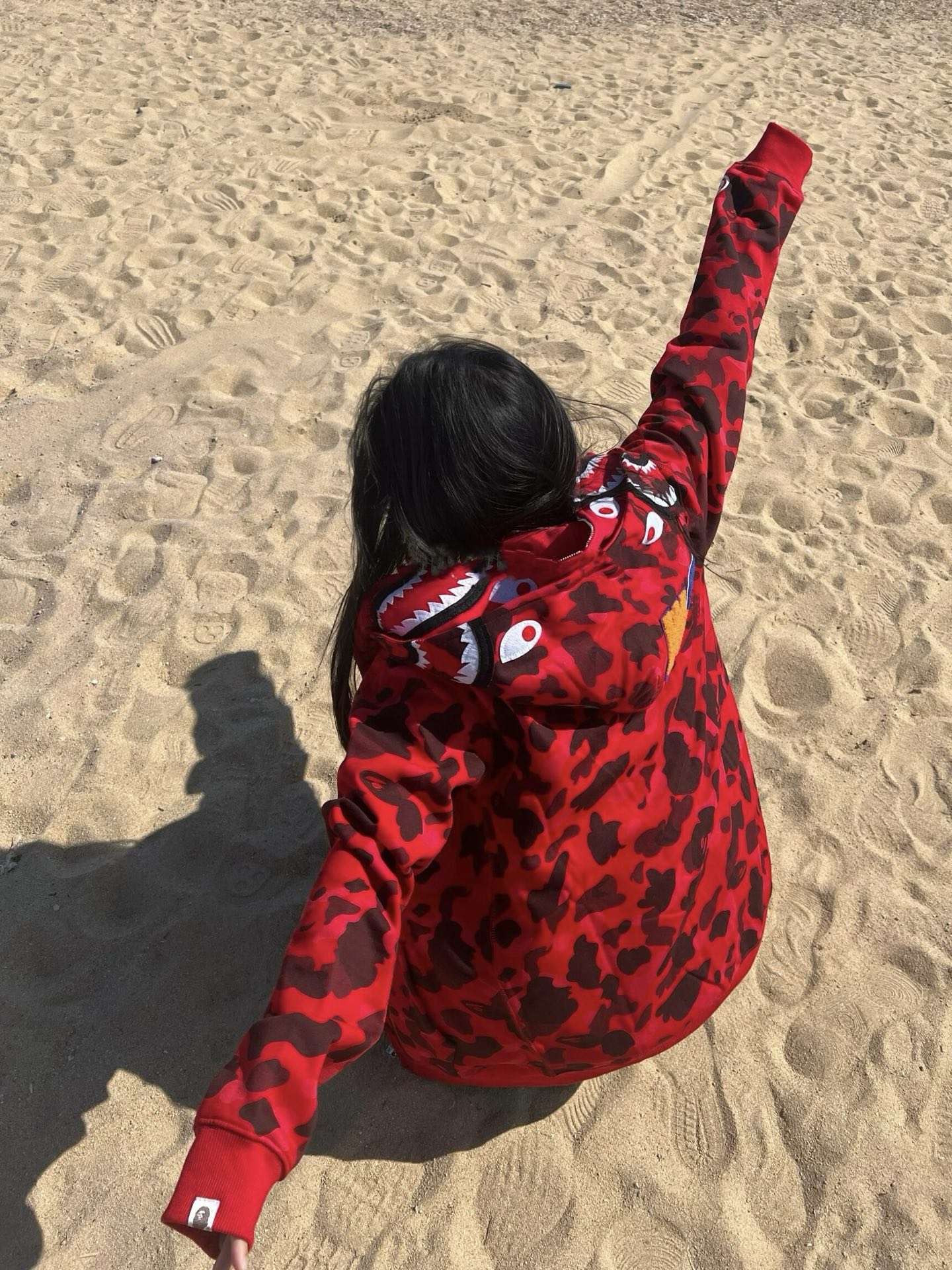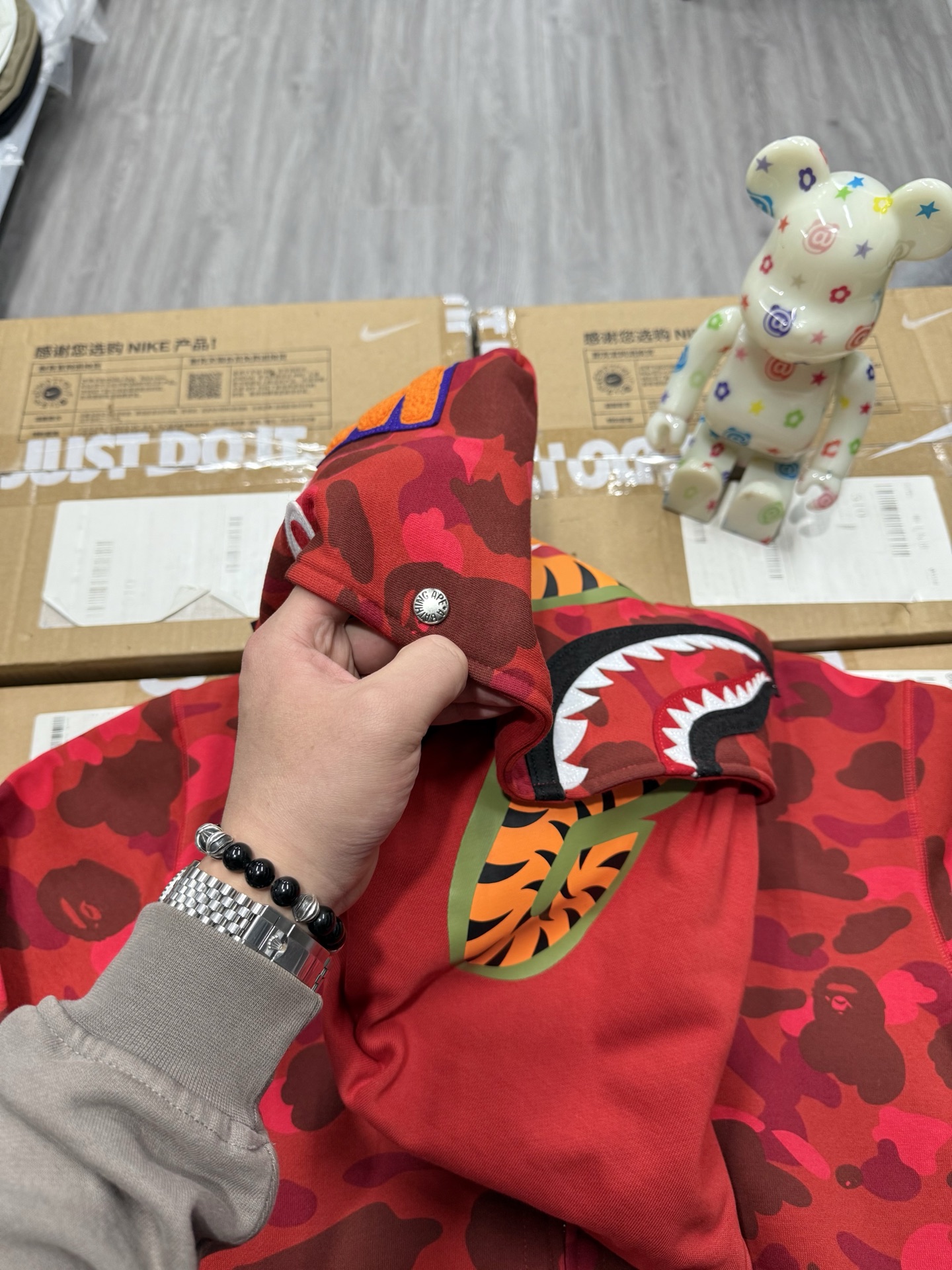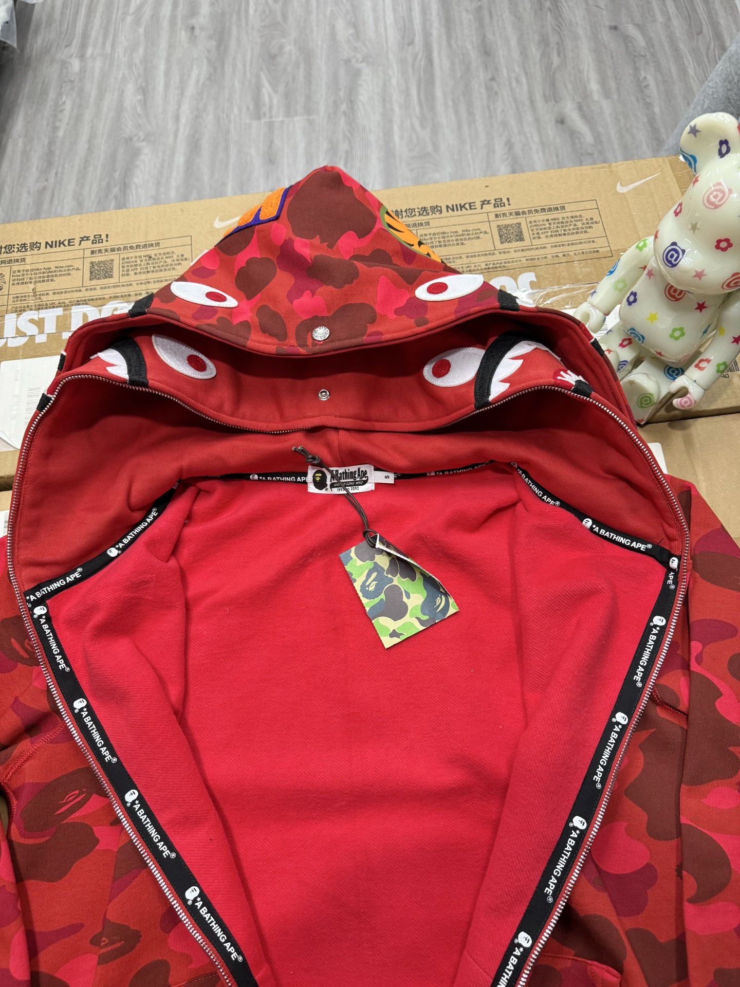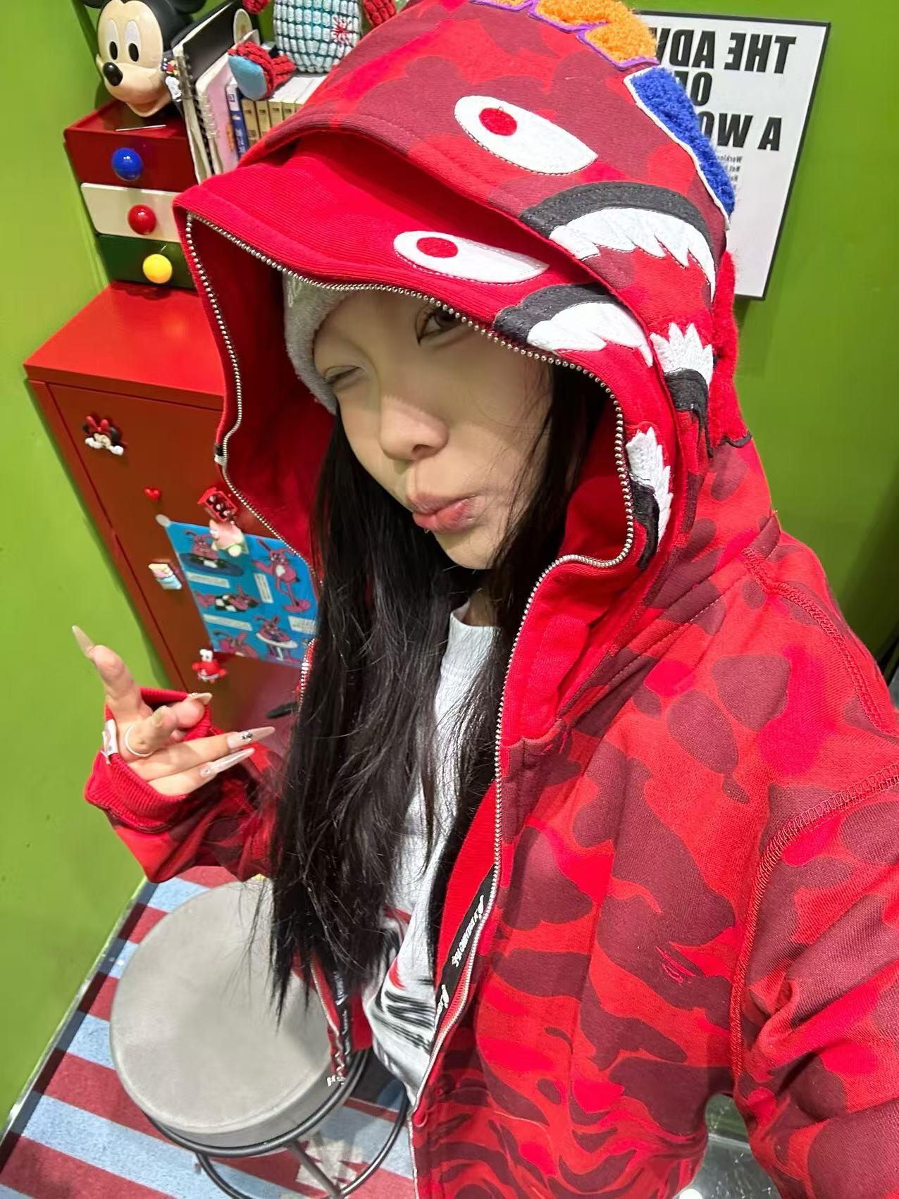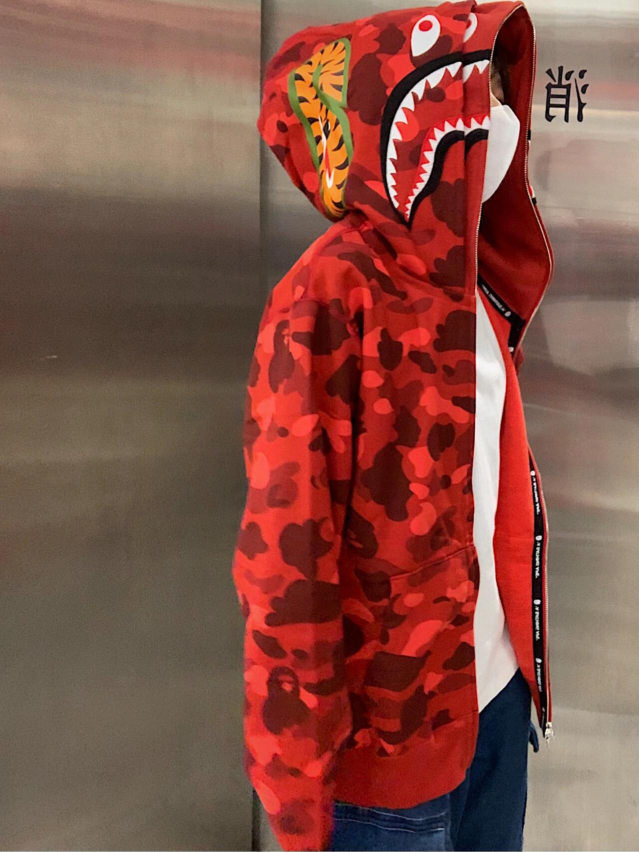 这款衣服是AAAAA 1:1 质量 (非常棒). 使用了和原版一模一样的材料. 商标部分也保持了和Bape一样. 图片拍摄是实物衣服拍摄, 您所收到的实物保证和我们图片一模一样.