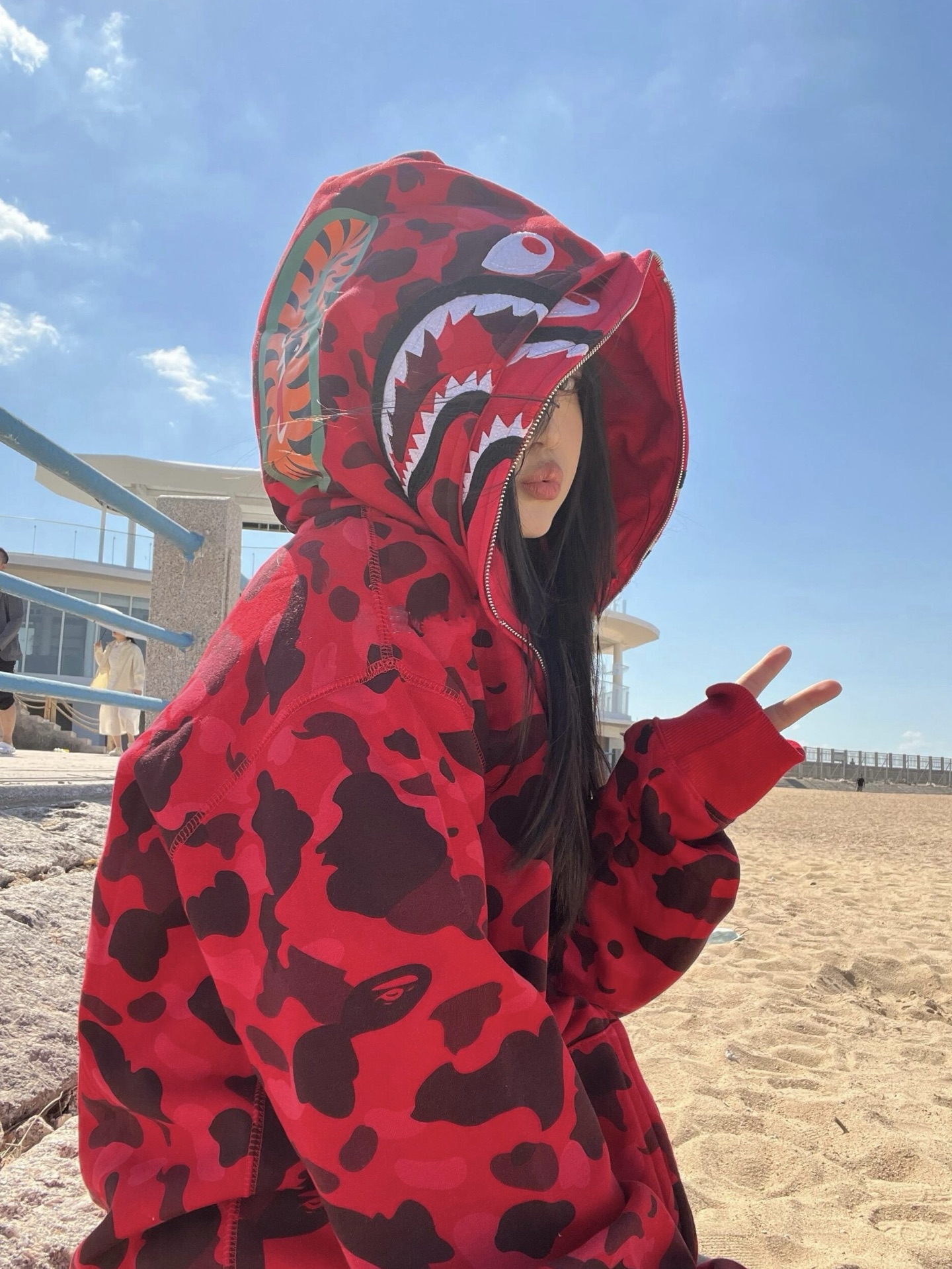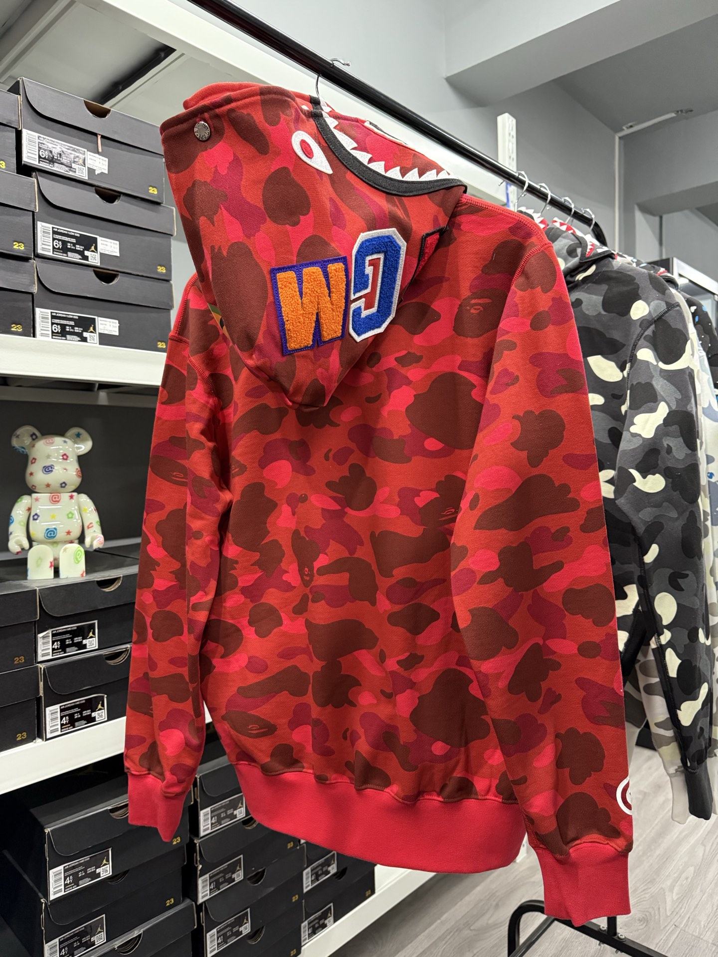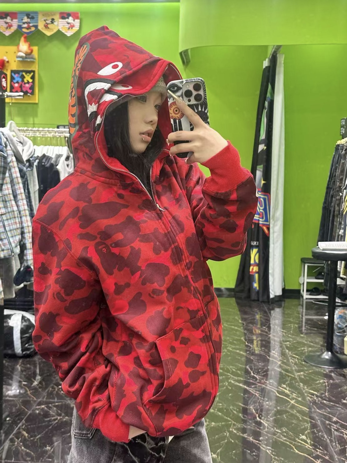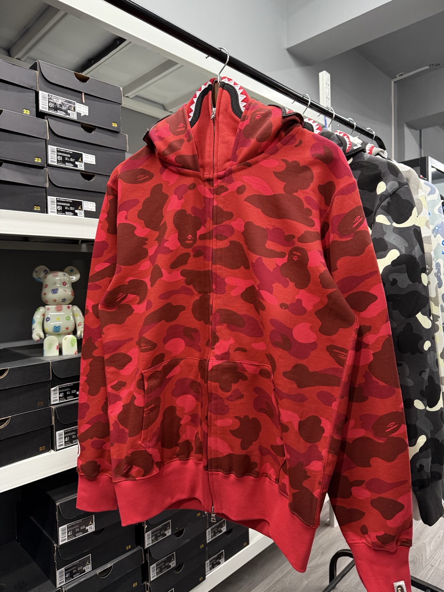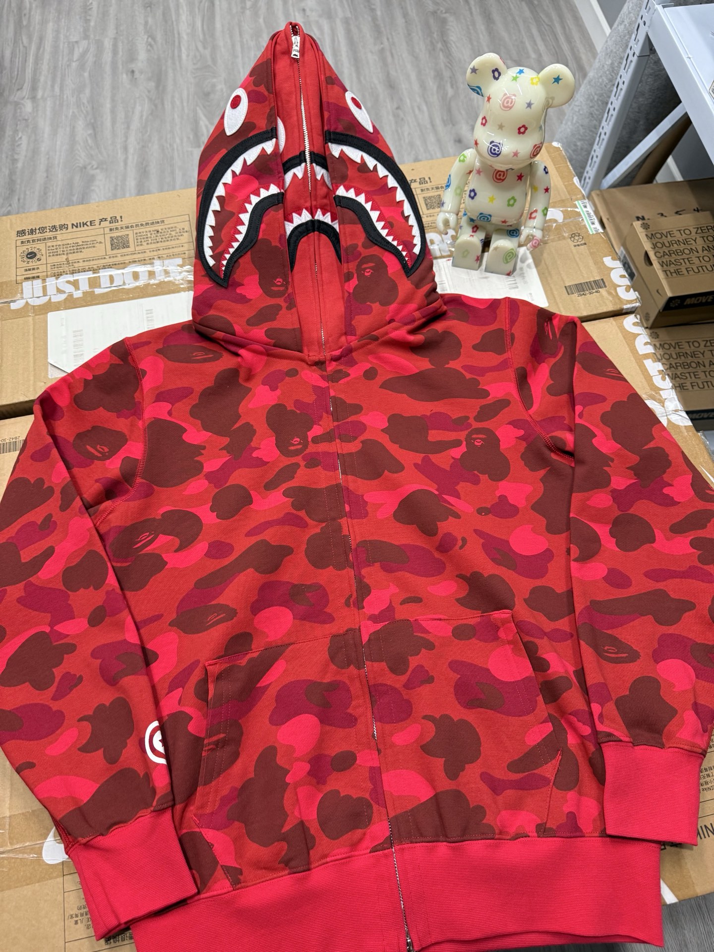 这款衣服是AAAAA 1:1 质量 (非常棒). 使用了和原版一模一样的材料. 商标部分也保持了和Bape一样. 图片拍摄是实物衣服拍摄, 您所收到的实物保证和我们图片一模一样.