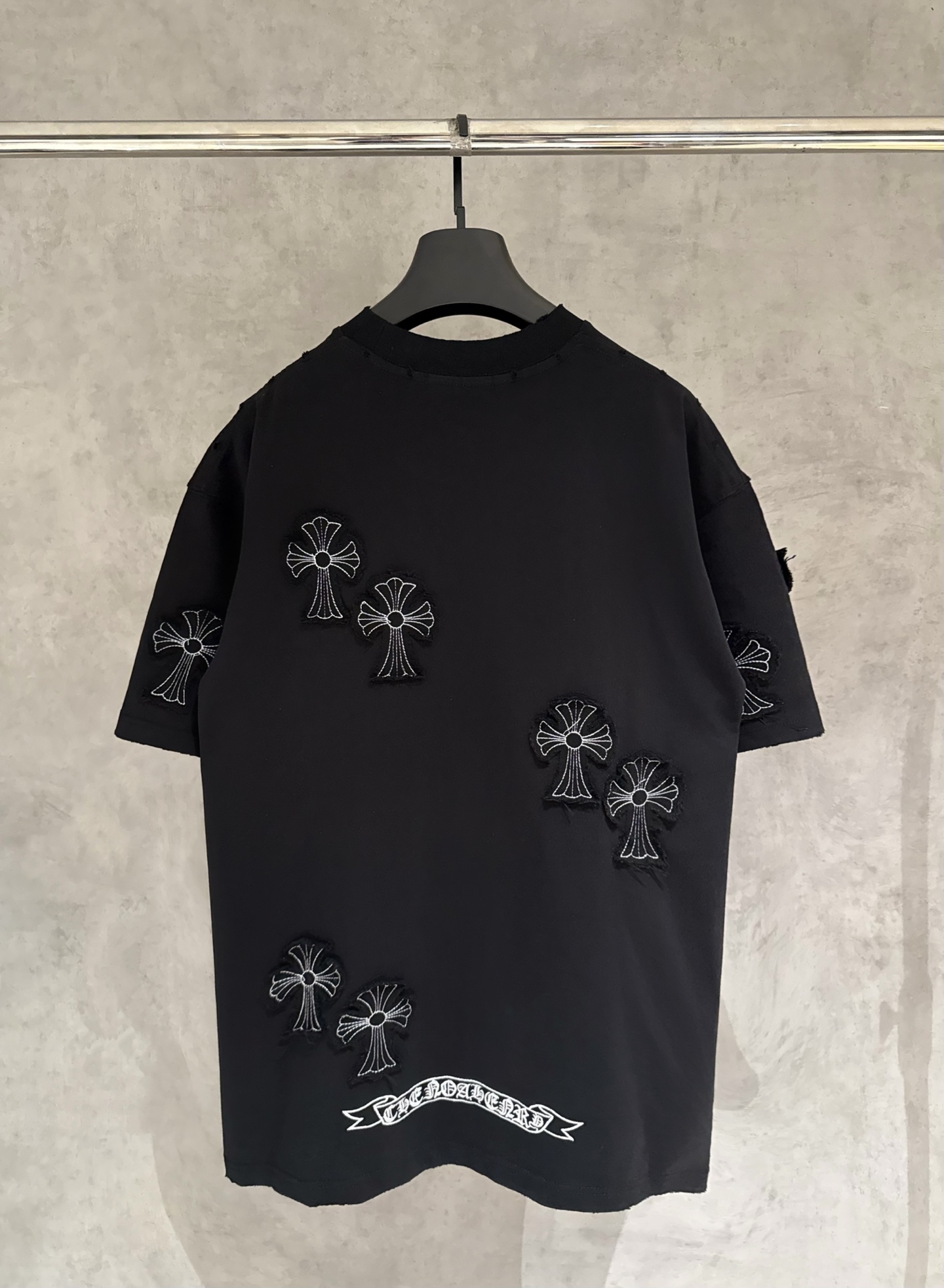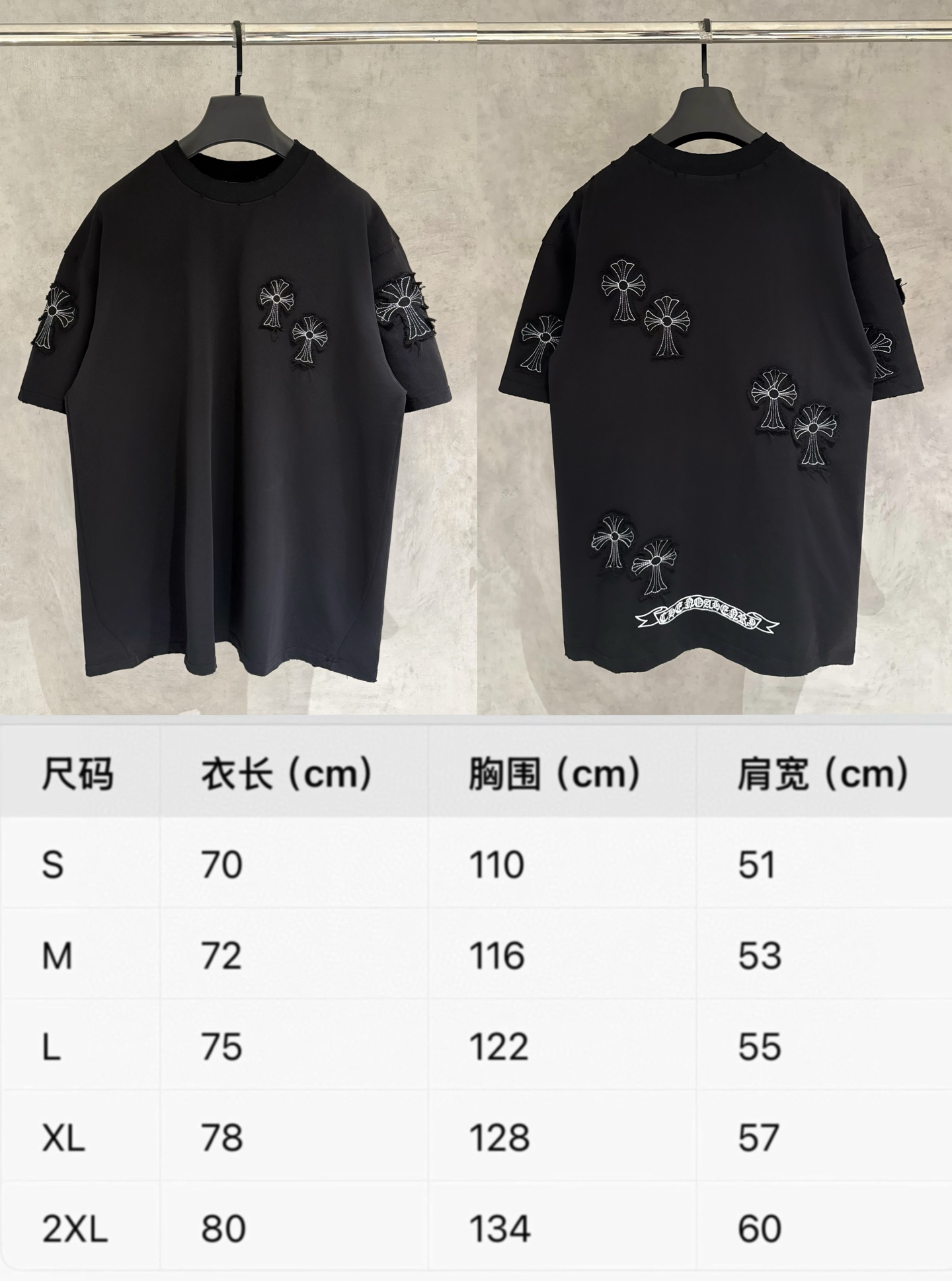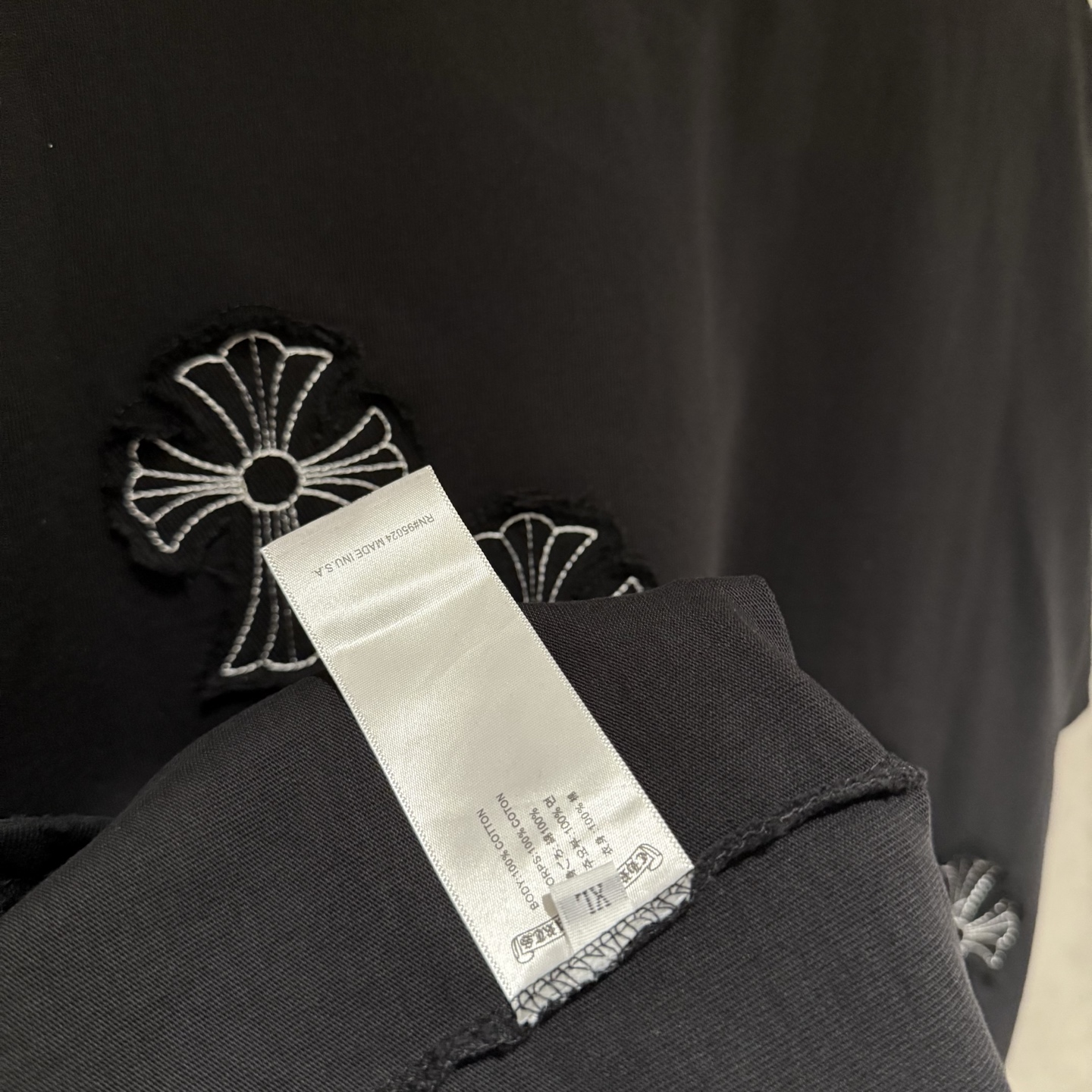 这款衣服是AAAAA 1:1 质量 (非常棒). 使用了和原版一模一样的材料. 商标部分也保持了和克罗心/Chrome Hearts一样. 图片拍摄是实物衣服拍摄, 您所收到的实物保证和我们图片一模一样.