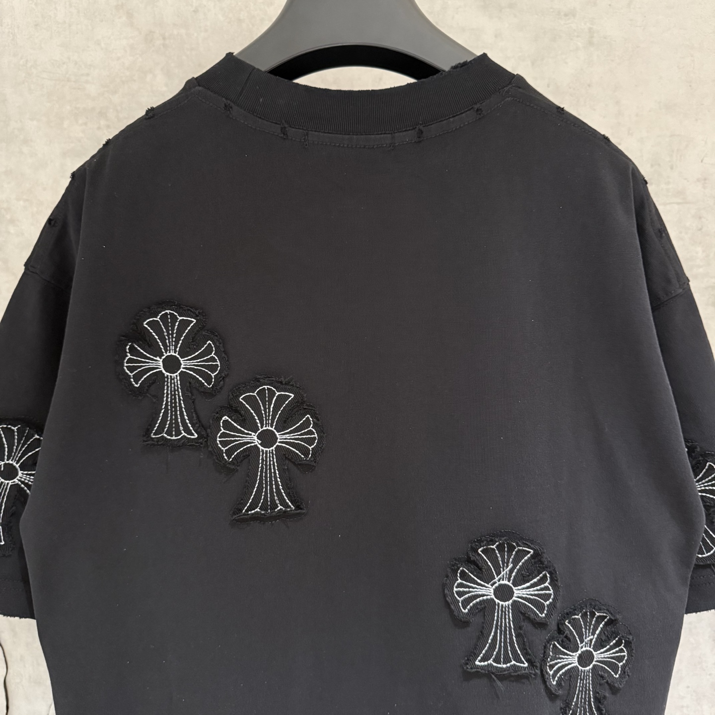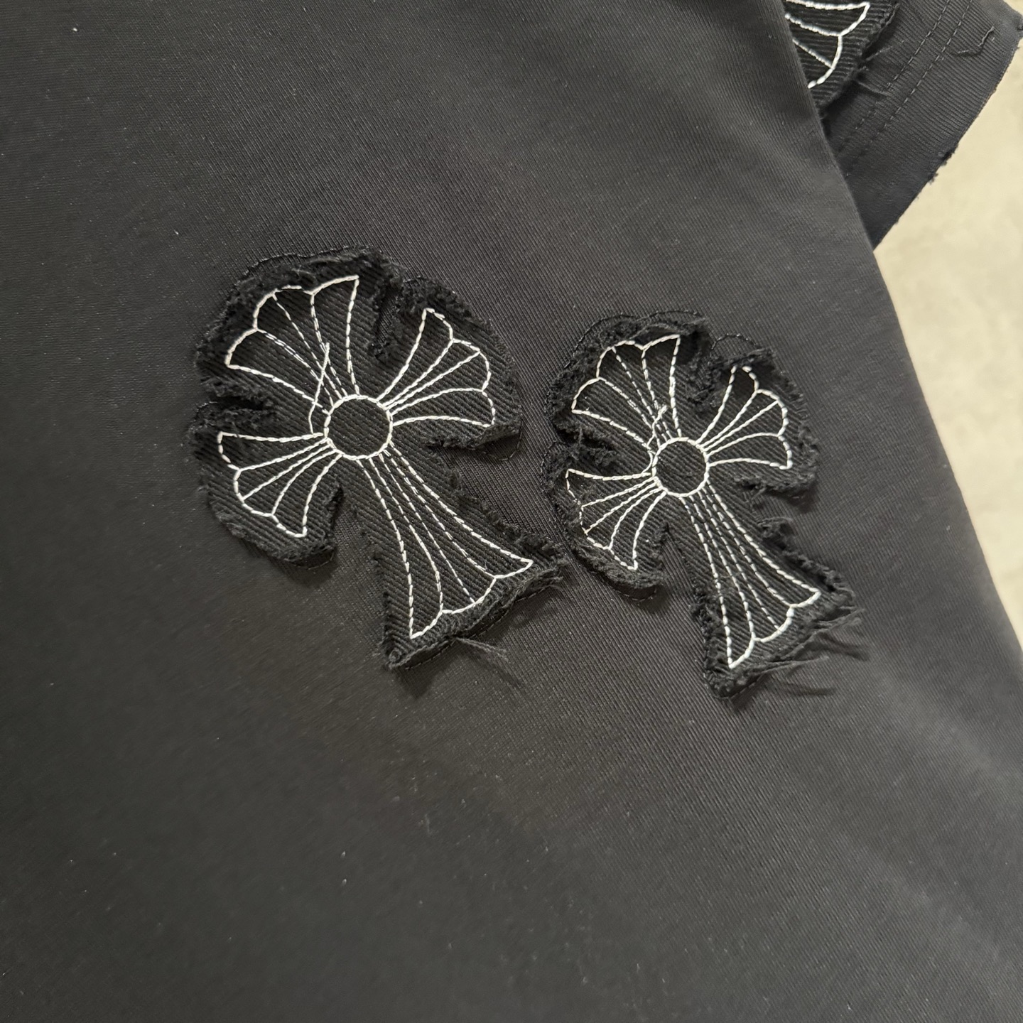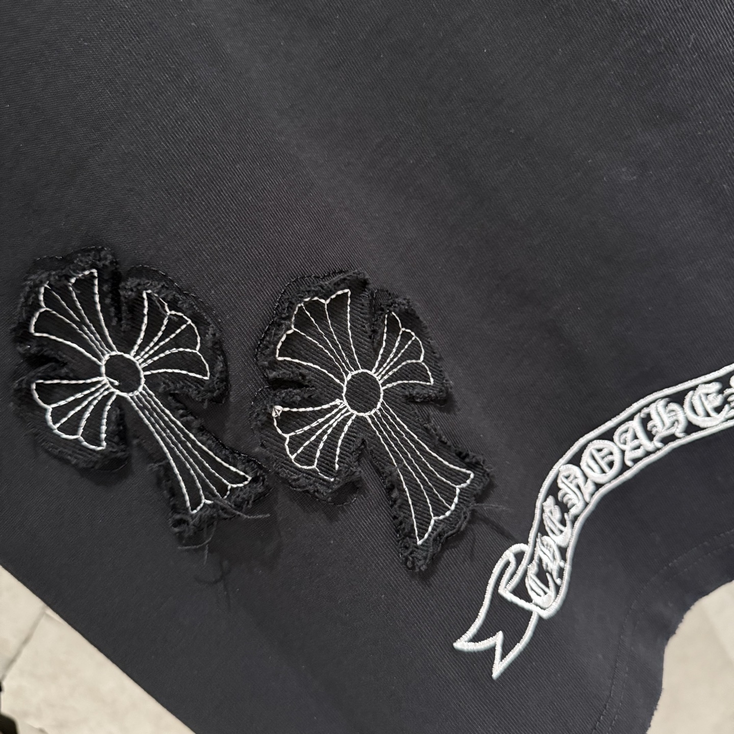 这款衣服是AAAAA 1:1 质量 (非常棒). 使用了和原版一模一样的材料. 商标部分也保持了和克罗心/Chrome Hearts一样. 图片拍摄是实物衣服拍摄, 您所收到的实物保证和我们图片一模一样.