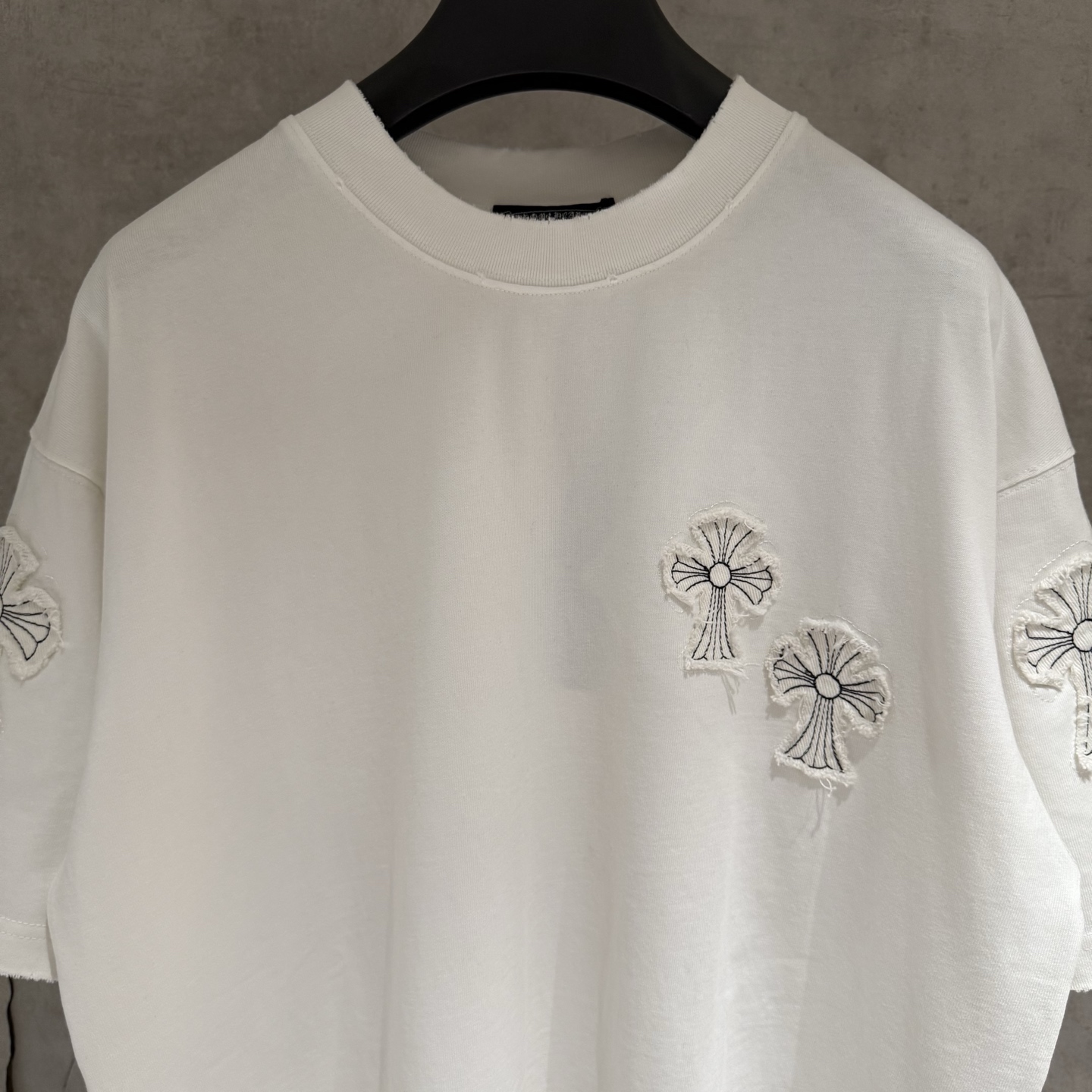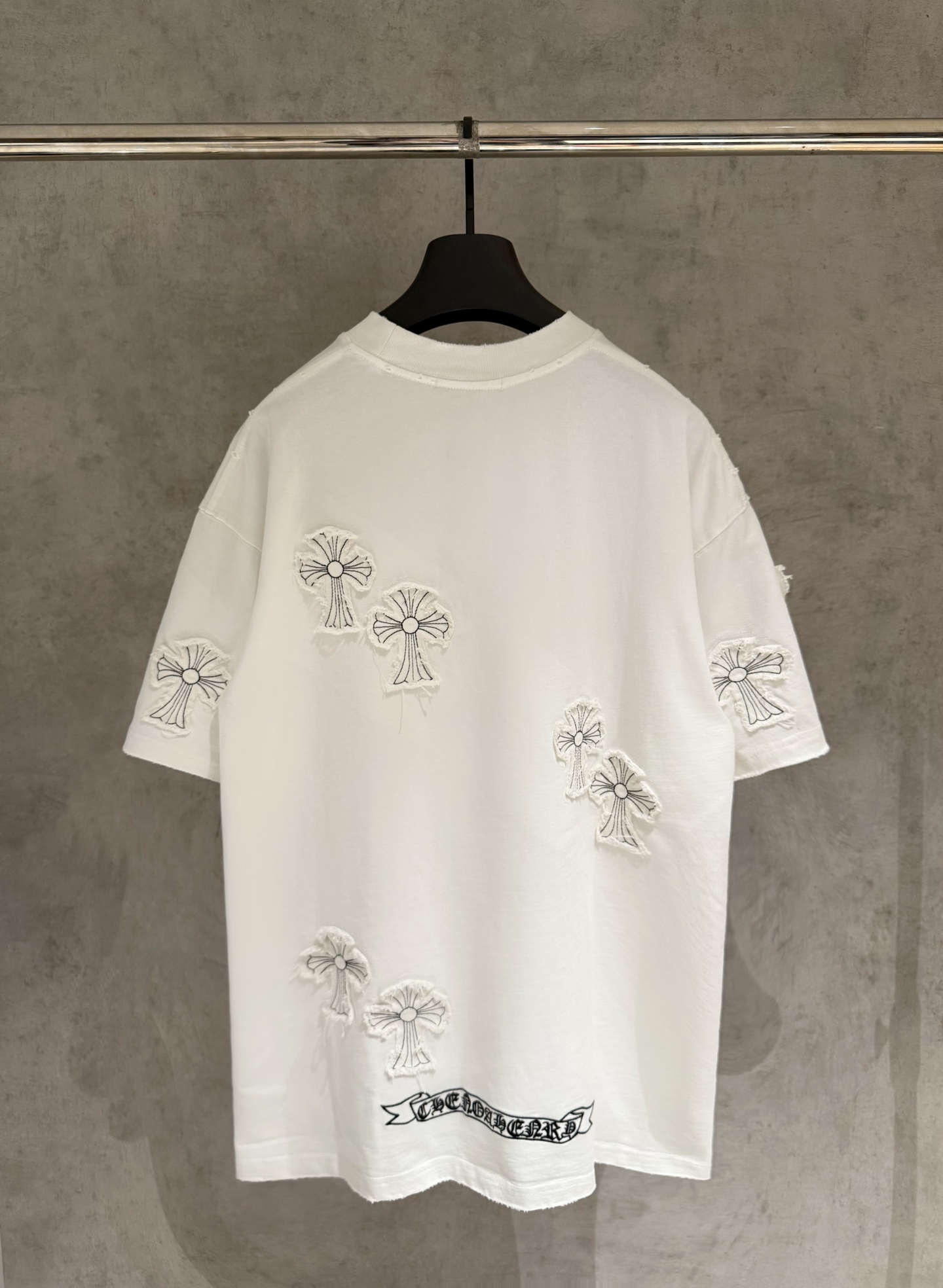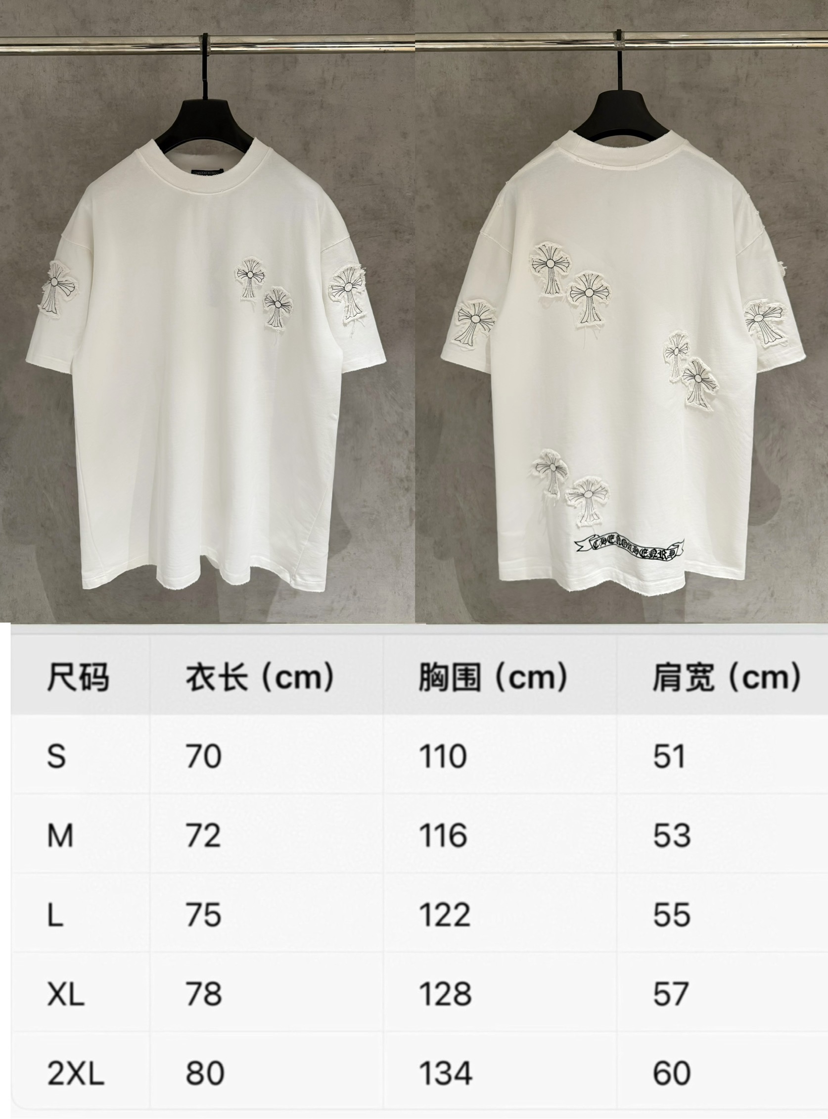 这款衣服是AAAAA 1:1 质量 (非常棒). 使用了和原版一模一样的材料. 商标部分也保持了和克罗心/Chrome Hearts一样. 图片拍摄是实物衣服拍摄, 您所收到的实物保证和我们图片一模一样.