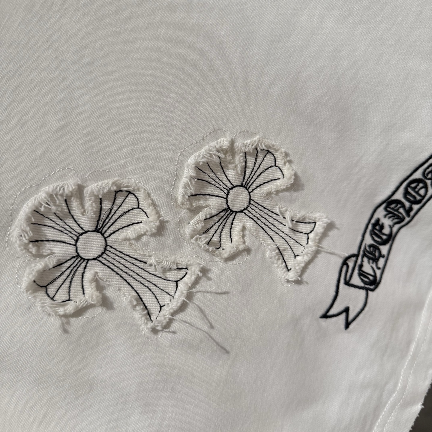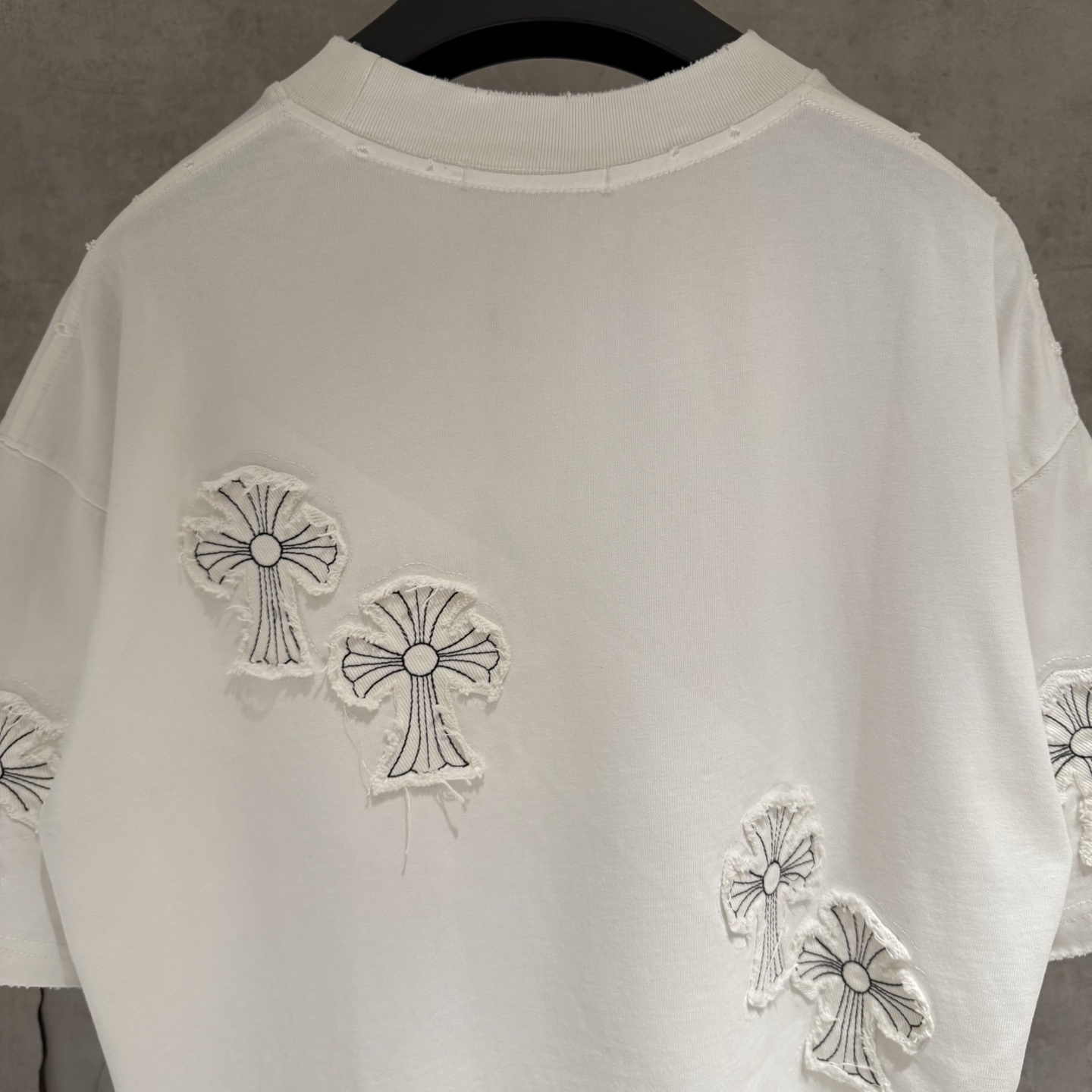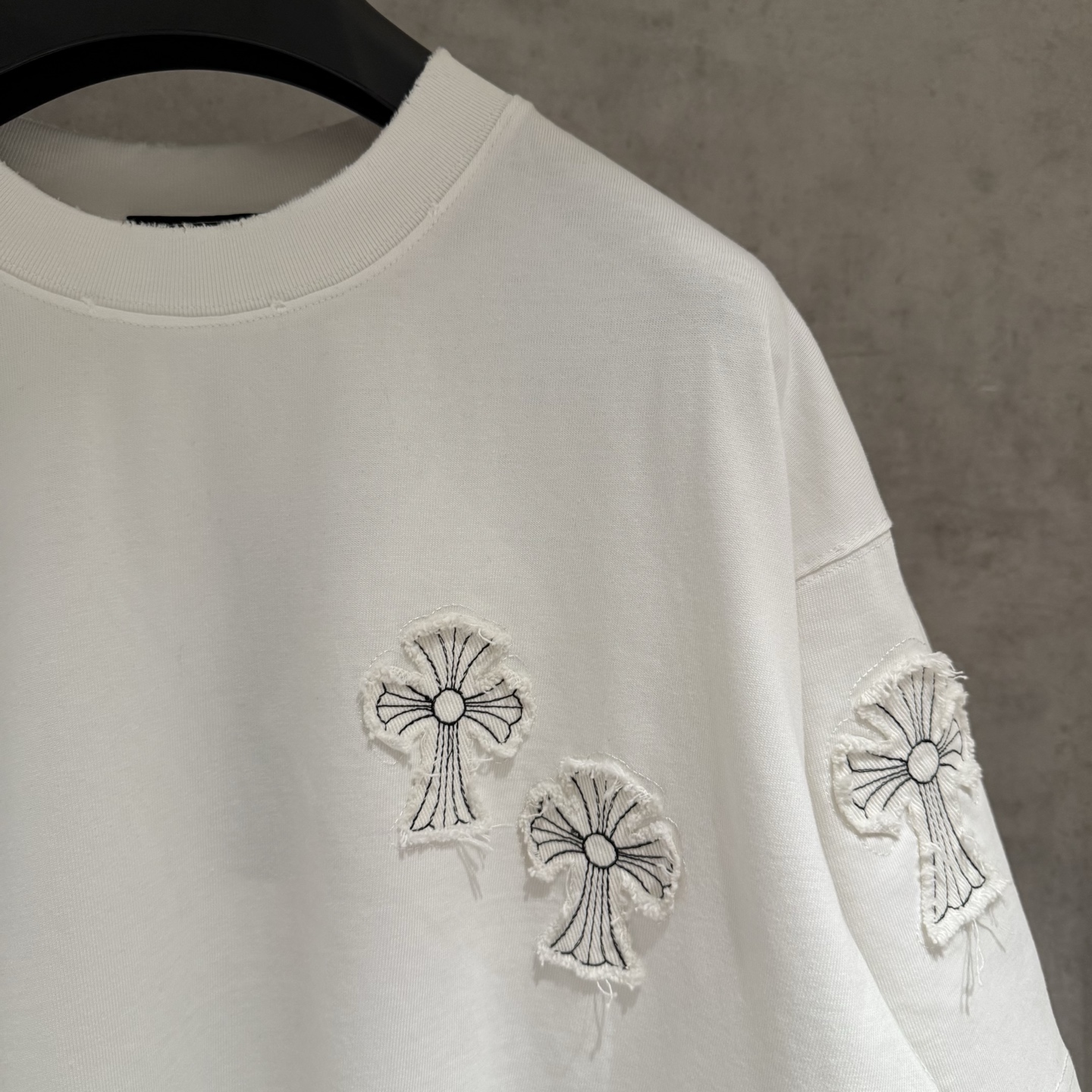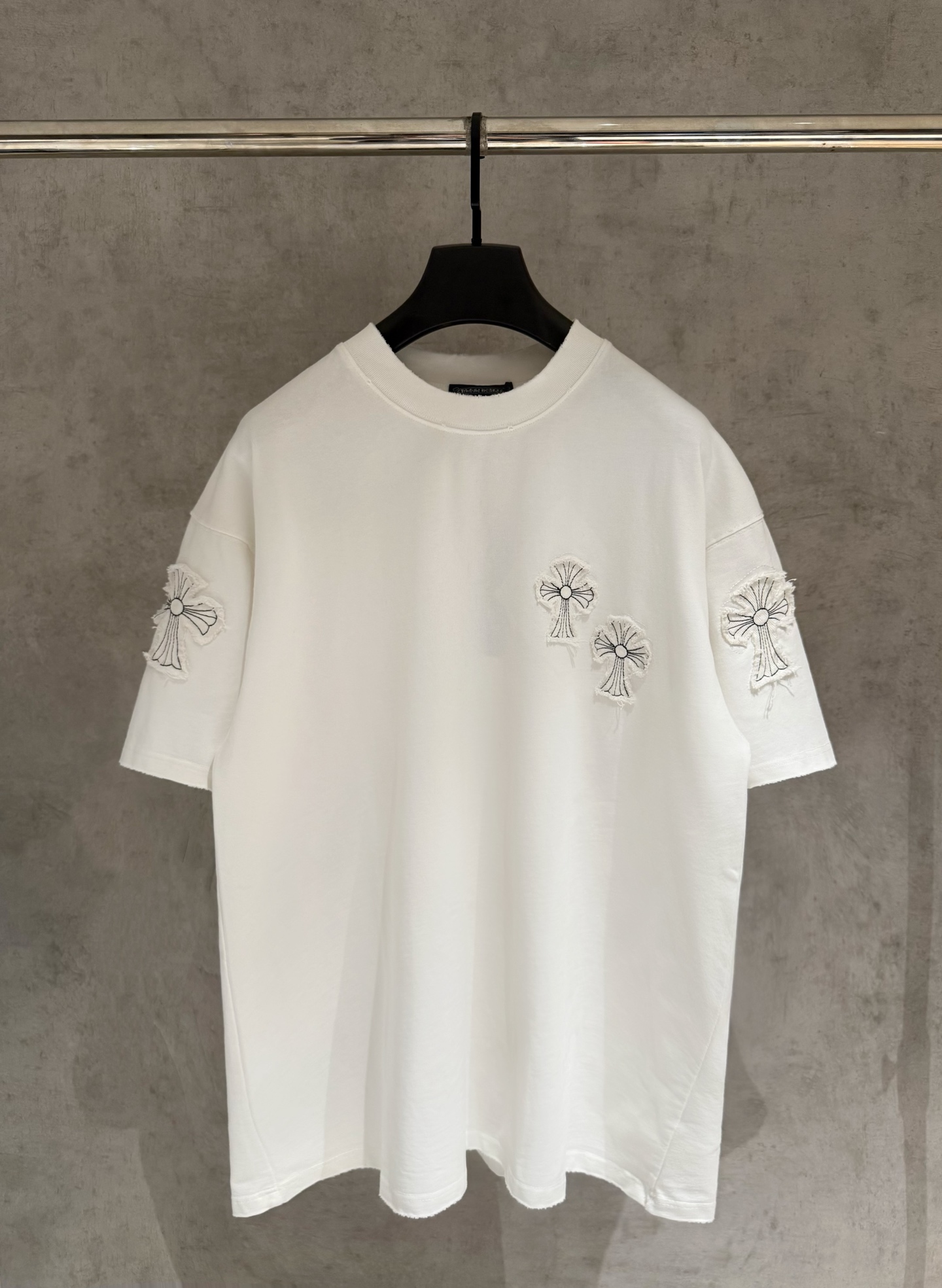 这款衣服是AAAAA 1:1 质量 (非常棒). 使用了和原版一模一样的材料. 商标部分也保持了和克罗心/Chrome Hearts一样. 图片拍摄是实物衣服拍摄, 您所收到的实物保证和我们图片一模一样.