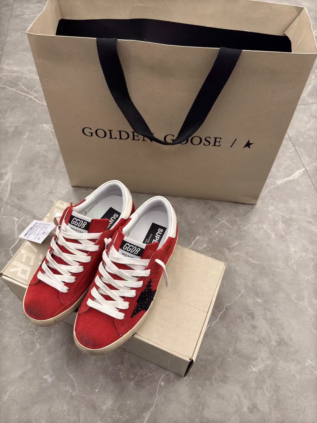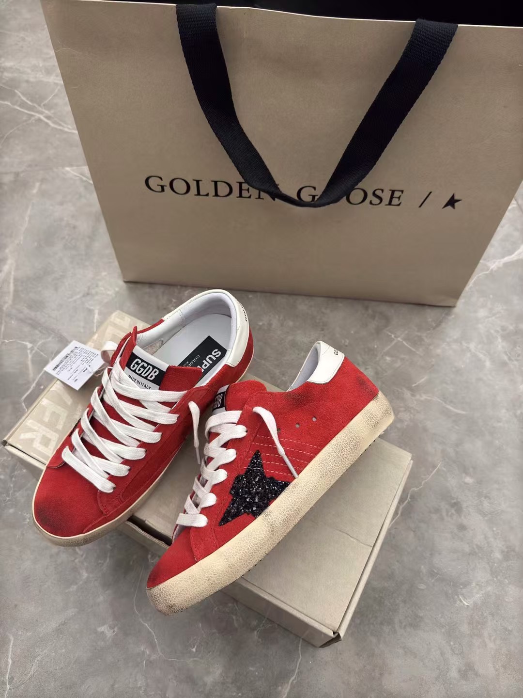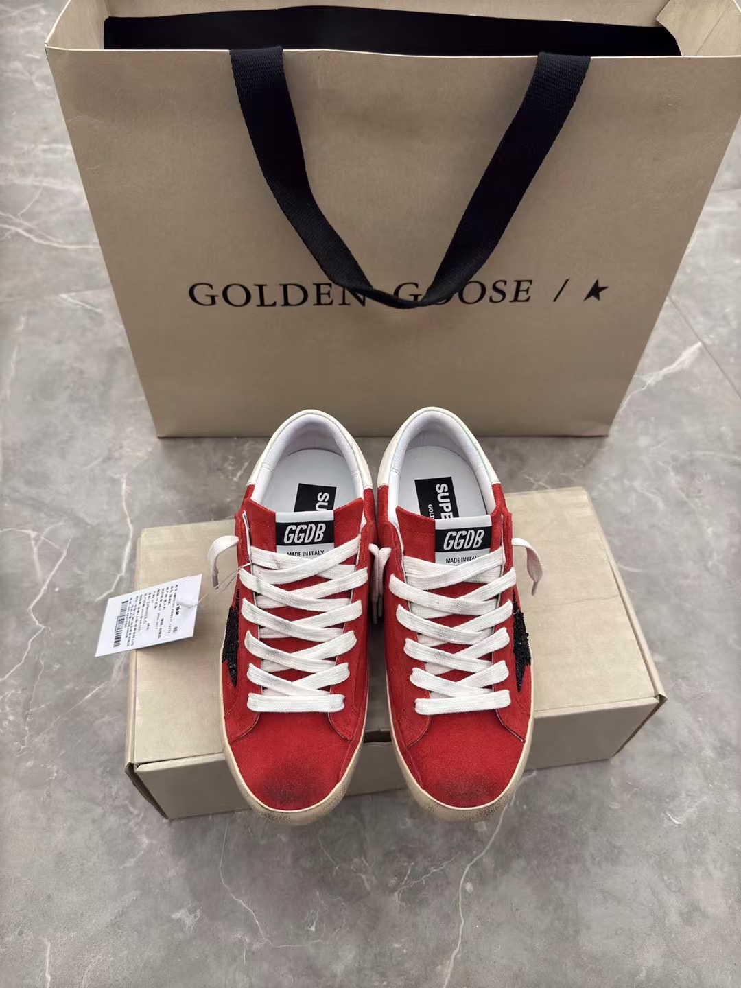 这款鞋子是AAAAA 1:1 质量 (非常棒). 使用了和原版一模一样的材料. 商标部分也保持了和Golden Goose一样. 图片拍摄是实物鞋子拍摄, 您所收到的实物保证和我们图片一模一样.