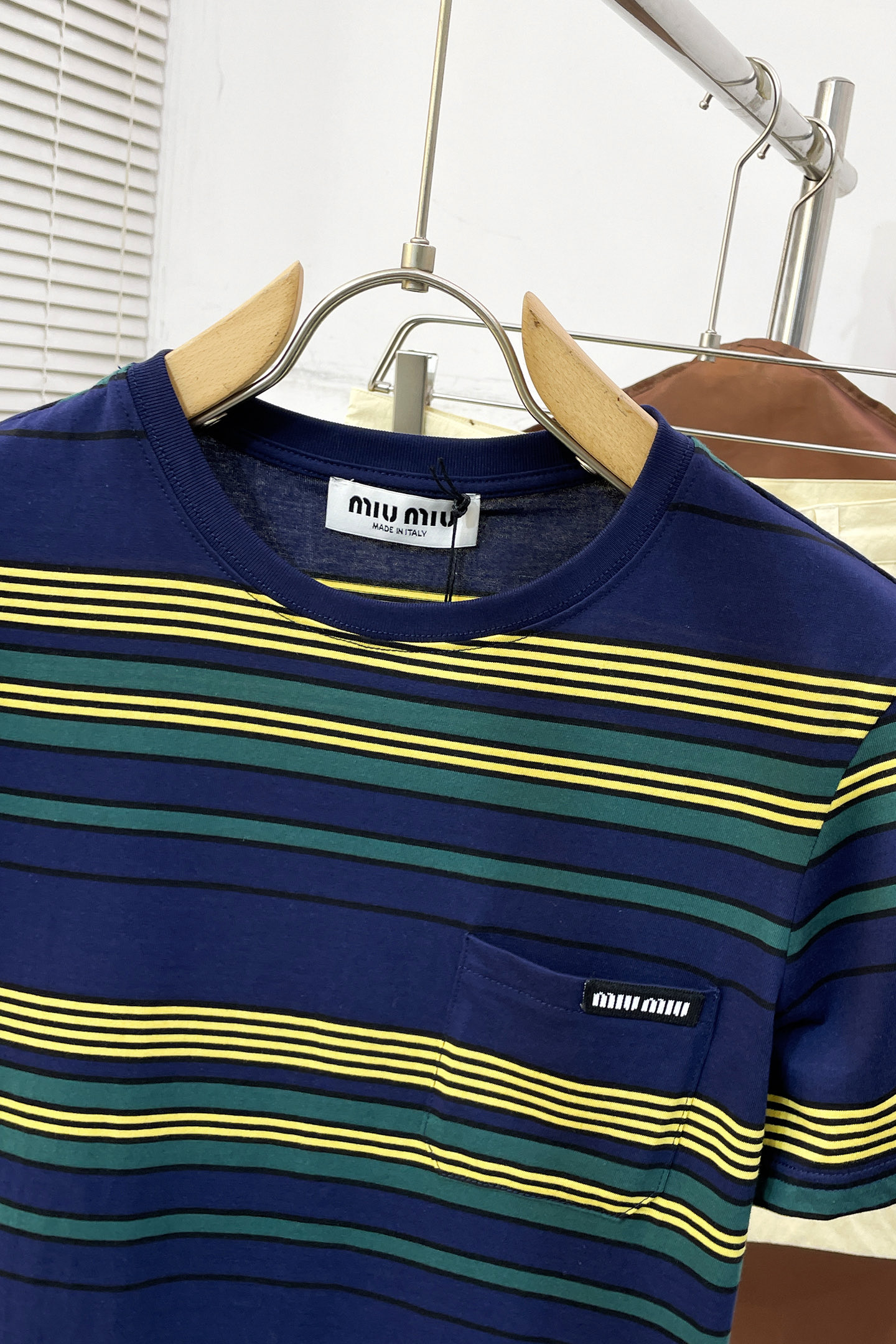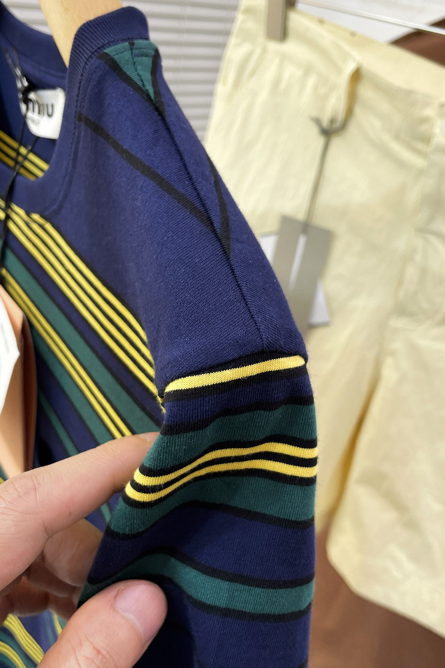 这款衣服是AAAAA 1:1 质量 (非常棒). 使用了和原版一模一样的材料. 商标部分也保持了和缪缪/Miu Miu一样. 图片拍摄是实物衣服拍摄, 您所收到的实物保证和我们图片一模一样.