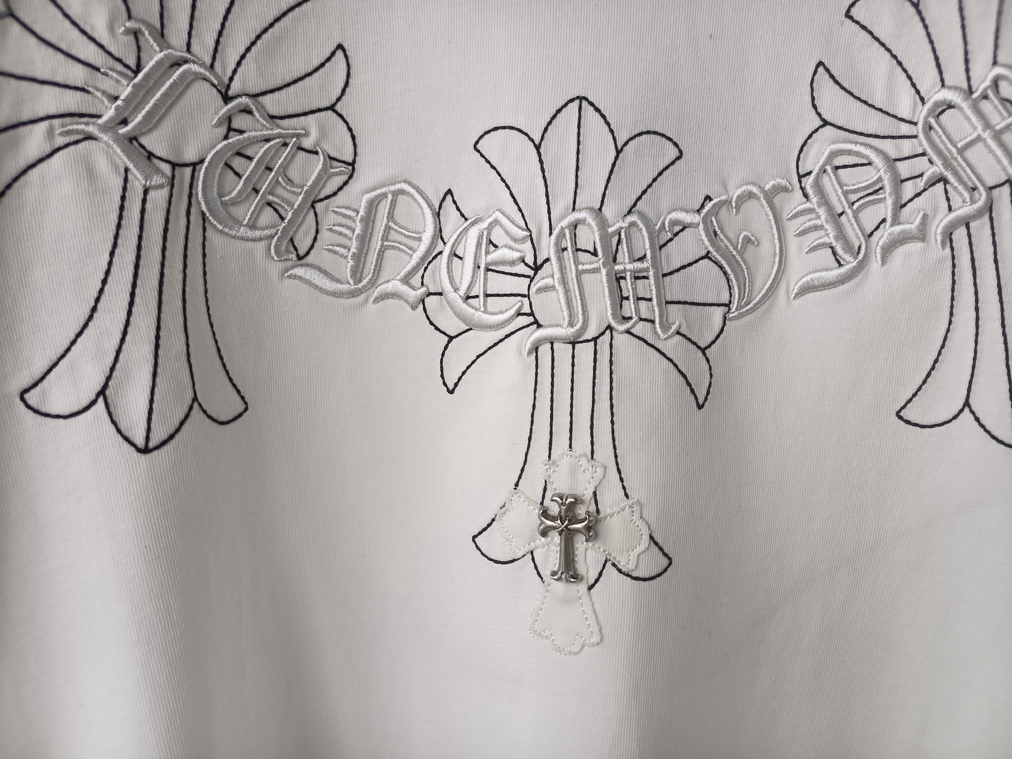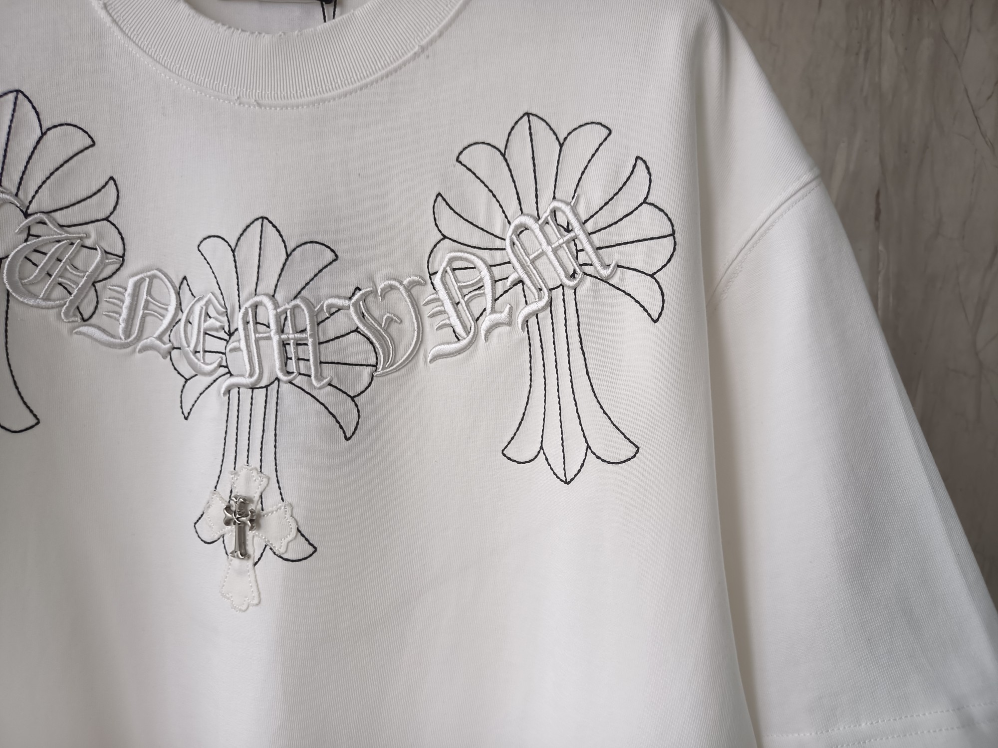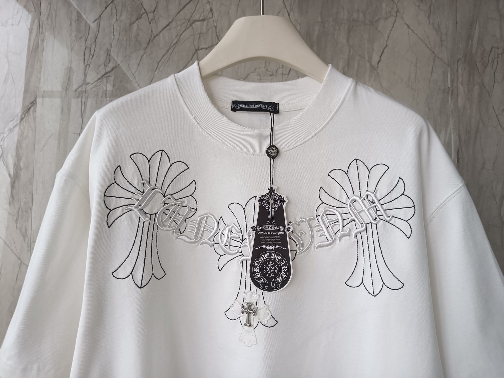这款衣服是AAAAA 1:1 质量 (非常棒). 使用了和原版一模一样的材料. 商标部分也保持了和克罗心/Chrome Hearts一样. 图片拍摄是实物衣服拍摄, 您所收到的实物保证和我们图片一模一样.