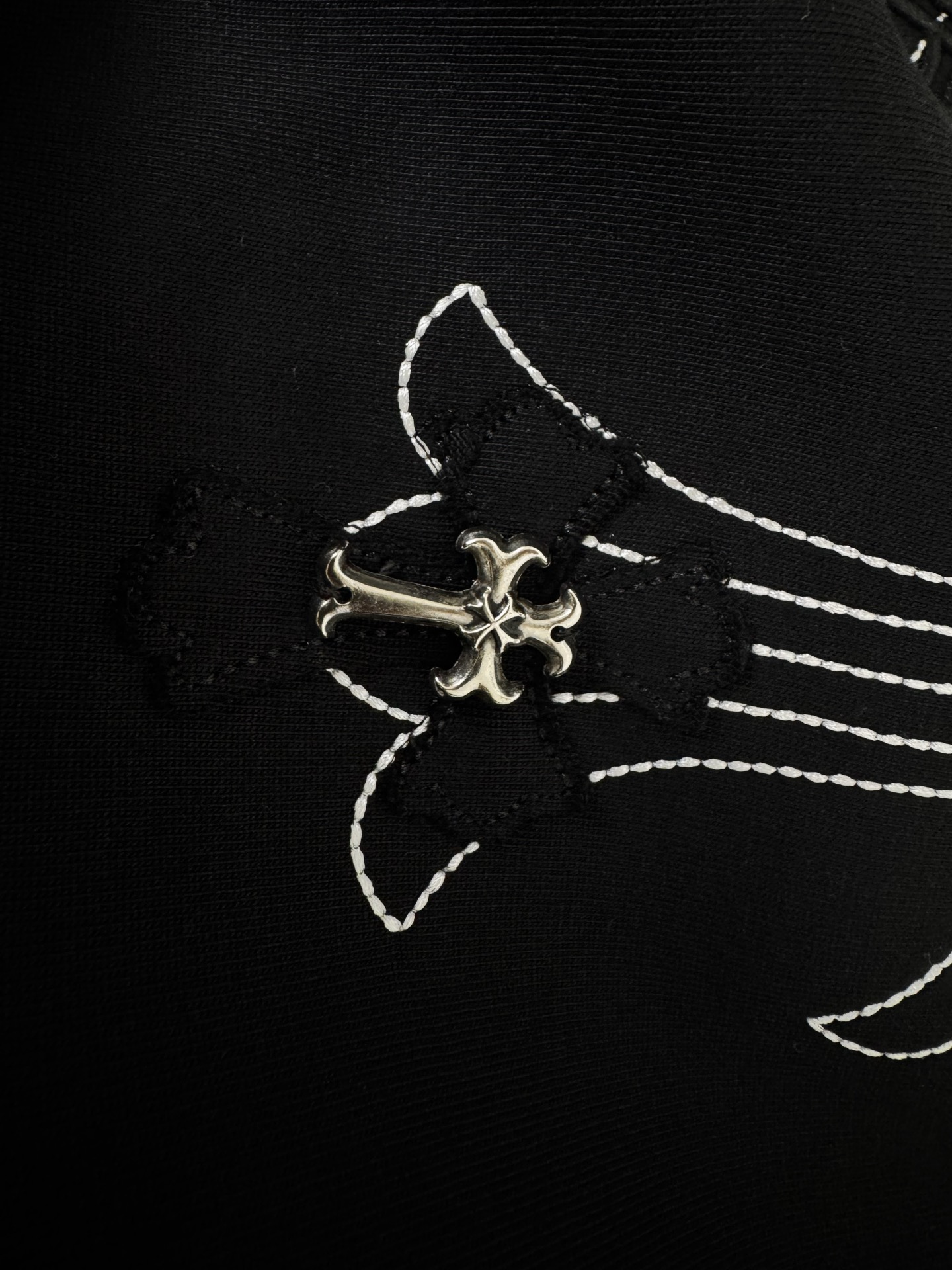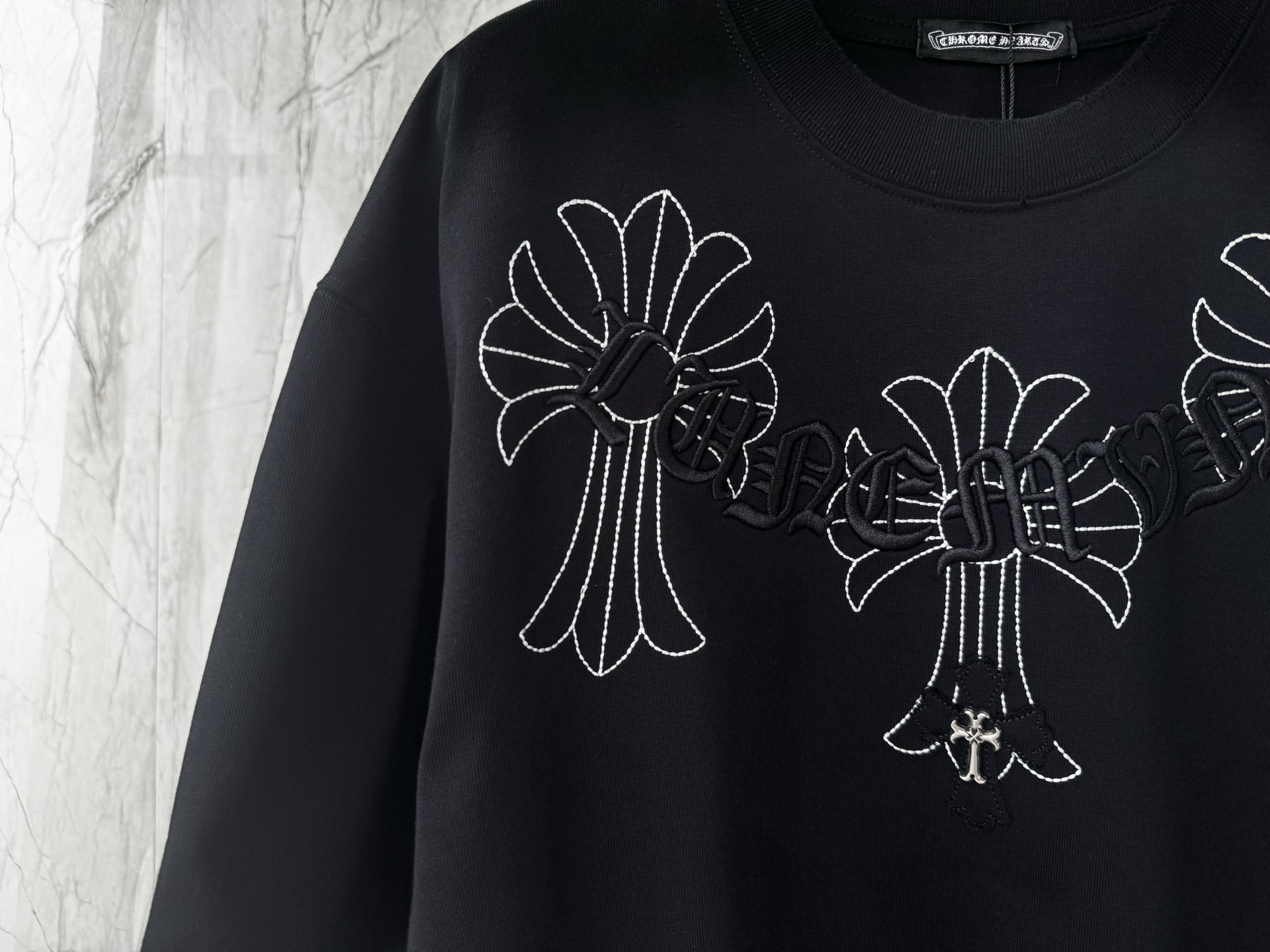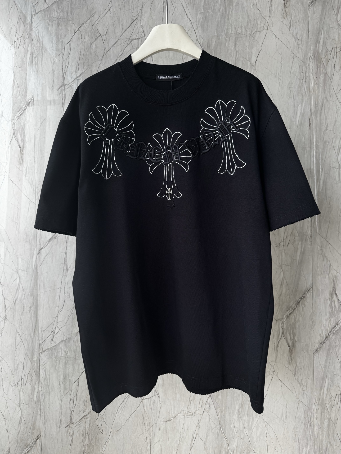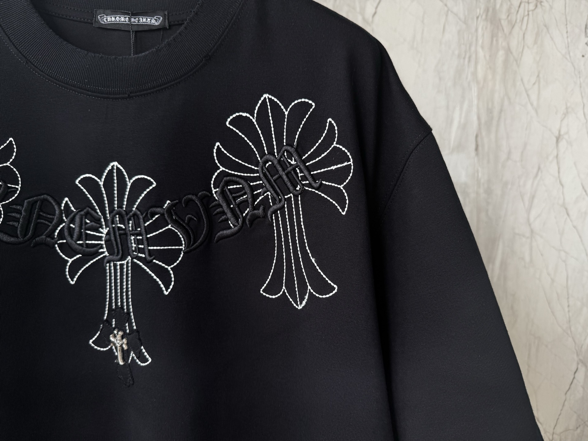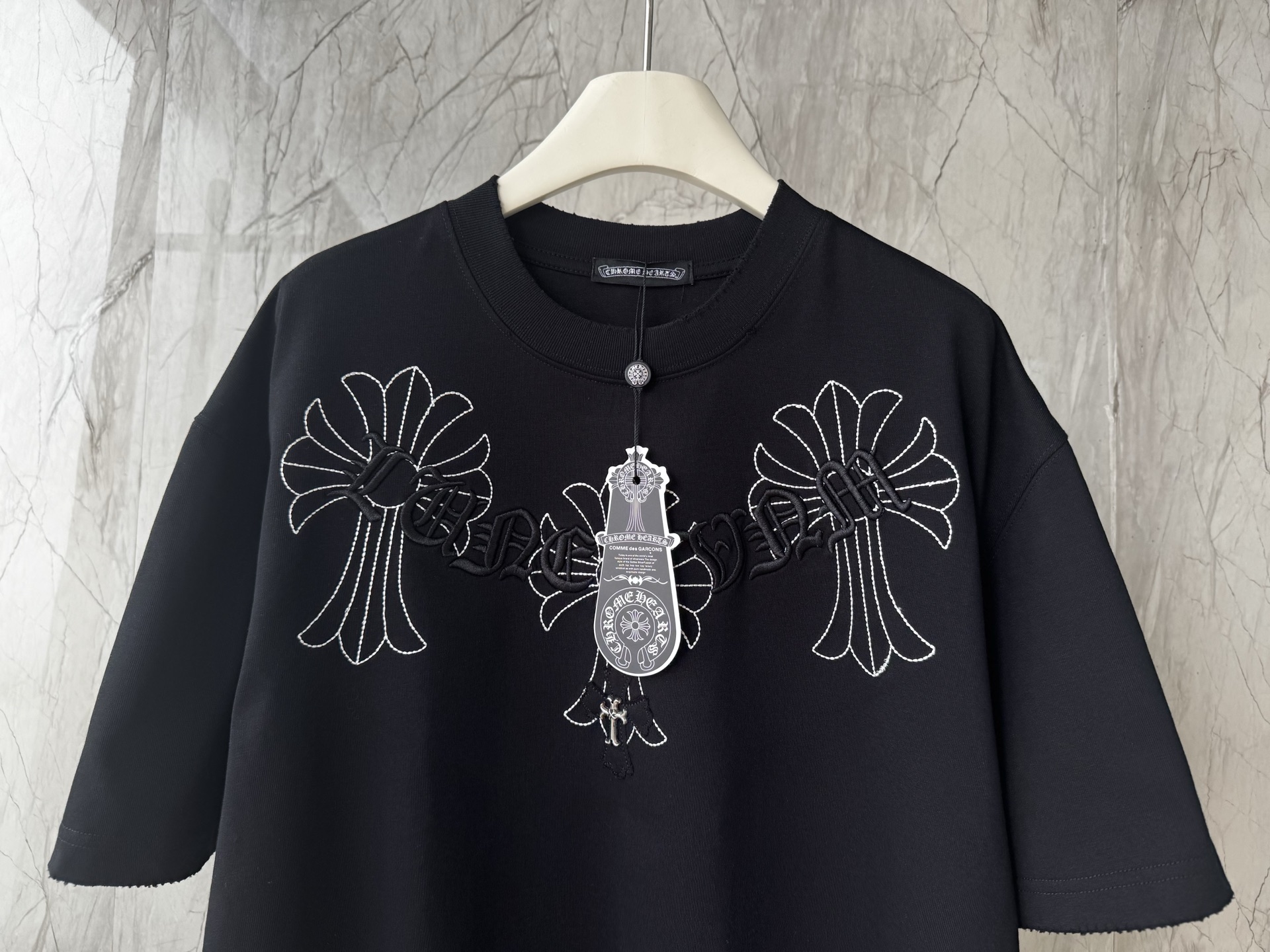 这款衣服是AAAAA 1:1 质量 (非常棒). 使用了和原版一模一样的材料. 商标部分也保持了和克罗心/Chrome Hearts一样. 图片拍摄是实物衣服拍摄, 您所收到的实物保证和我们图片一模一样.