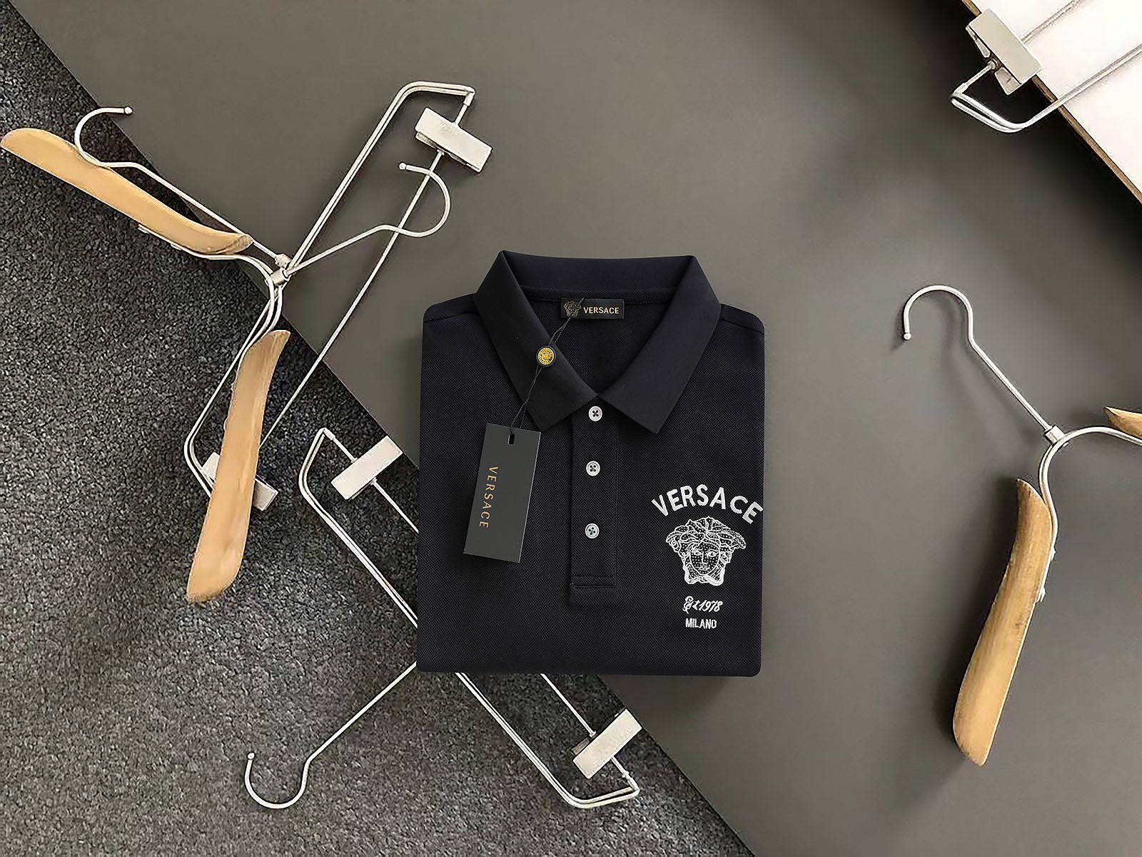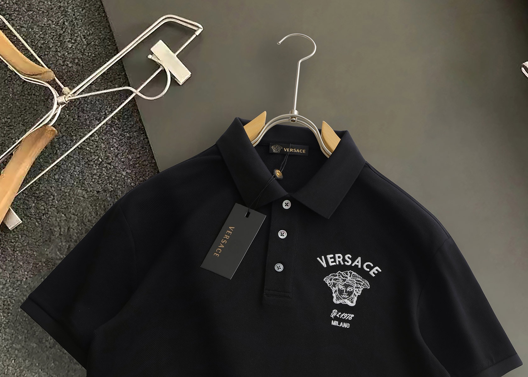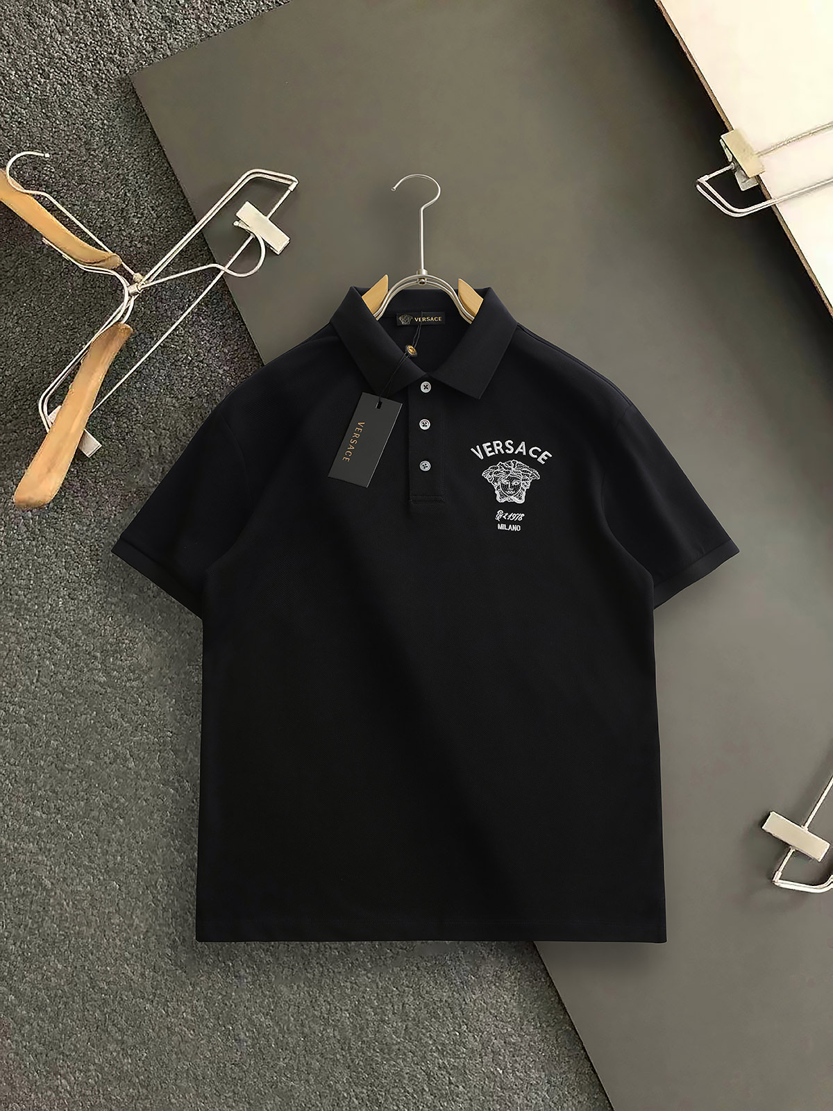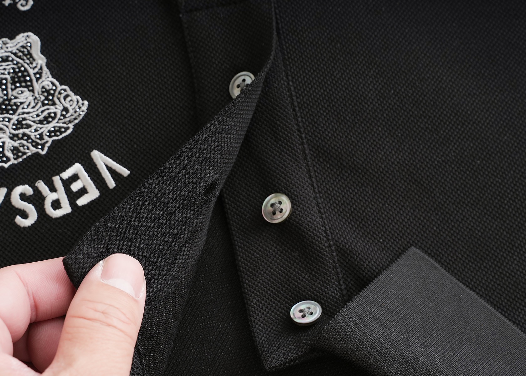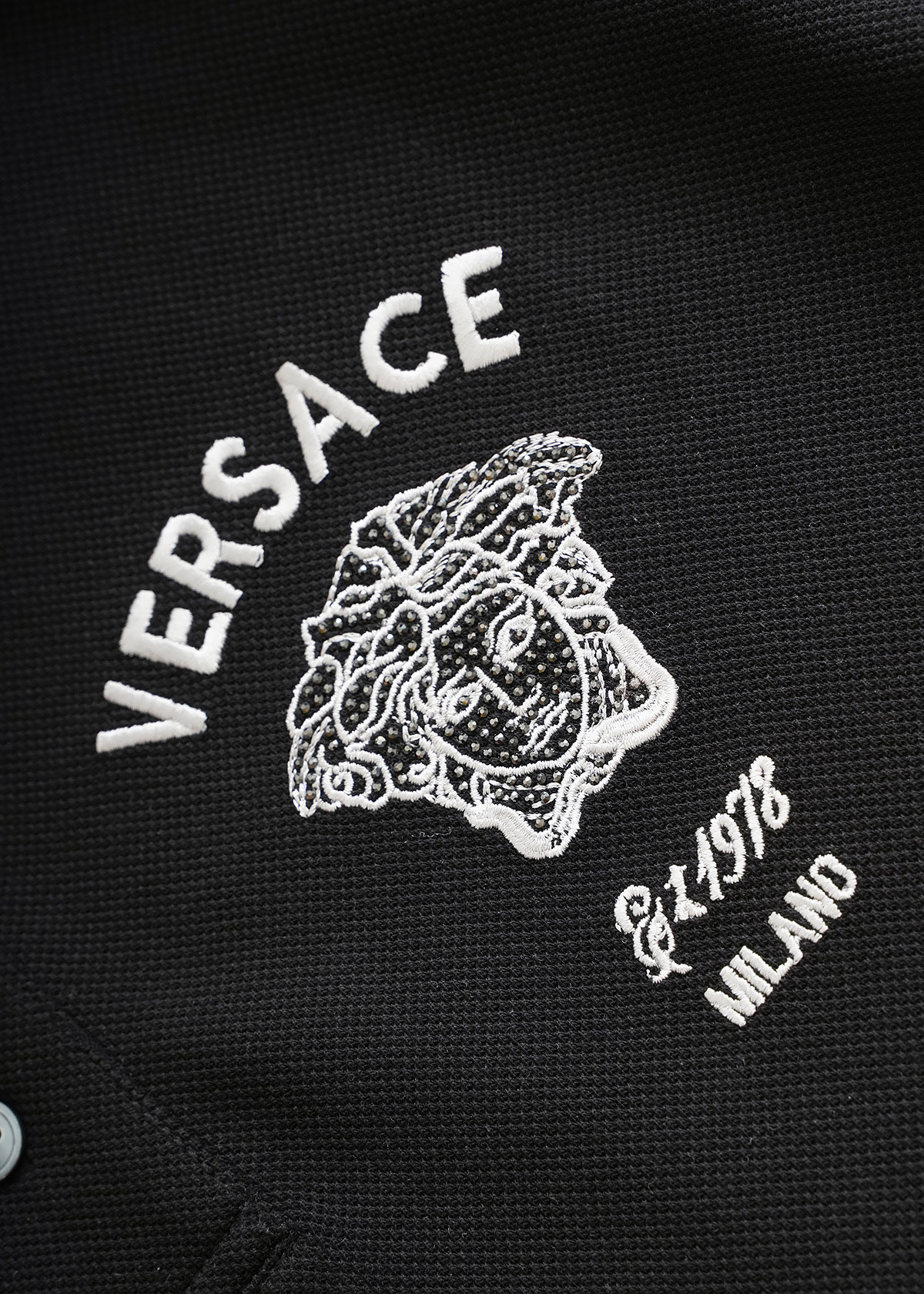这款衣服是AAAAA 1:1 质量 (非常棒). 使用了和原版一模一样的材料. 商标部分也保持了和范思哲/Versace一样. 图片拍摄是实物衣服拍摄, 您所收到的实物保证和我们图片一模一样.