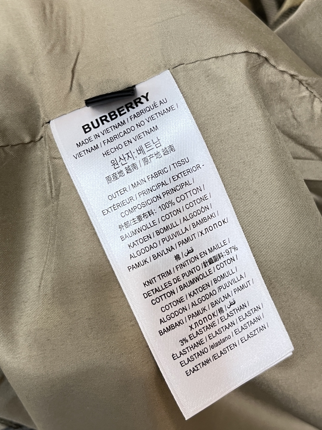 这款衣服是AAAAA 1:1 质量 (非常棒). 使用了和原版一模一样的材料. 商标部分也保持了和巴宝莉/Burberry一样. 图片拍摄是实物衣服拍摄, 您所收到的实物保证和我们图片一模一样.